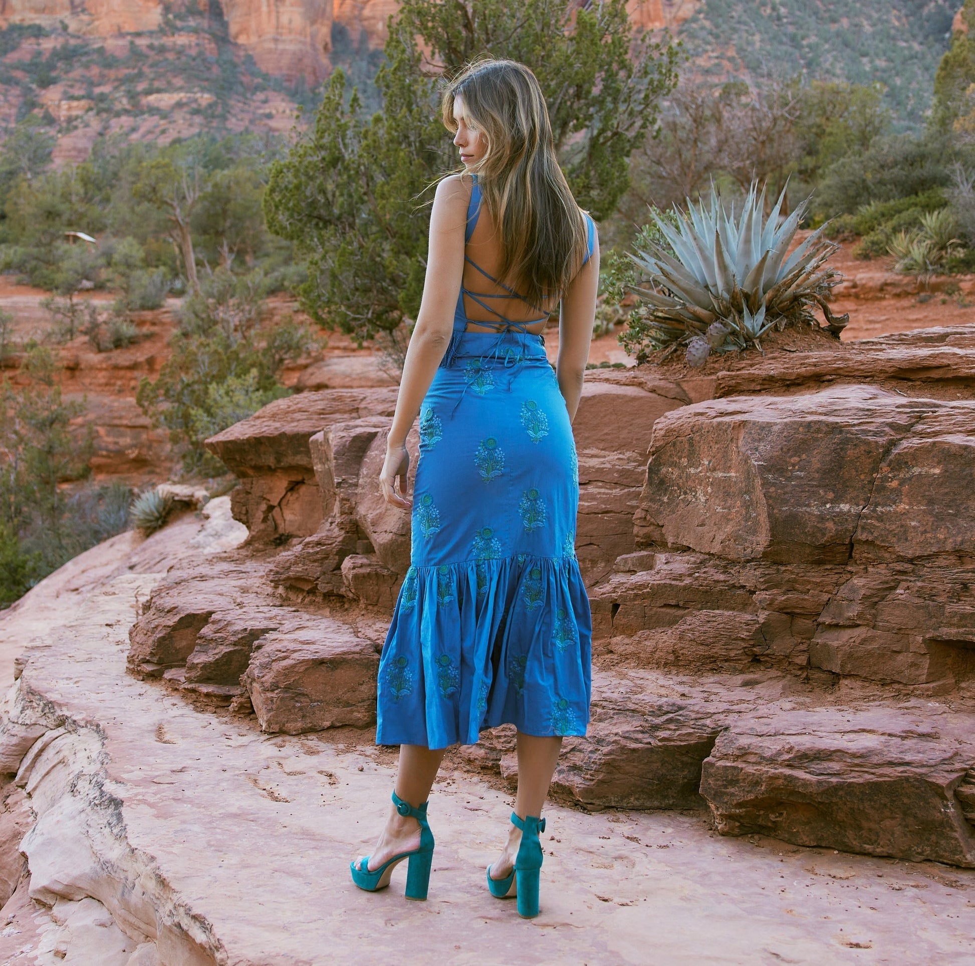 Brook Embroidered Fluted Skirt - Prussian Blue/Placed Floral Embroidery
