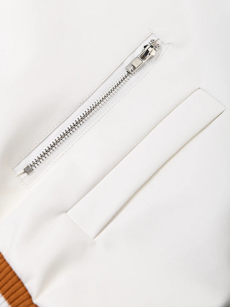 Straight from the streets of Soho, this Color-block Jacket is the perfect piece for those who seek a modern and bold style. While its name suggests "PU leather," this garment is crafted from a luxurious blend of chenille and spandex, offering the look of a leather jacket with unmatched softness and flexibility. Its distinctive striped color-block design, in a sleek white, is a fashion statement all on its own.