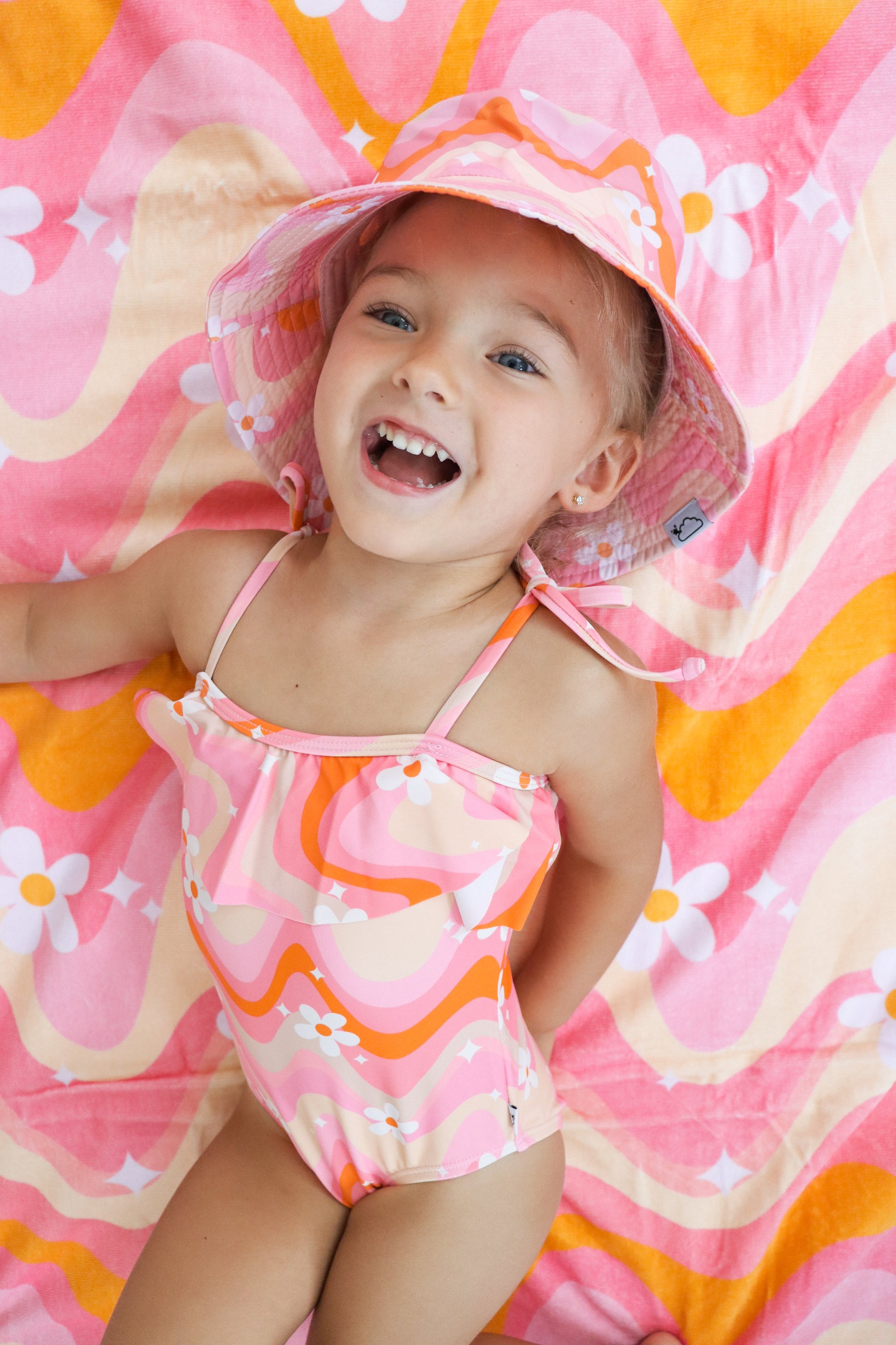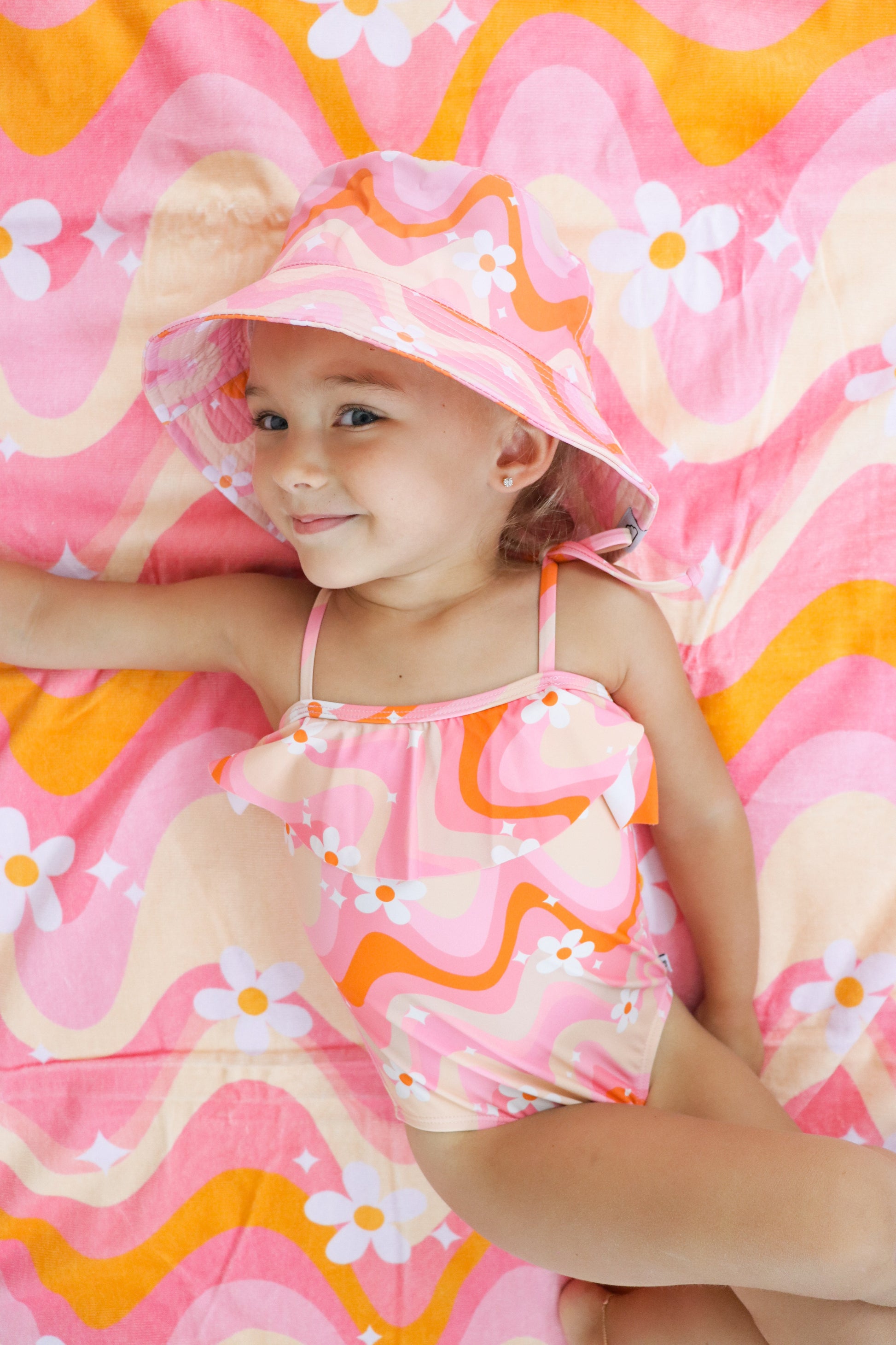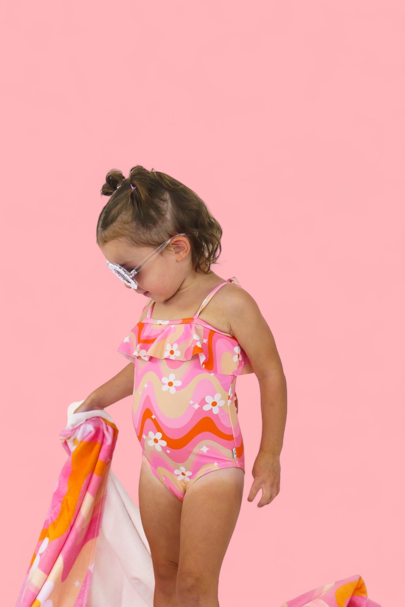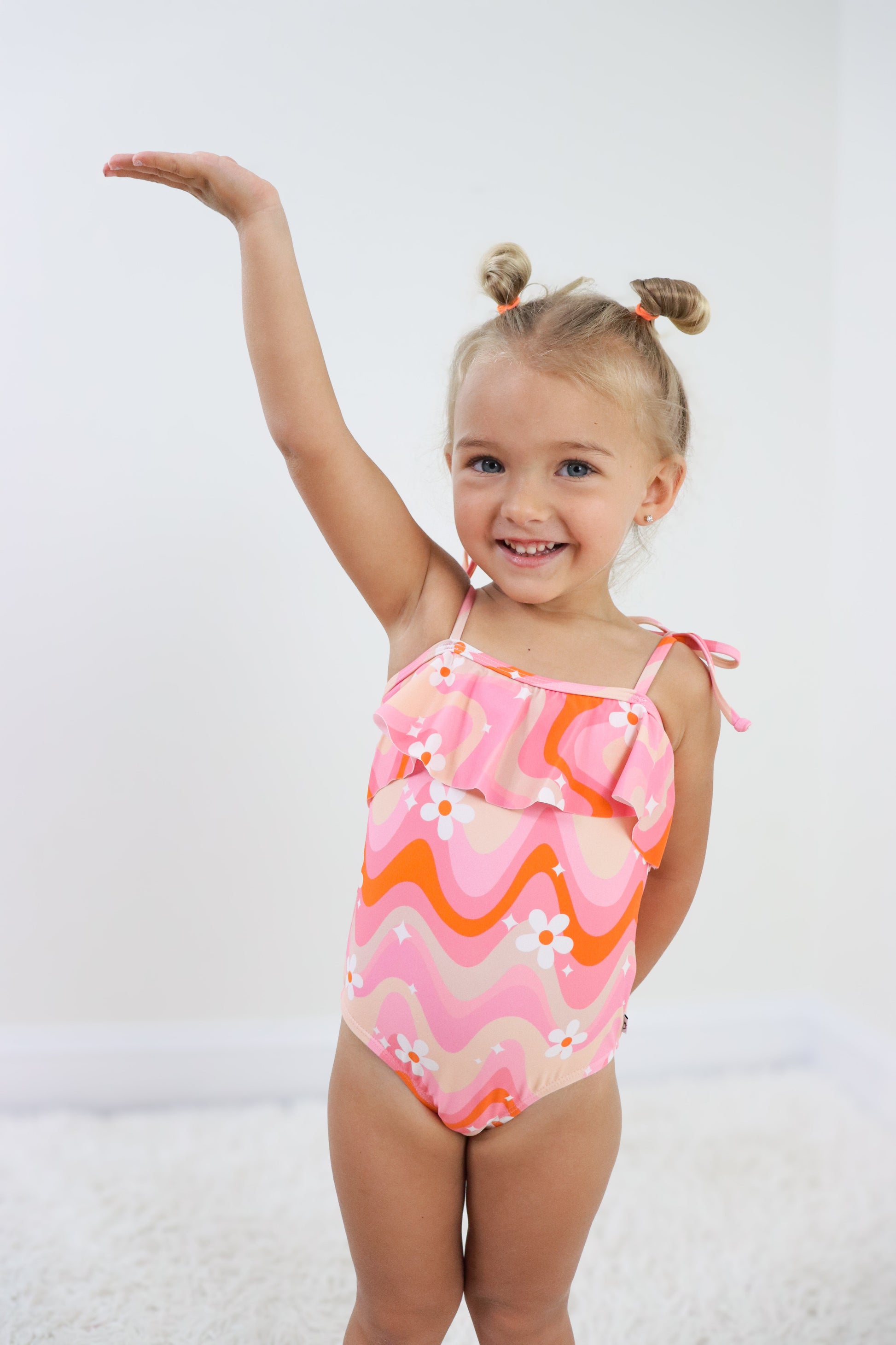 Ready for sunshine and waves? The Dream Swim Suit will make your little one feel like a real-life fashionista! A bow on each side gives it a fun finish, while the long sleeves will keep your explorer protected. The ruffled bottom completes the look and will have them making a splash all summer long!