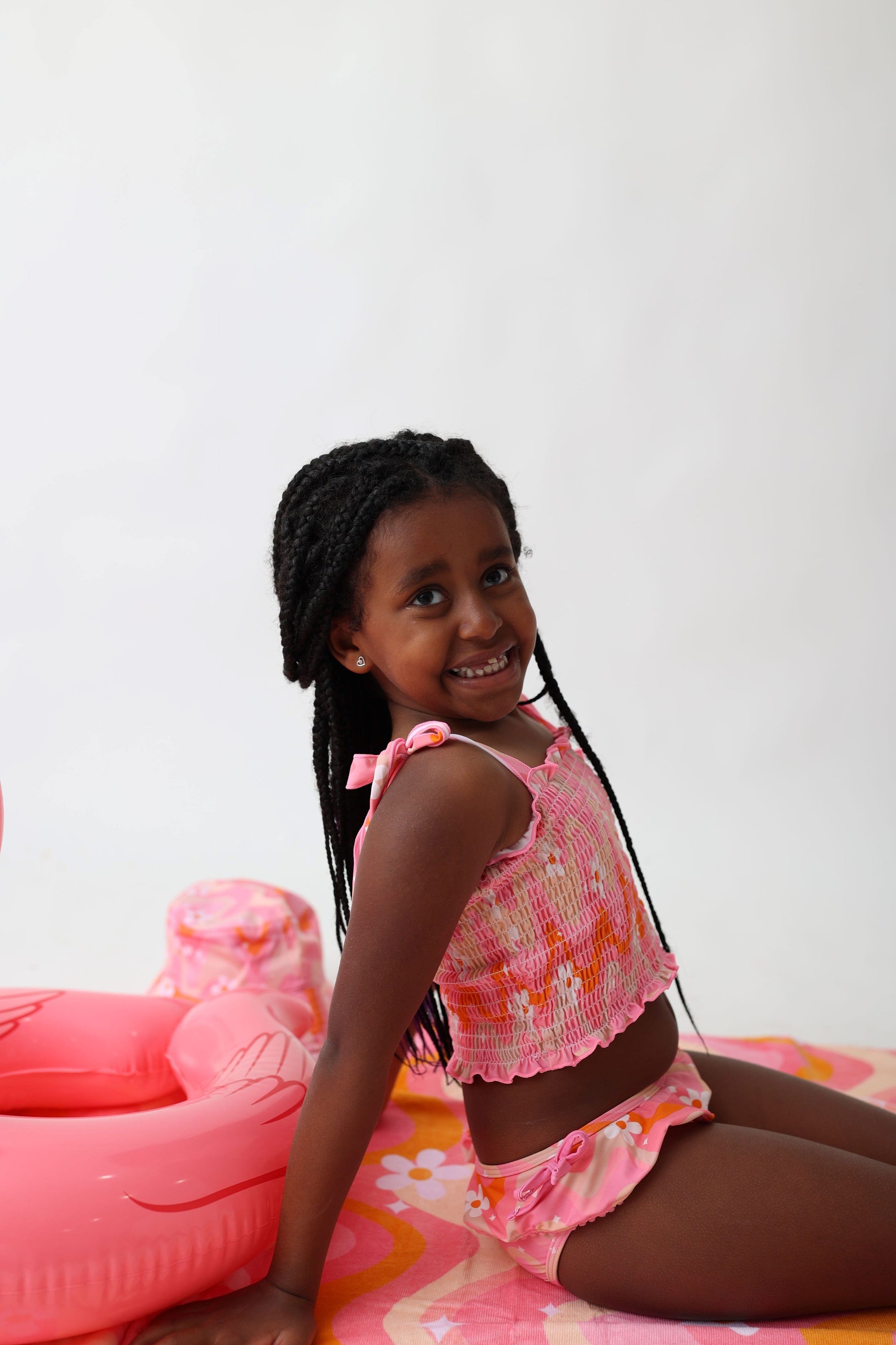 All new and girlie Dream Tankini Two Piece Swim Suit! Made with comfort and stretch in mind, this eye-catching suit features a pom-pom trim and ruffled top and bottom for maximum style and beach-loving vibes. Our UPF 50+ swim fabric will keep your little ones covered under the sunny rays.