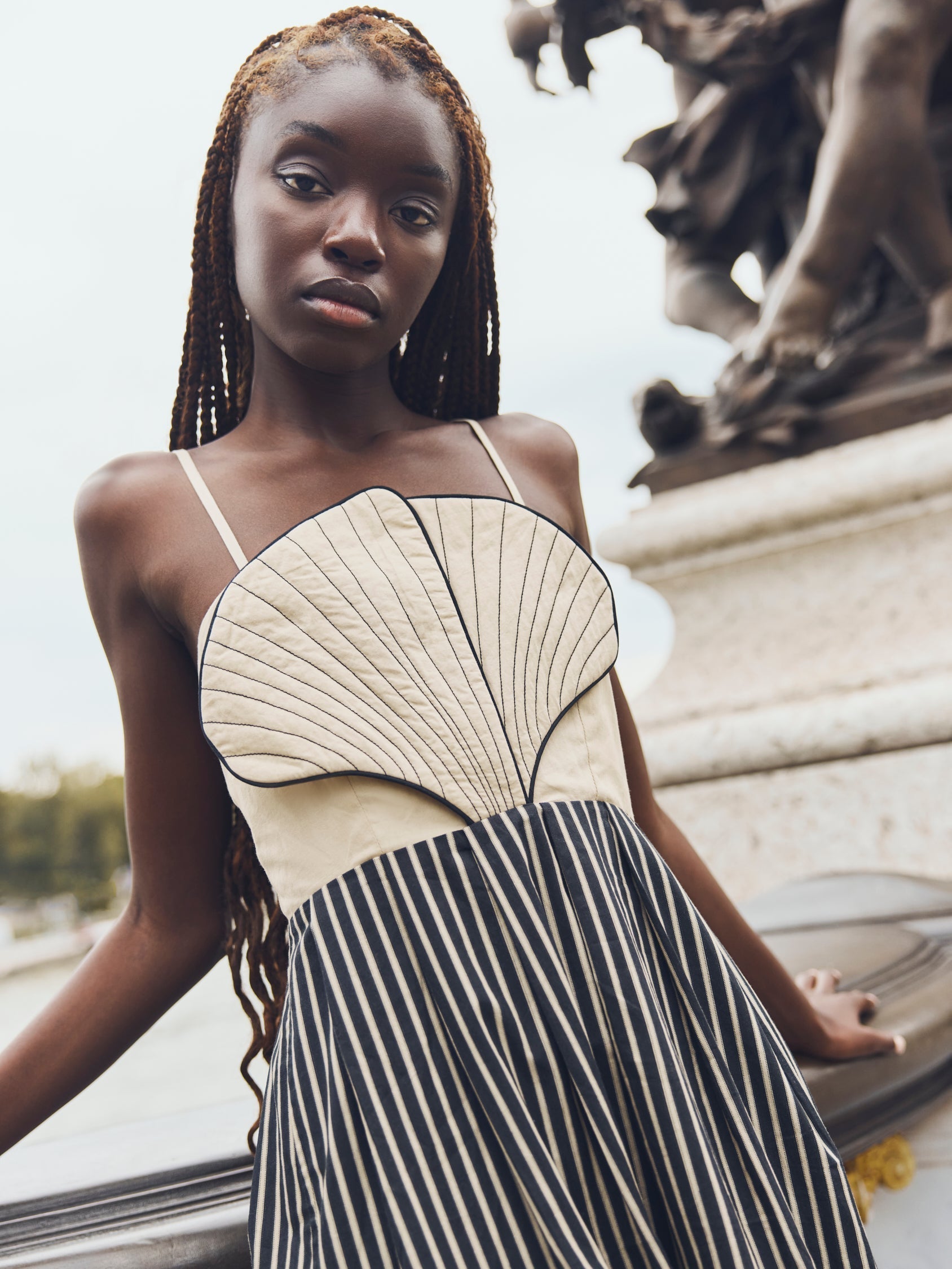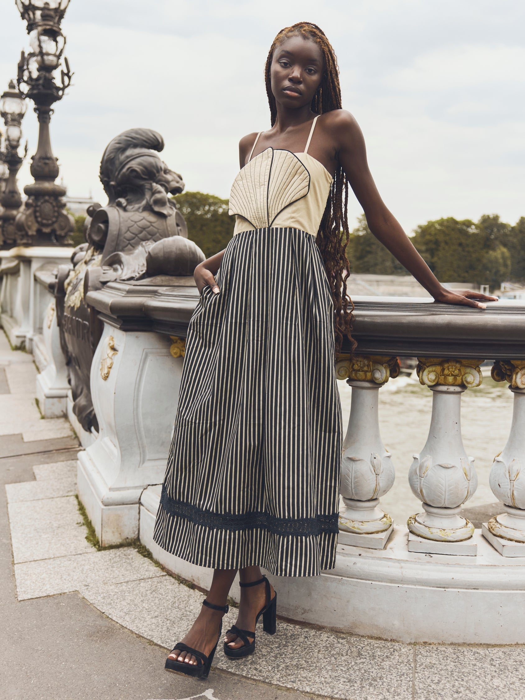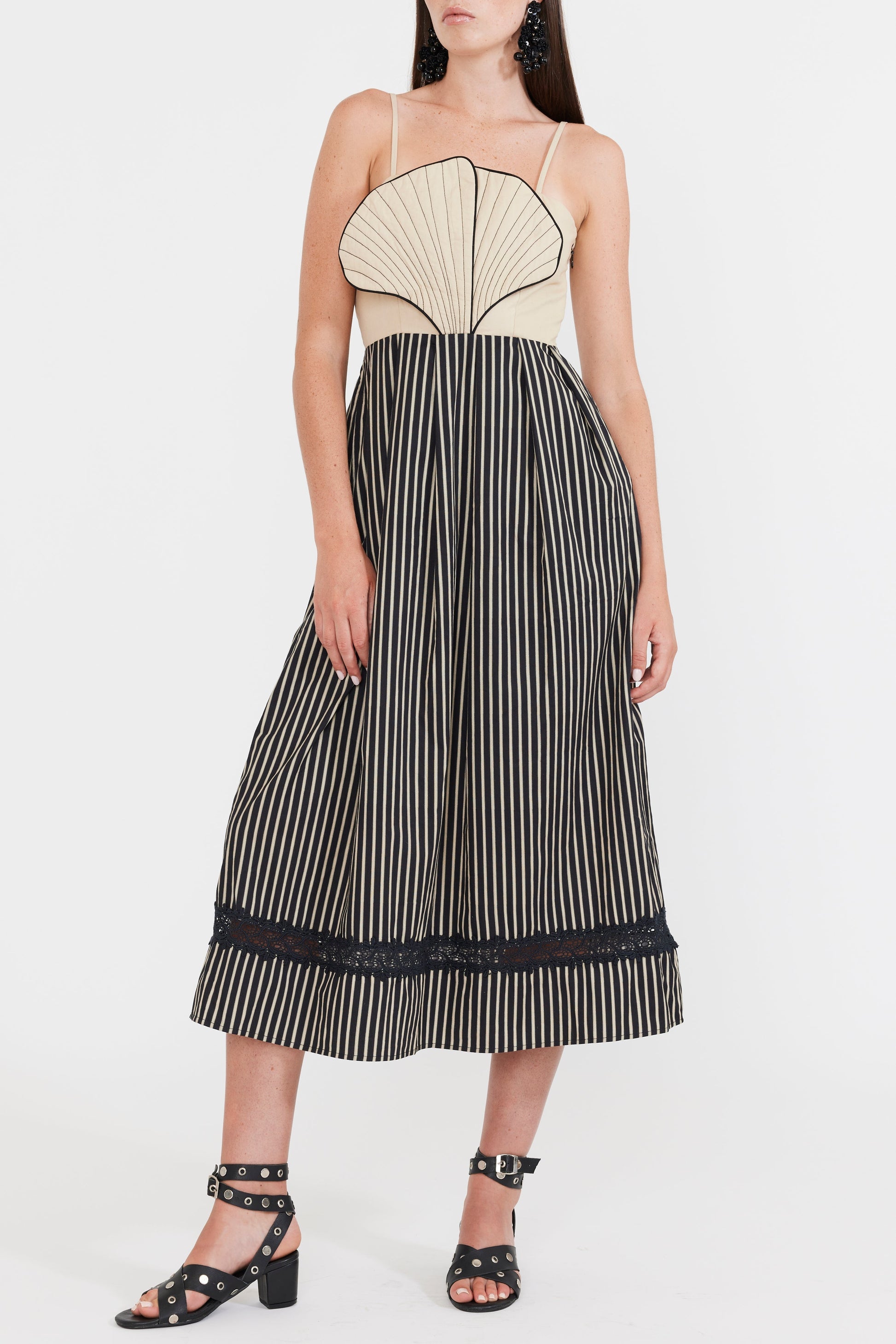 Meant for a moment, the Hart is an empire waist midi. Statement petal detailing the bust while the neutral black and khaki vertical stripe adorn the flowy skirt of this dress. Elasticized back and invisible side zipper for adjustable fit. Semi-sheer lace insert finished.