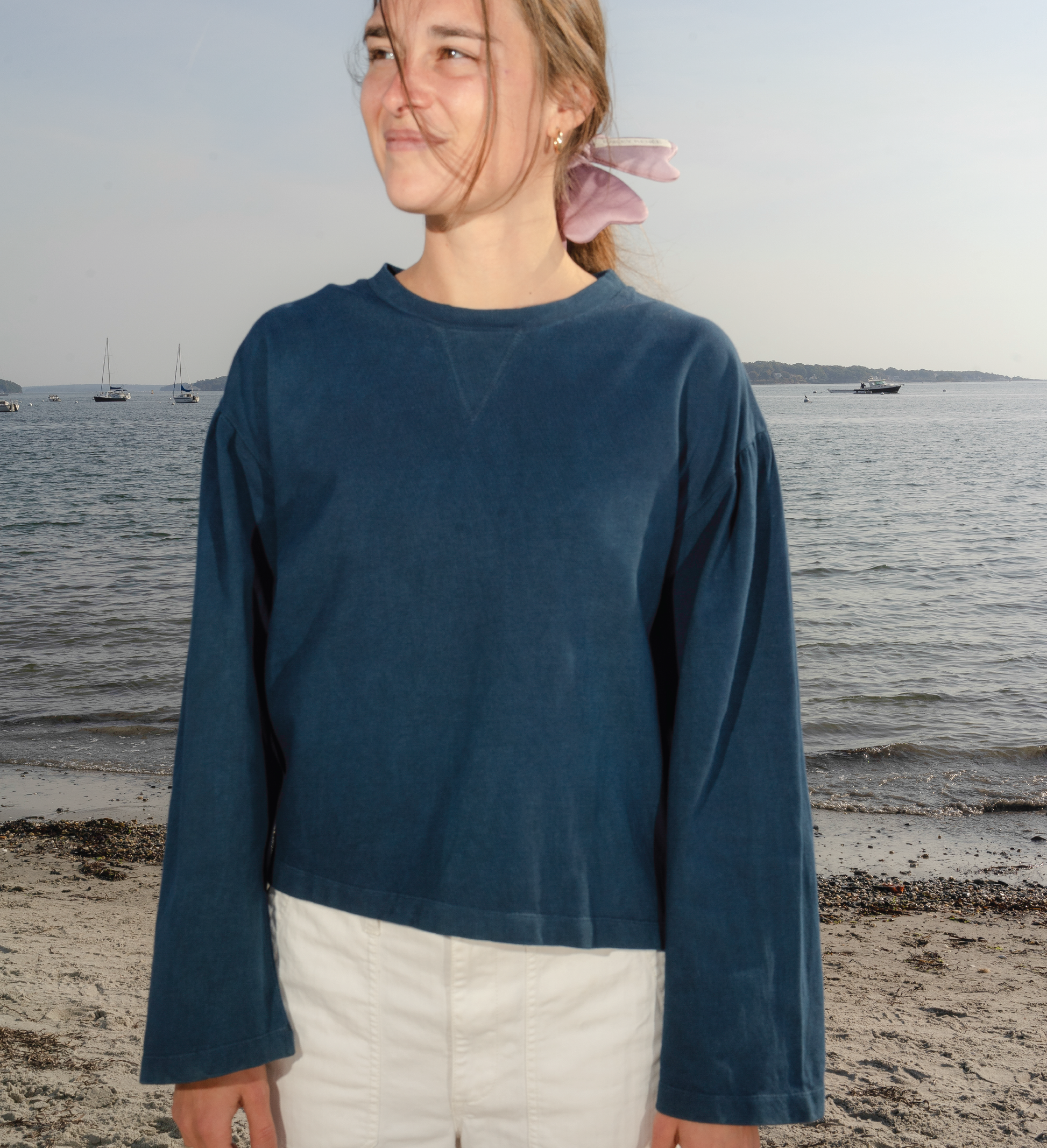 A Foundational Wardrobe Piece-Taking cues from Intention Tee, a favorite from seasons past, the Intent Tee is the long-sleeved sister silhouette. Crafted from dense knit cotton & dyed with plants, the easeful top is mindfully cut to have a loose, slightly oversized fit equally suited for lounging & layering. The shapely tee is characterized by a classic crew neckline with exposed stitching to create an illusionary V-dip along the neck, a subtle detail adding a touch of enchantment to the everyday piece. The high-quality fabrication paired with the quietly confident silhouette ensures the Intent Tee will have a lasting existence in any thoughtfully curated wardrobe.