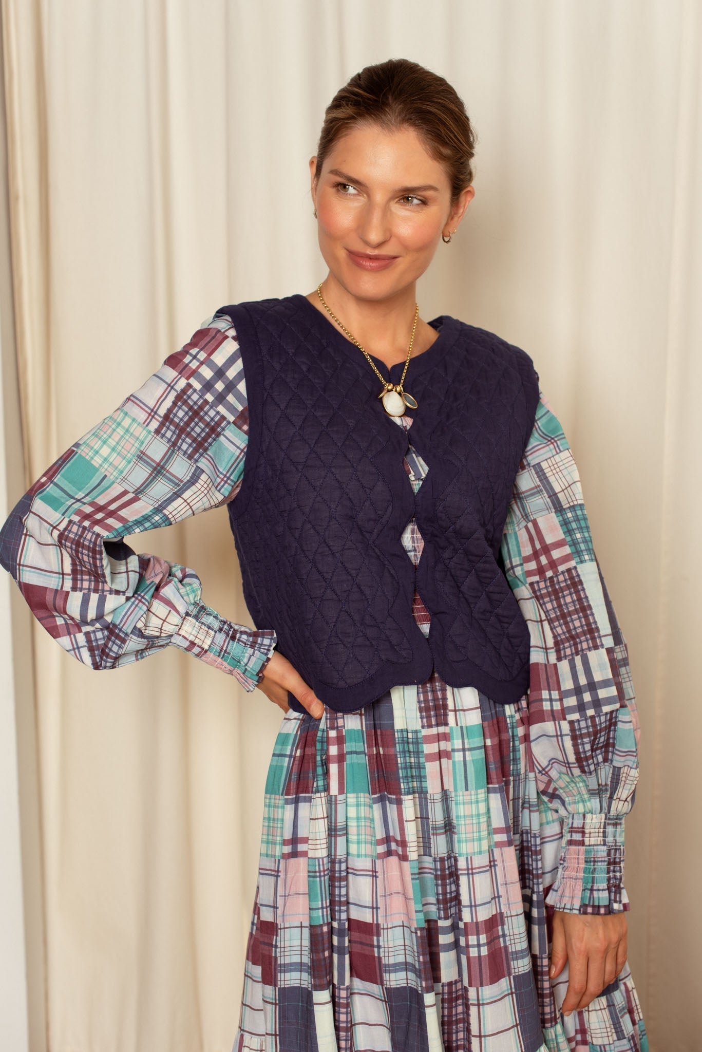Mila is wearing the Irma in small with the Celeste vest in navy blue in small.