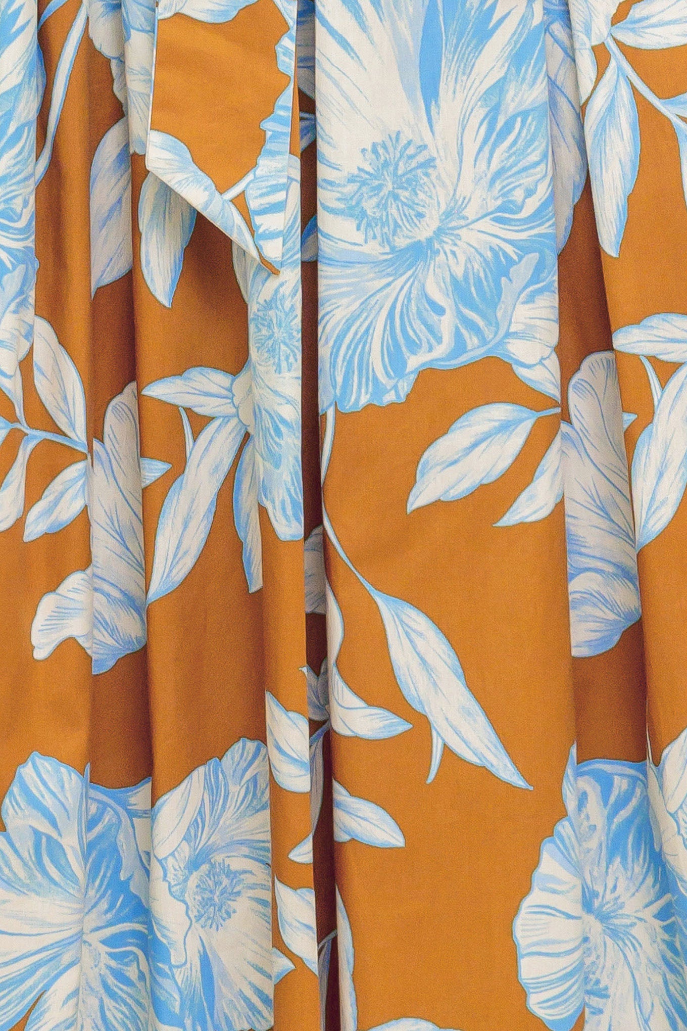 A printed woven midi dress featuring collar, short sleeve, front button down, self sash tie and full skirt