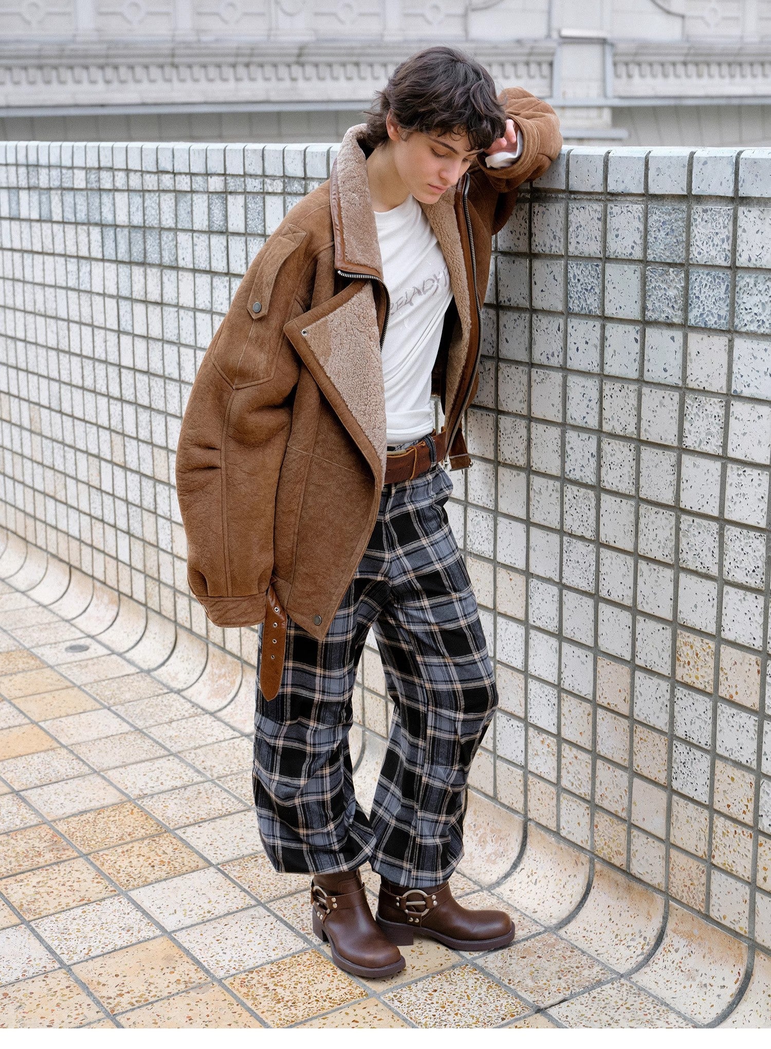 Selected Spanish Merino fur, with the plate facing outward, the suede is delicate, skin-friendly, soft, wear-resistant, and has a two-color texture. The inner fur surface has a natural grainy soft style that warms the skin. The small lapel motorcycle jacket is versatile and compatible with various styles. Combined with the popular Maillard color system in autumn and winter, it is easier to control.
