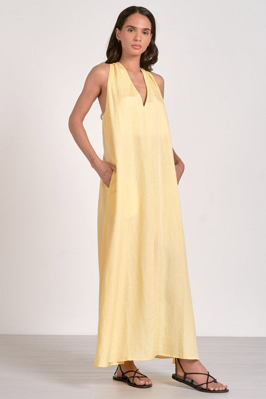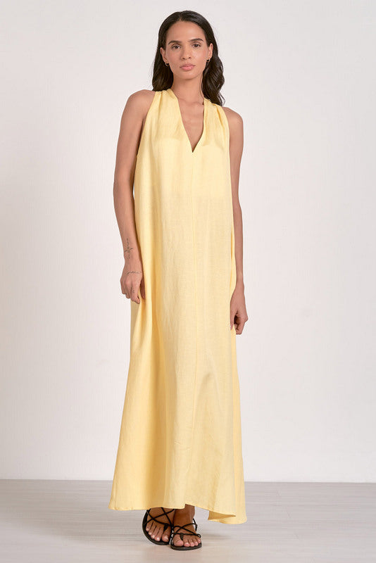 The Lala Maxi Dress is a sleeveless, flowy silhouette made from a breathable cotton and linen blend. With its unique sleeve cut and low V-neckline, this dress is perfect for dressing up or down all summer long—effortless, airy, and flattering.