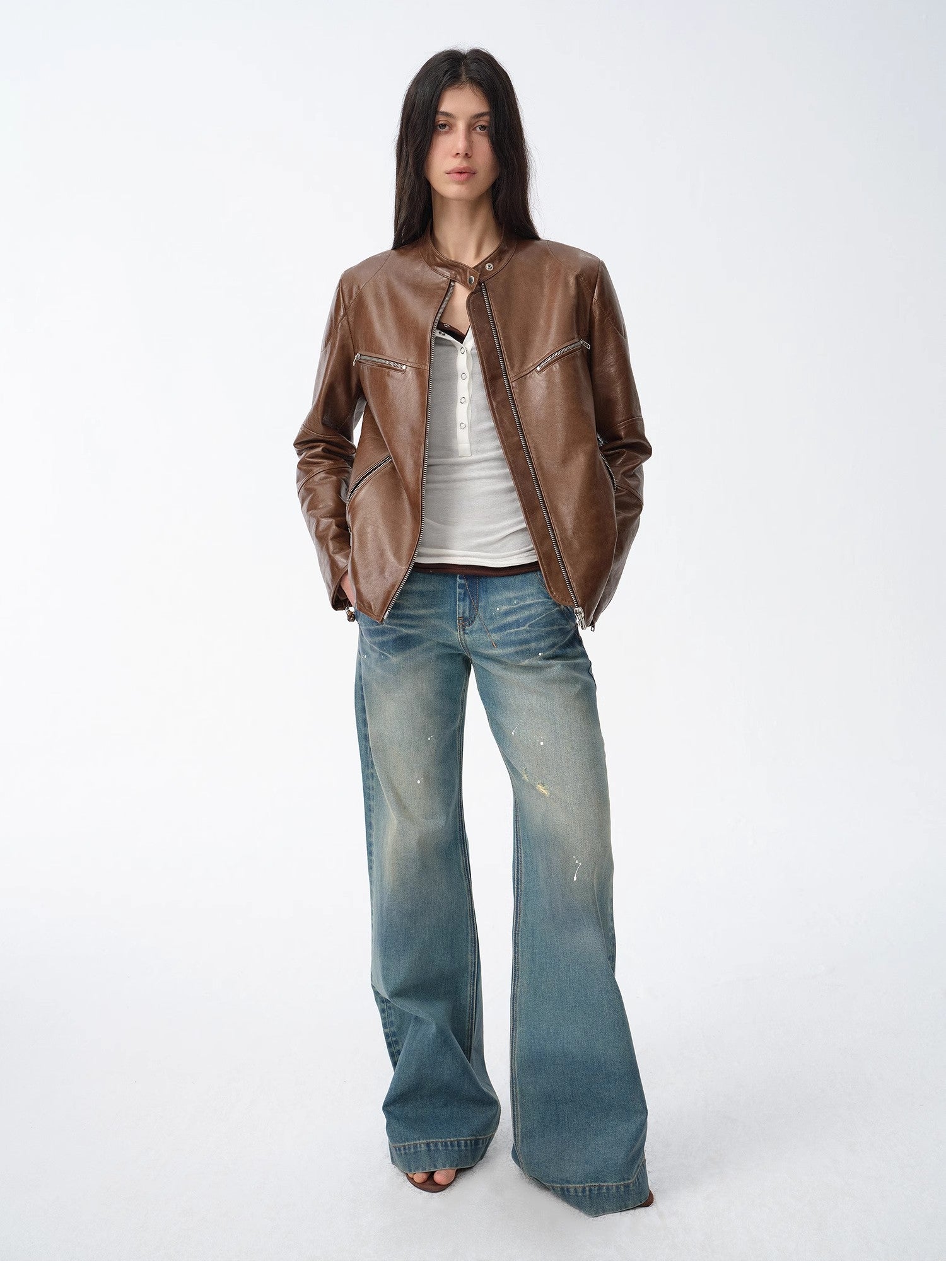 Straight-fitting, slightly waisted, and dropped-sleeves motorcycle jacket