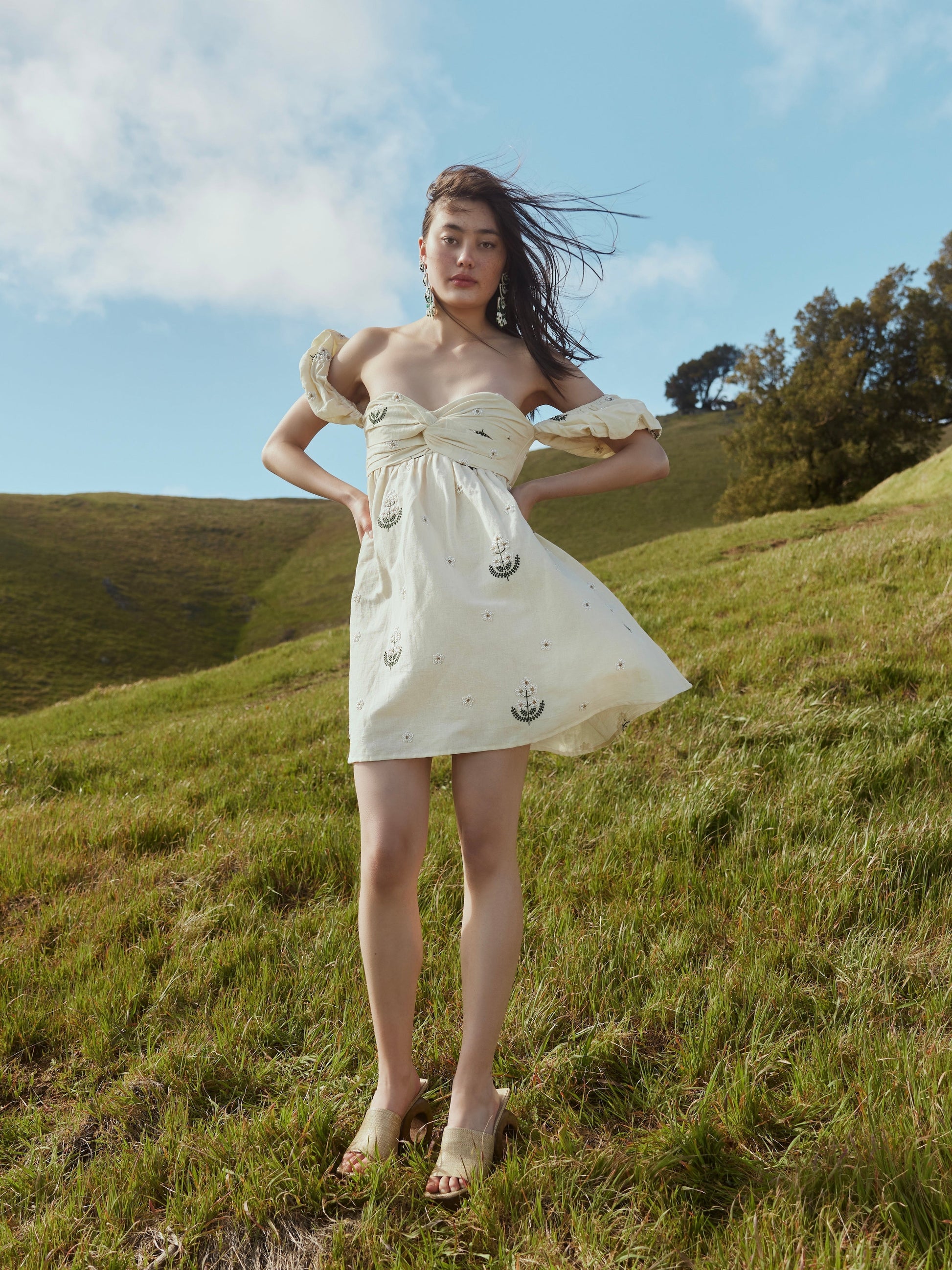 The Meadow Puff Sleeve Mini has an empire waist the provides a flattering silhouette, statement puff sleeves, while the adjustable back tie allow for customization as needed. The dress is adorned with delicate floral embroidery and embellished with beading assembled in flower clusters, creating a look that is both feminine and sophisticated. The playful flower motif and intricate beading add a touch of whimsy