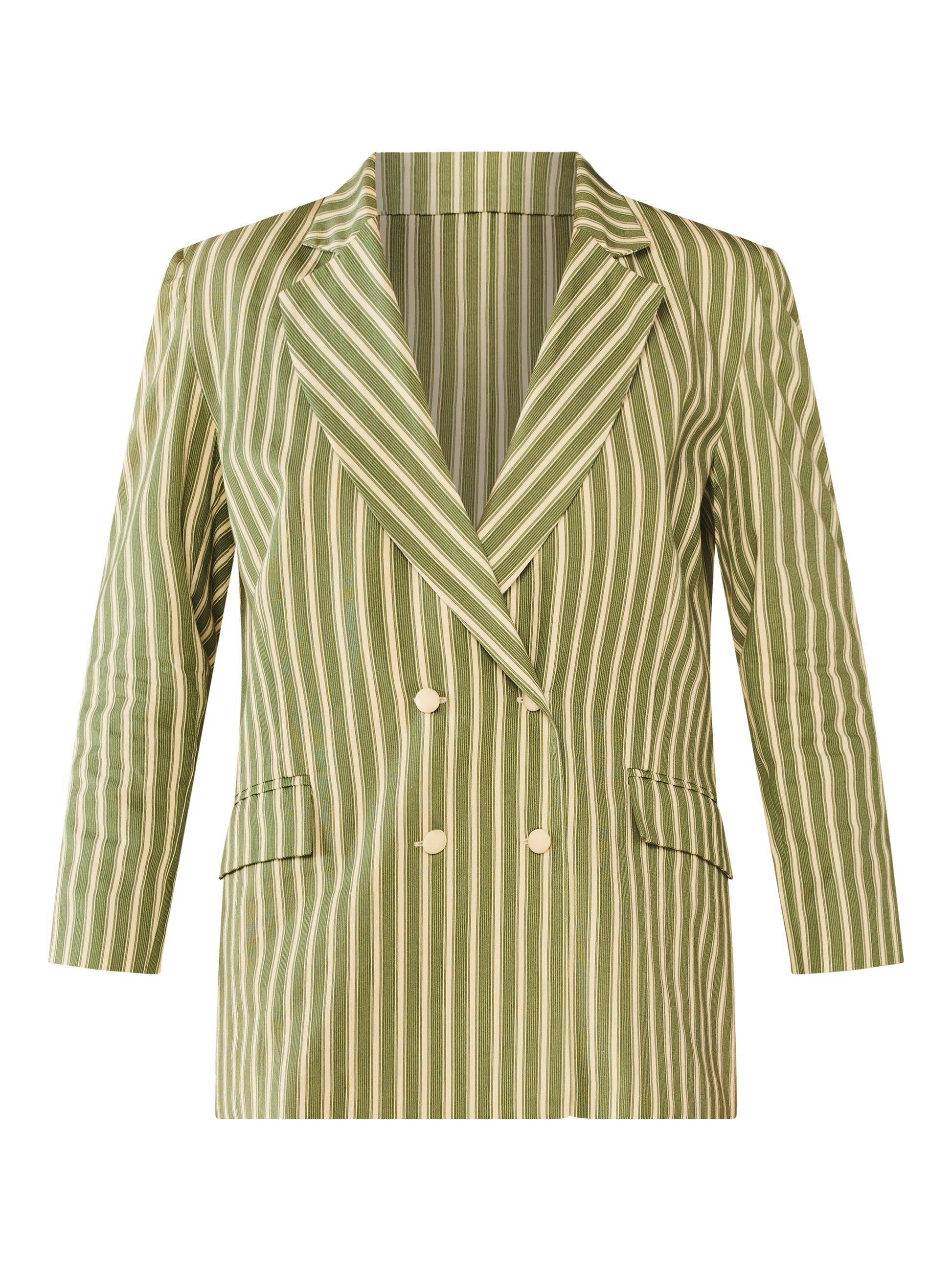 A double-breasted blazer, but make it modern. Tailored with ease in soft green and white stripes, Meredith is your shortcut to looking pulled together without trying too hard. Oversized enough to throw on over a tee, yet structured enough to carry you into a dinner meeting, this one’s all about balance.