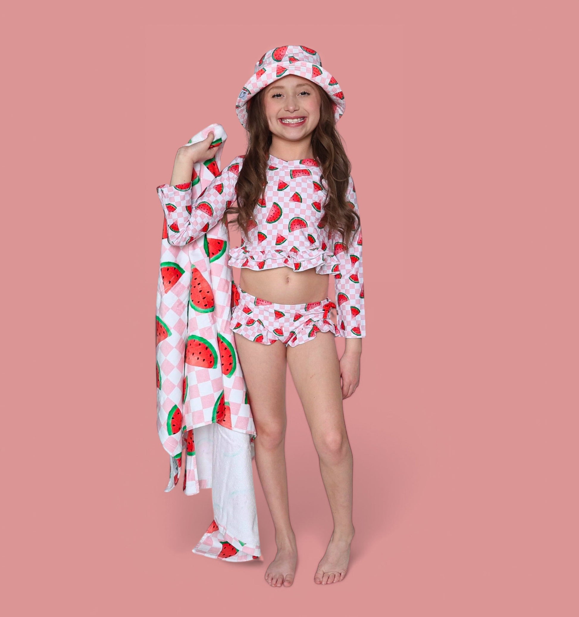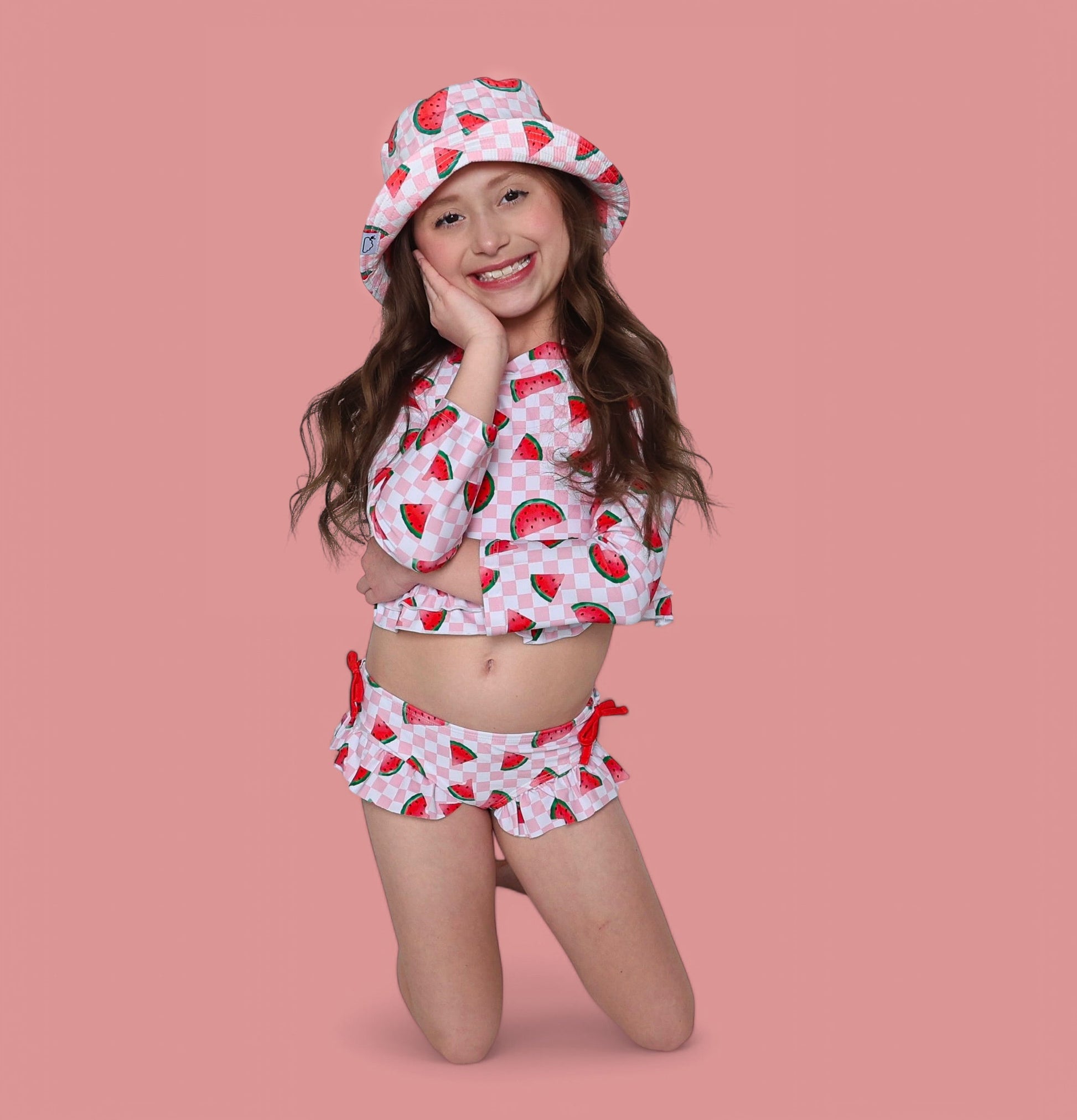 Introduce your little one to a splash of summer style with the ONE IN A MELON DREAM 2-PIECE RASH GUARD RUFFLE SWIM SUIT—a perfect blend of playful design and practical protection. Inspired by a vibrant watermelon theme, this swim suit features a fun pink and white checkered background reminiscent of a classic picnic, enhanced by scattered watermelon slices in various orientations. The bright red, green, and black accents evoke a fresh, summery vibe that’s sure to make waves wherever your child goes.