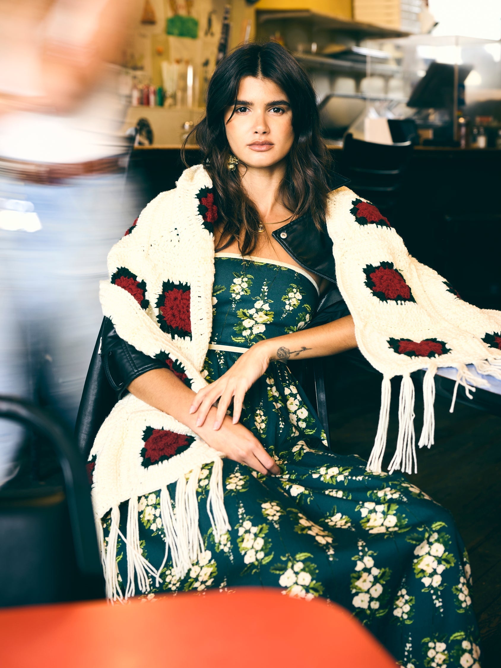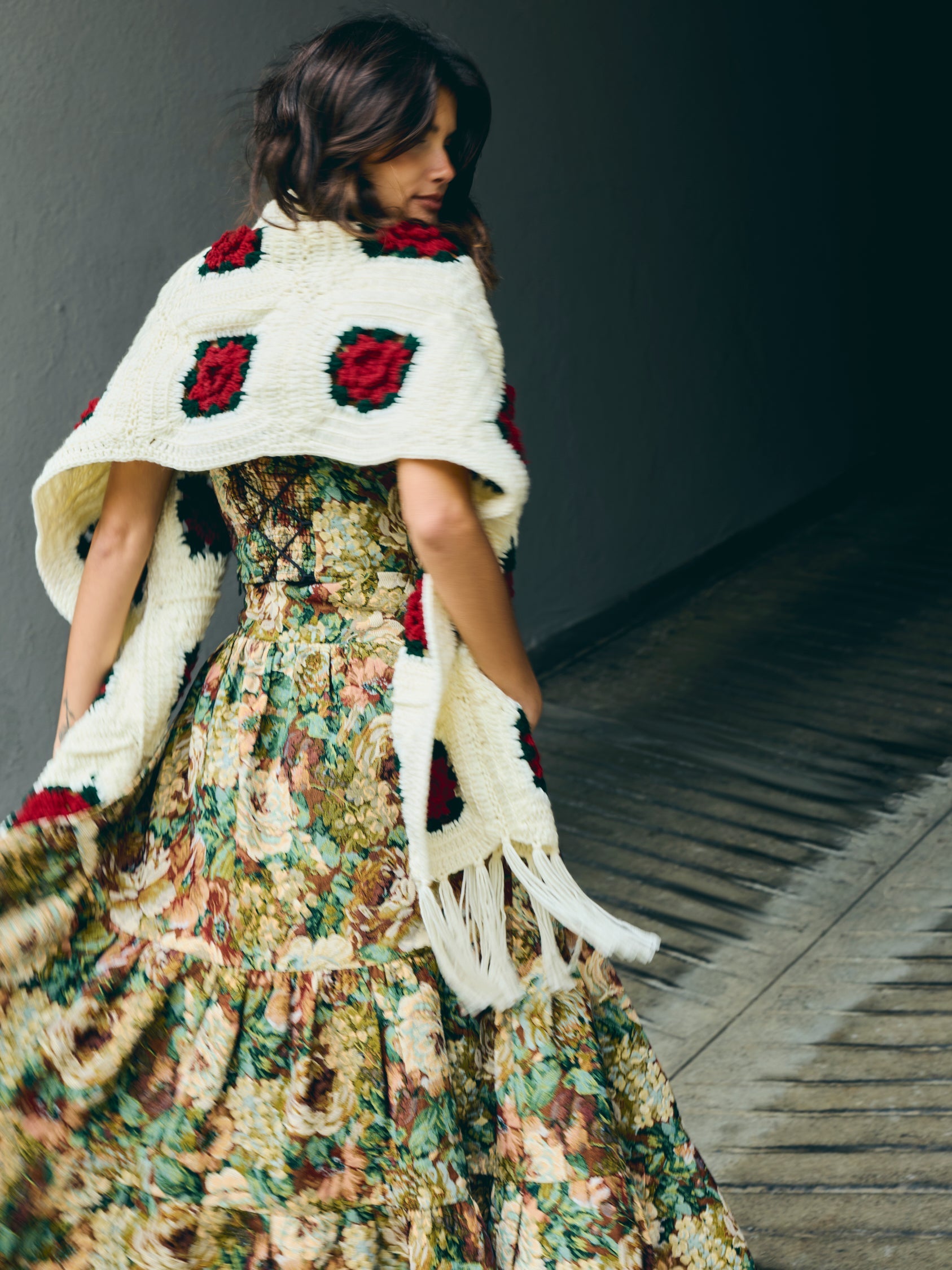 Inspired by a vintage treasure and reimagined in hand-crocheted wool. Rosette “granny” squares bloom across an ivory ground, finished with swingy fringe for a little movement. Generously sized to wear as a wrap, scarf, or cozy shoulder throw.