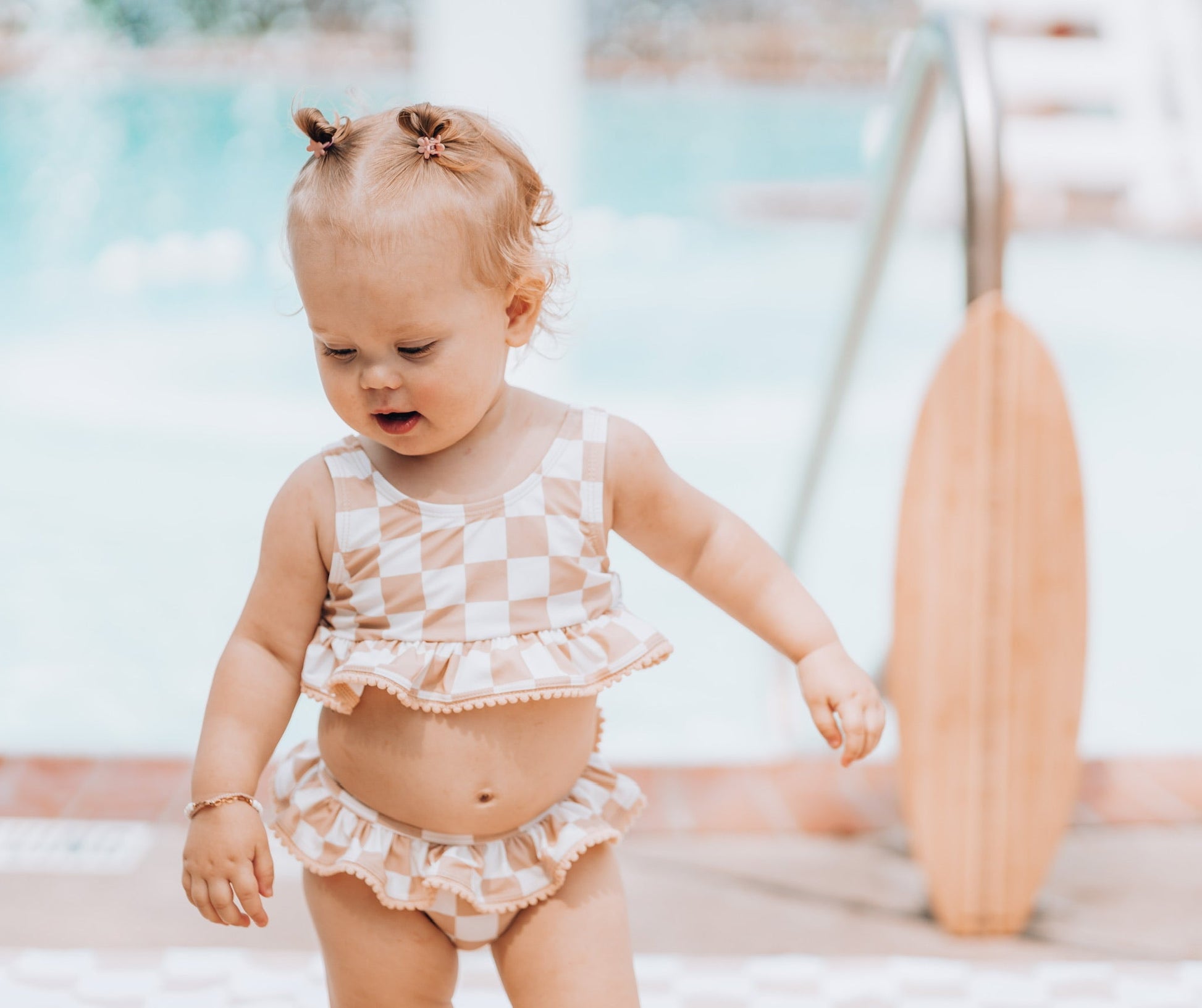 All new and girlie Dream Tankini Two Piece Swim Suit! Made with comfort and stretch in mind, this eye-catching suit features a pom-pom trim and ruffled top and bottom for maximum style and beach-loving vibes. Our UPF 50+ swim fabric will keep your little ones covered under the sunny rays.