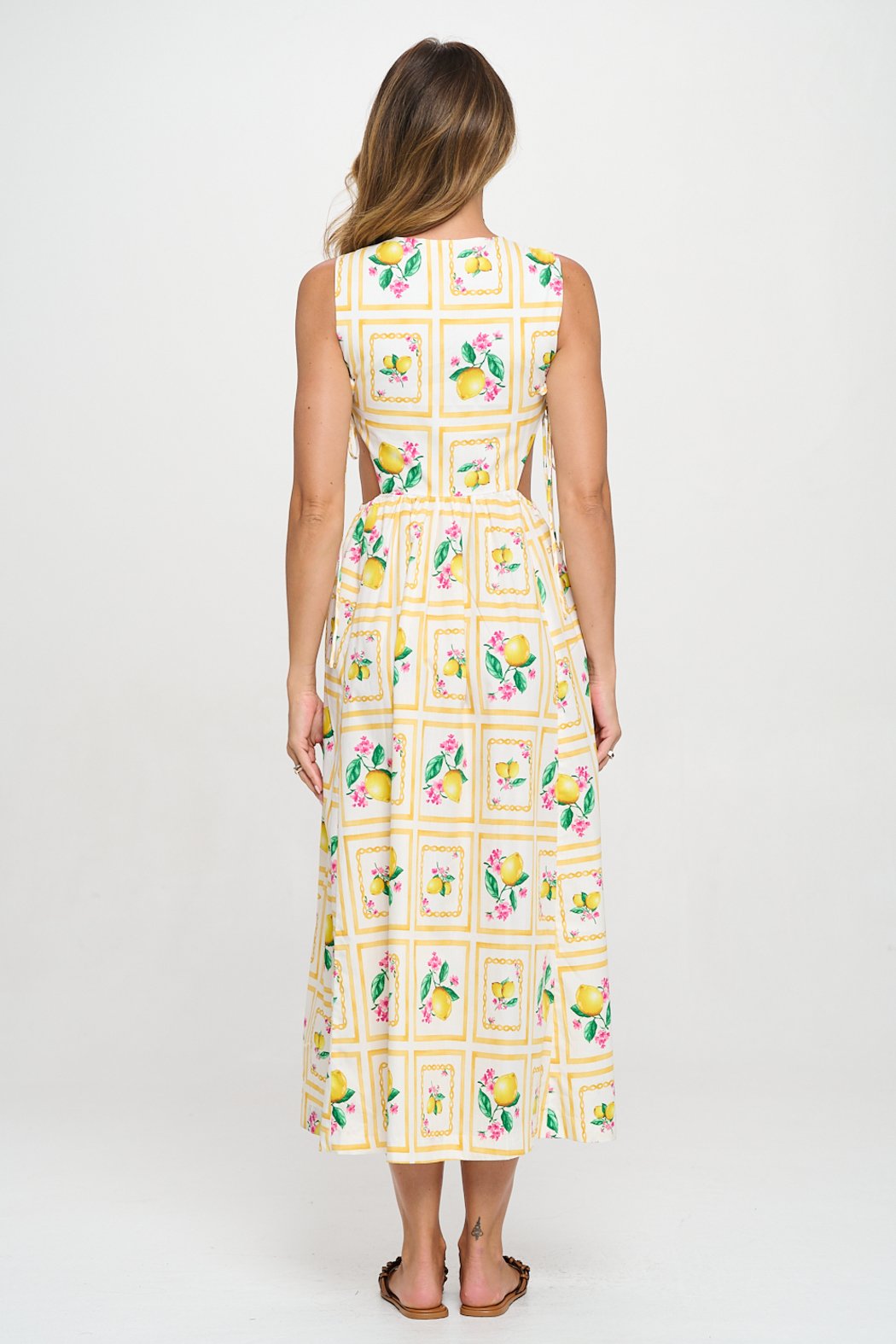 Make a statement with this breezy sleeveless midi dress, designed for effortless elegance. Featuring flattering side cutouts with adjustable tie details, this dress blends sophistication with a touch of playfulness. The lightweight fabric offers a flowy silhouette, making it an ideal choice for vacation getaways, brunch dates, or summer outings.