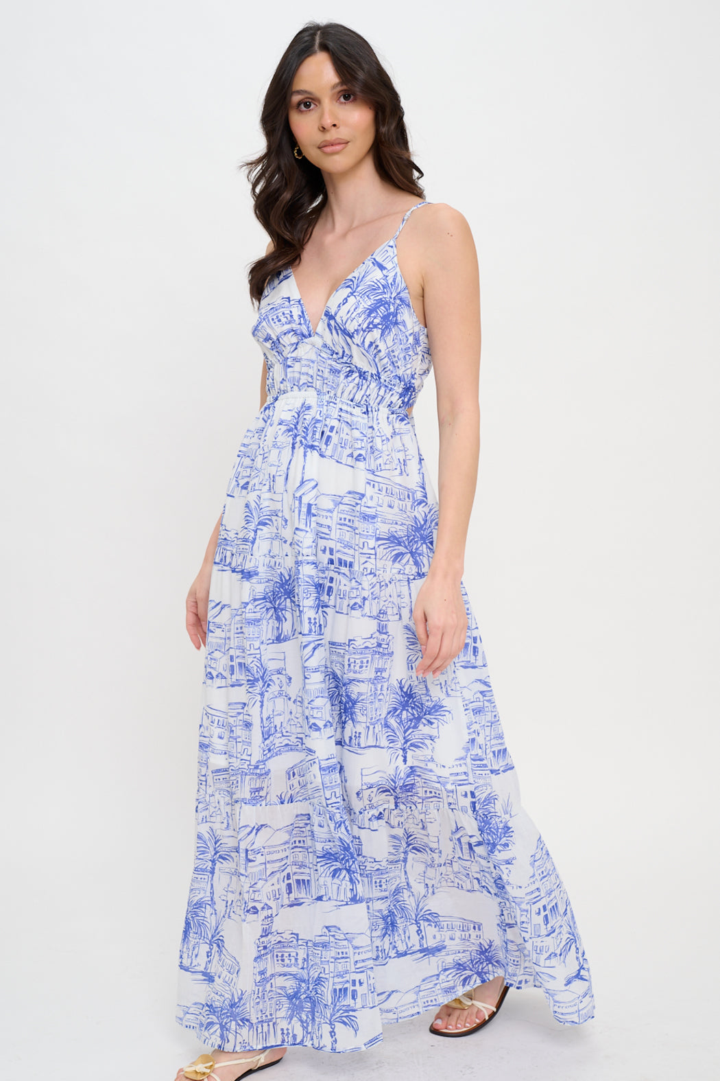 Embrace effortless elegance with this coastal-inspired maxi dress, designed with a flattering deep V-neckline and delicate adjustable straps. The breezy tiered silhouette flows beautifully, making it perfect for vacations, beachside strolls, or summer soirées. The intricate scenic print adds a timeless, resort-chic feel, while the lightweight fabric ensures all-day comfort. Pair it with sandals for a relaxed look or dress it up with heels for a sophisticated ensemble.