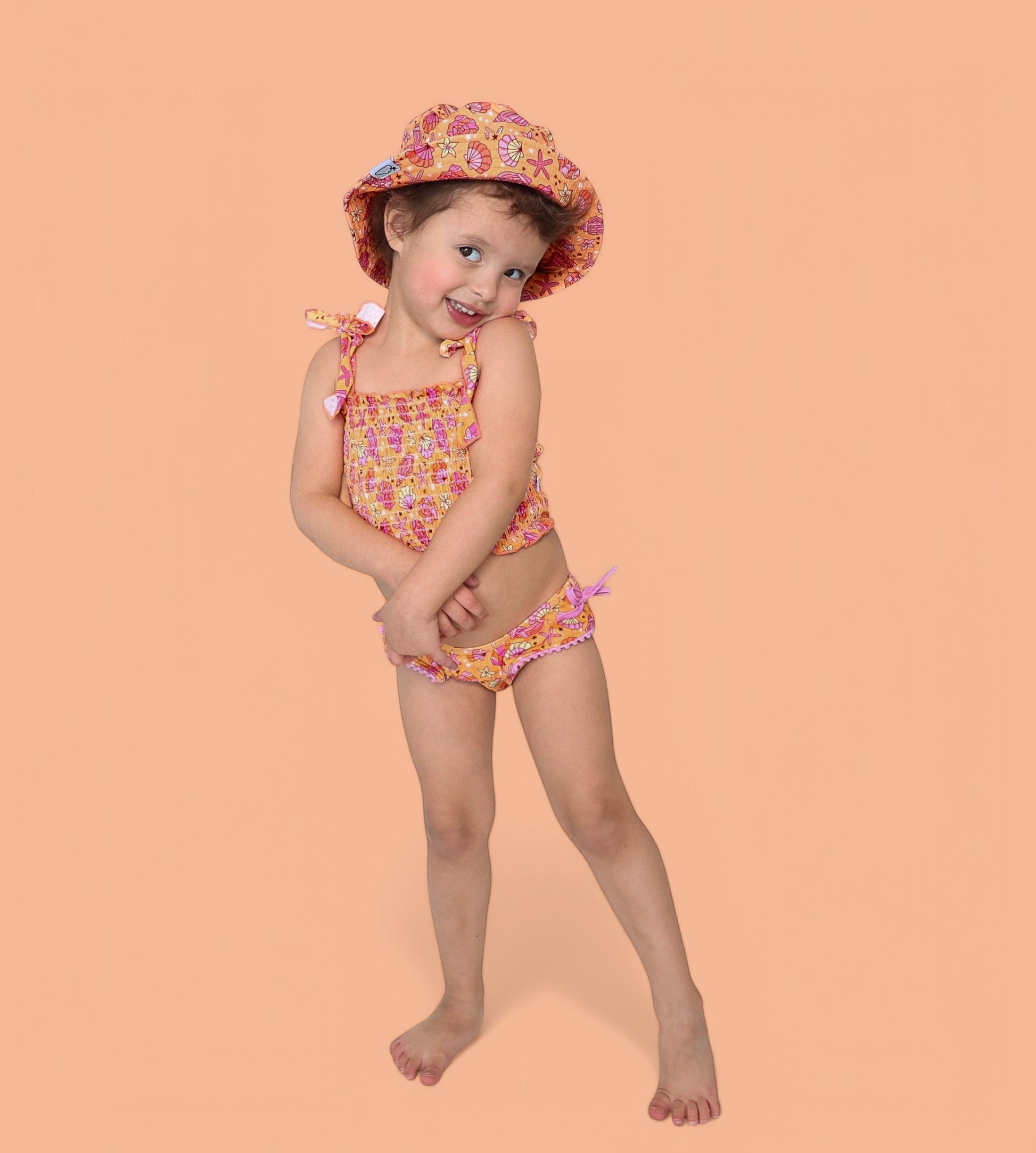 Our Shello Summer Dream Smocked Tankini is the perfect mix of sun-ready style and carefree comfort. Featuring our sweet, sunset-inspired seashell print in soft peach, coral, rose pink, and lavender, this two-piece suit was made for little ones who love to twirl, splash, and shine.