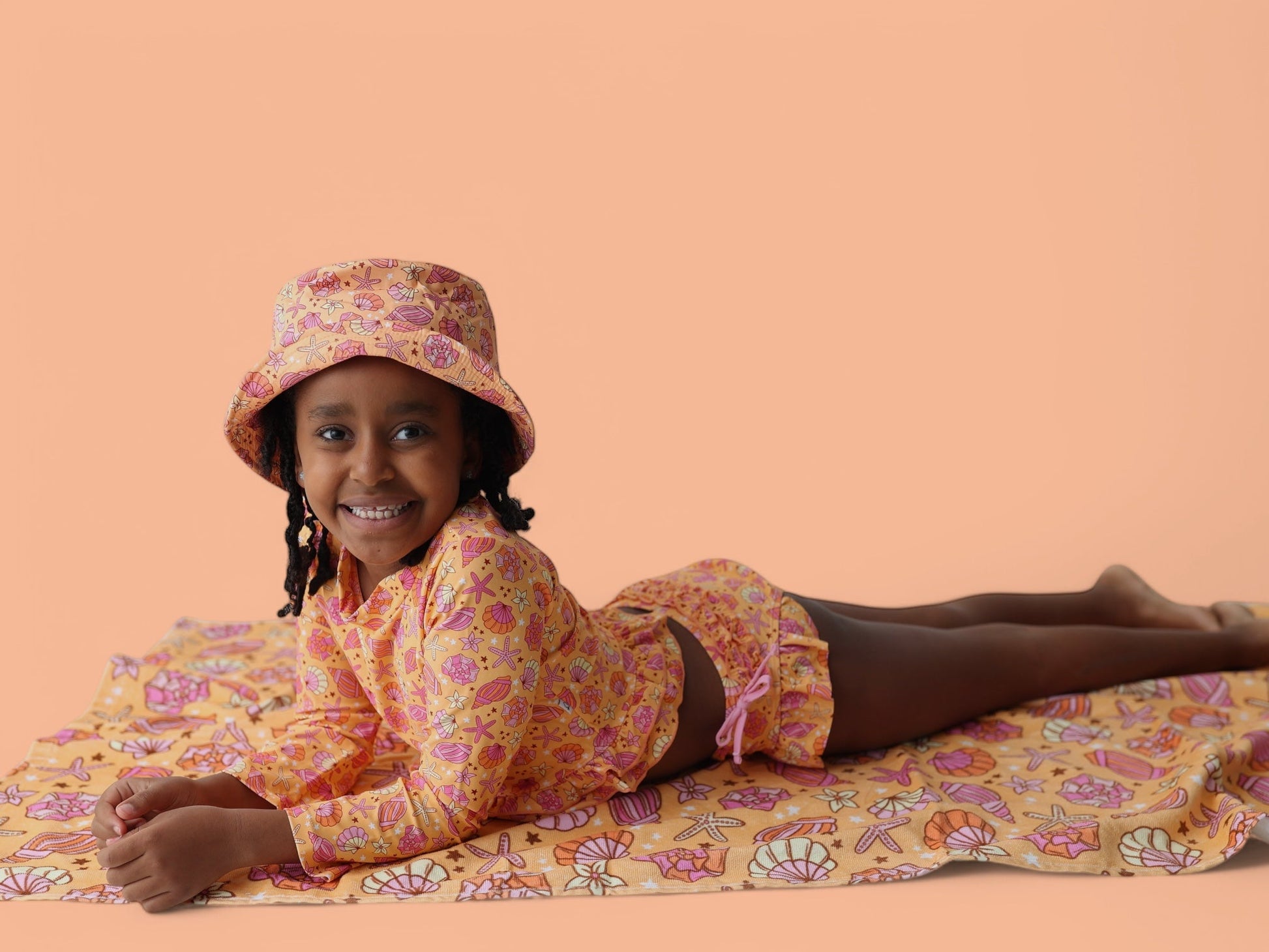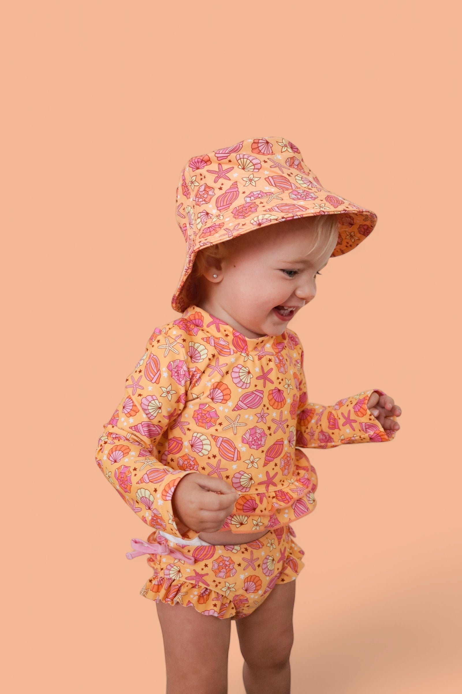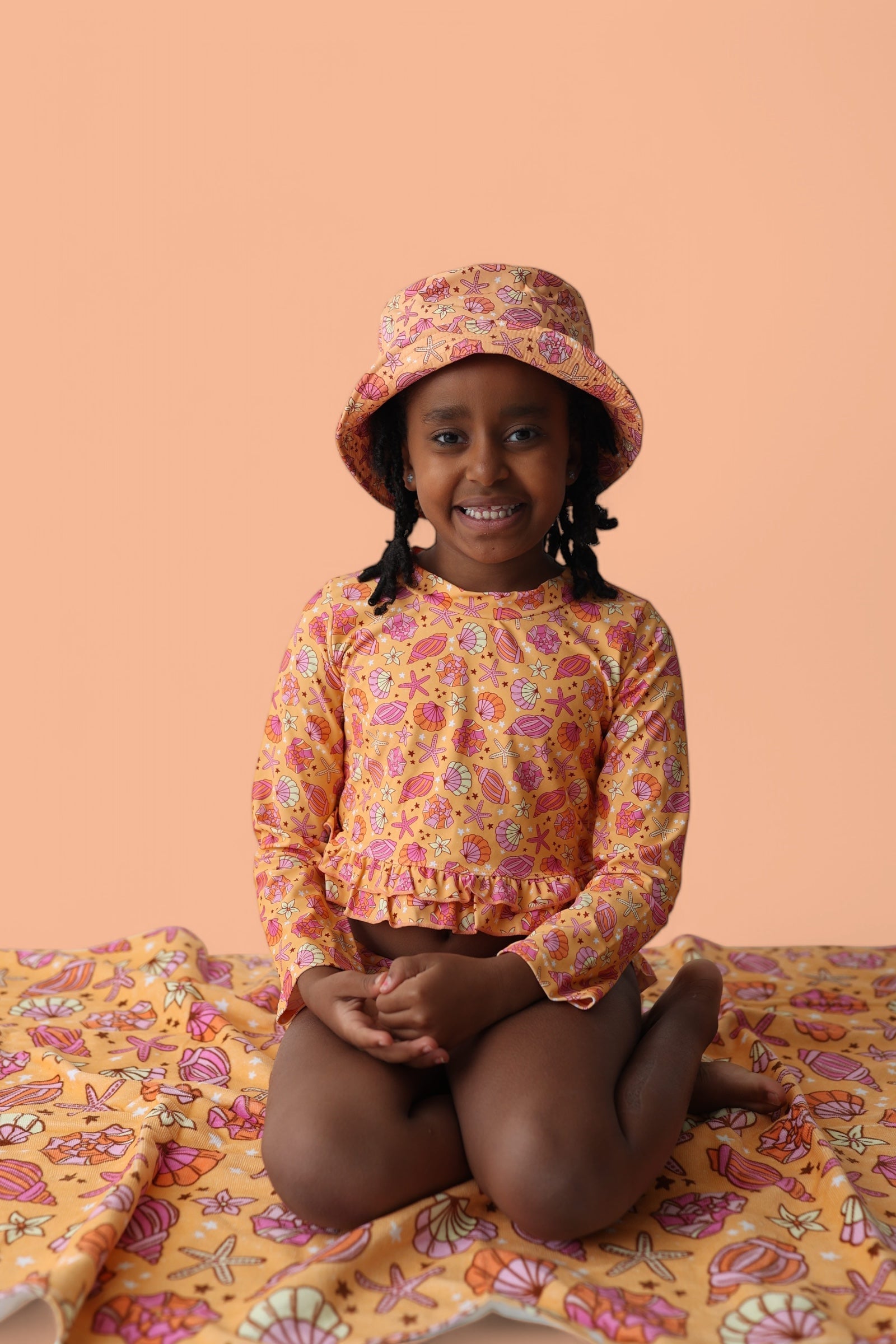 Let your little one shine in the Shello Summer Dream Rash Guard Ruffle Swim Suit! This adorable 2-piece set features a soft peachy backdrop with playful seashells, starfish, and coral details in rosy pinks, lavender, and cream—bringing those dreamy sunset beach vibes to life.