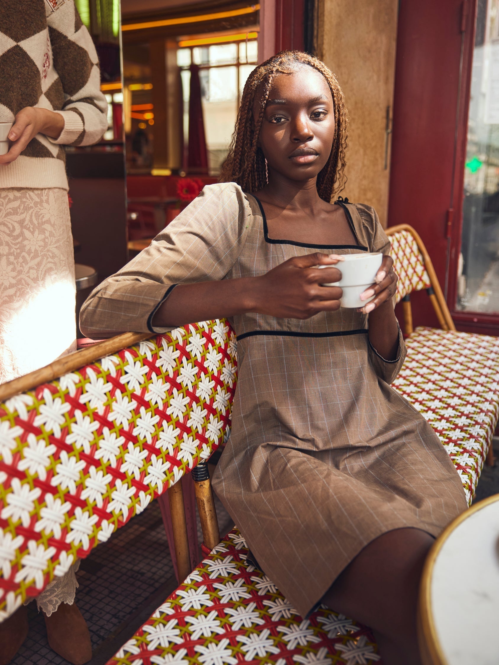 Meet the Tatum Dress. A square neck mini printed in a seasonal chocolate brown check print with subtle blue pinstripes. Black velvet adds soft detail to the neck line, waist, and cuff. An easy fit, finished with a playful bow on the shoulder. Pair with your favorite boots or tights and a flat for cooler weather.
