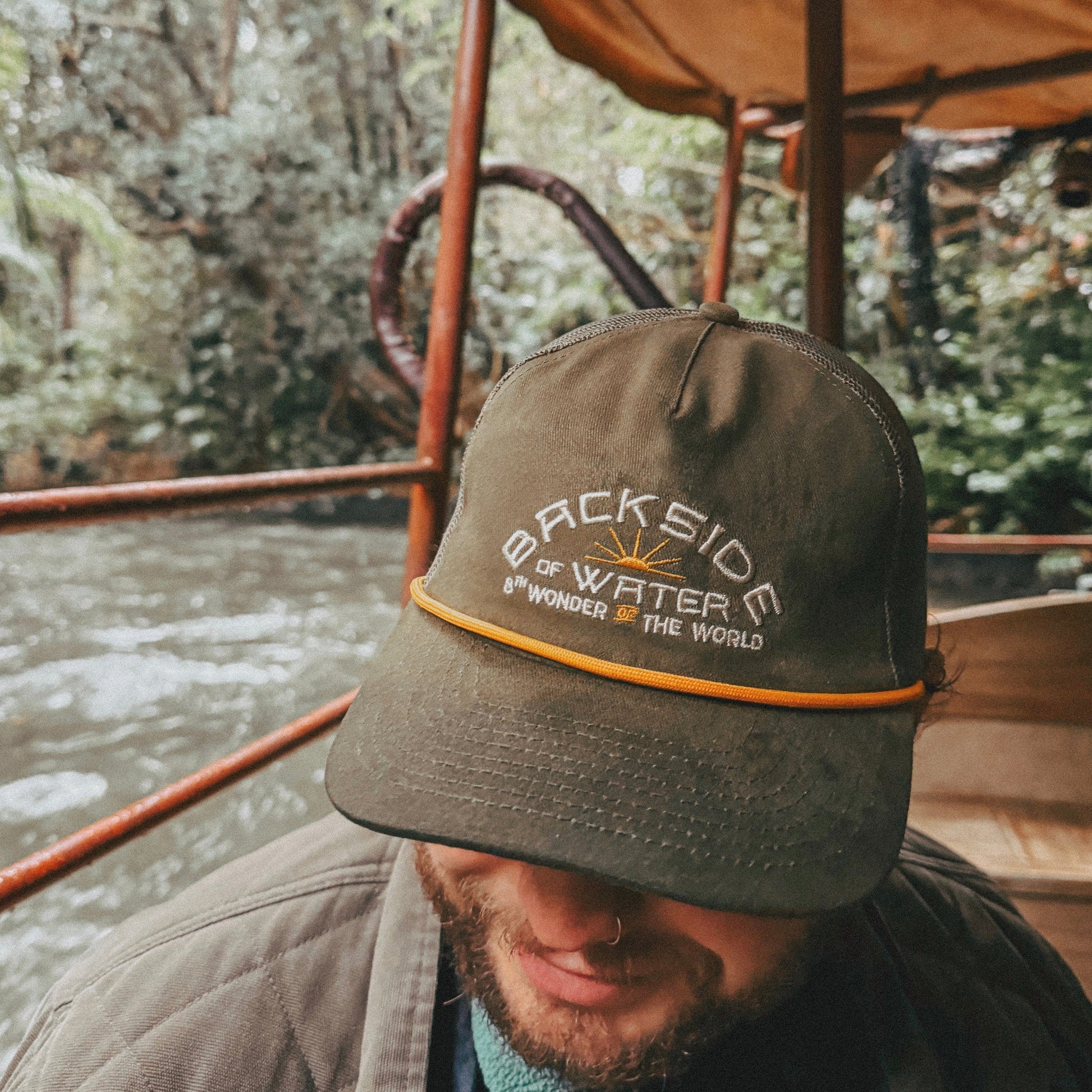 Our Backside of Water hat is the perfect accessory for any Jungle Cruise fan! These hats feature a classic 5-panel trucker style and are made of a soft 100% cotton fabric featuring a snapback closure.