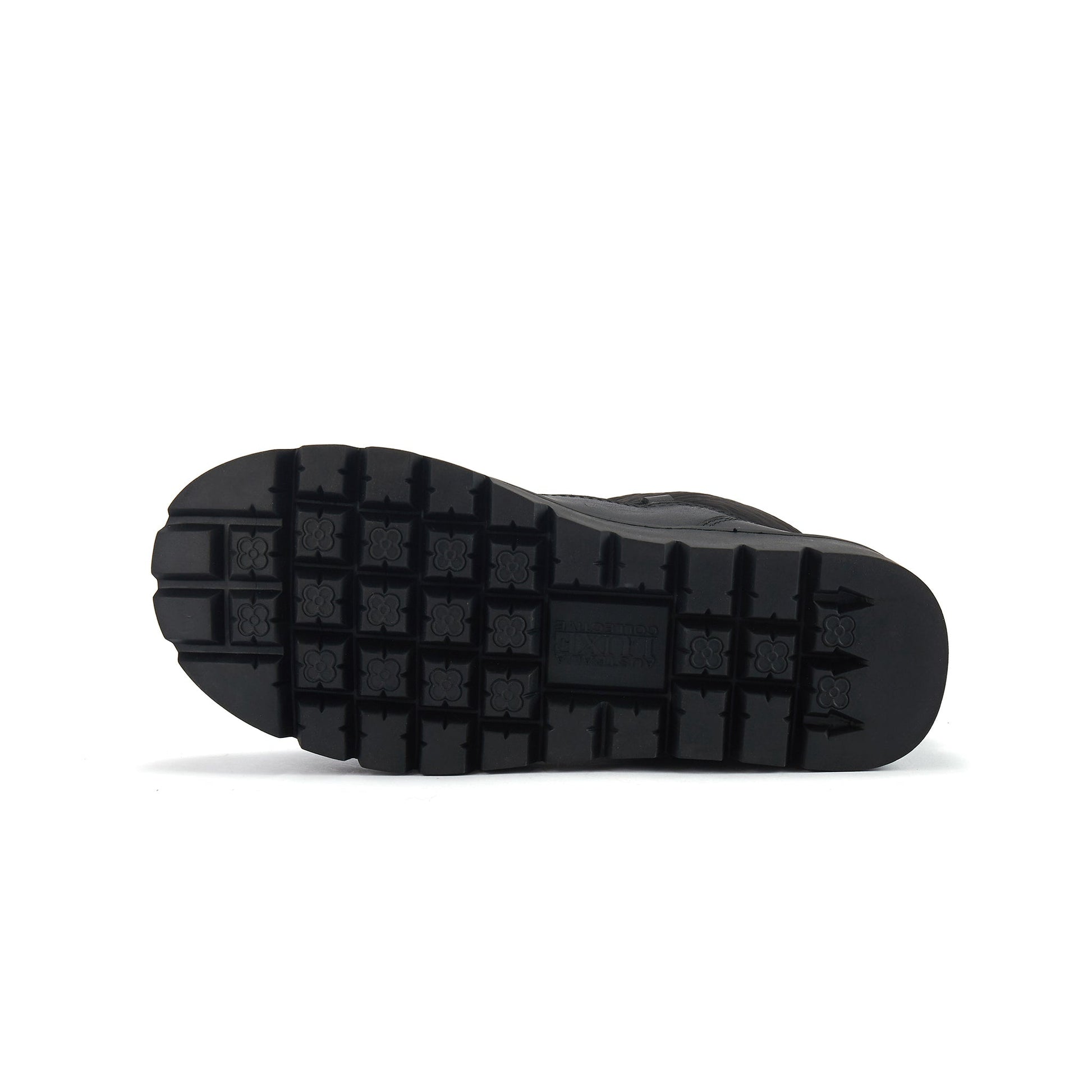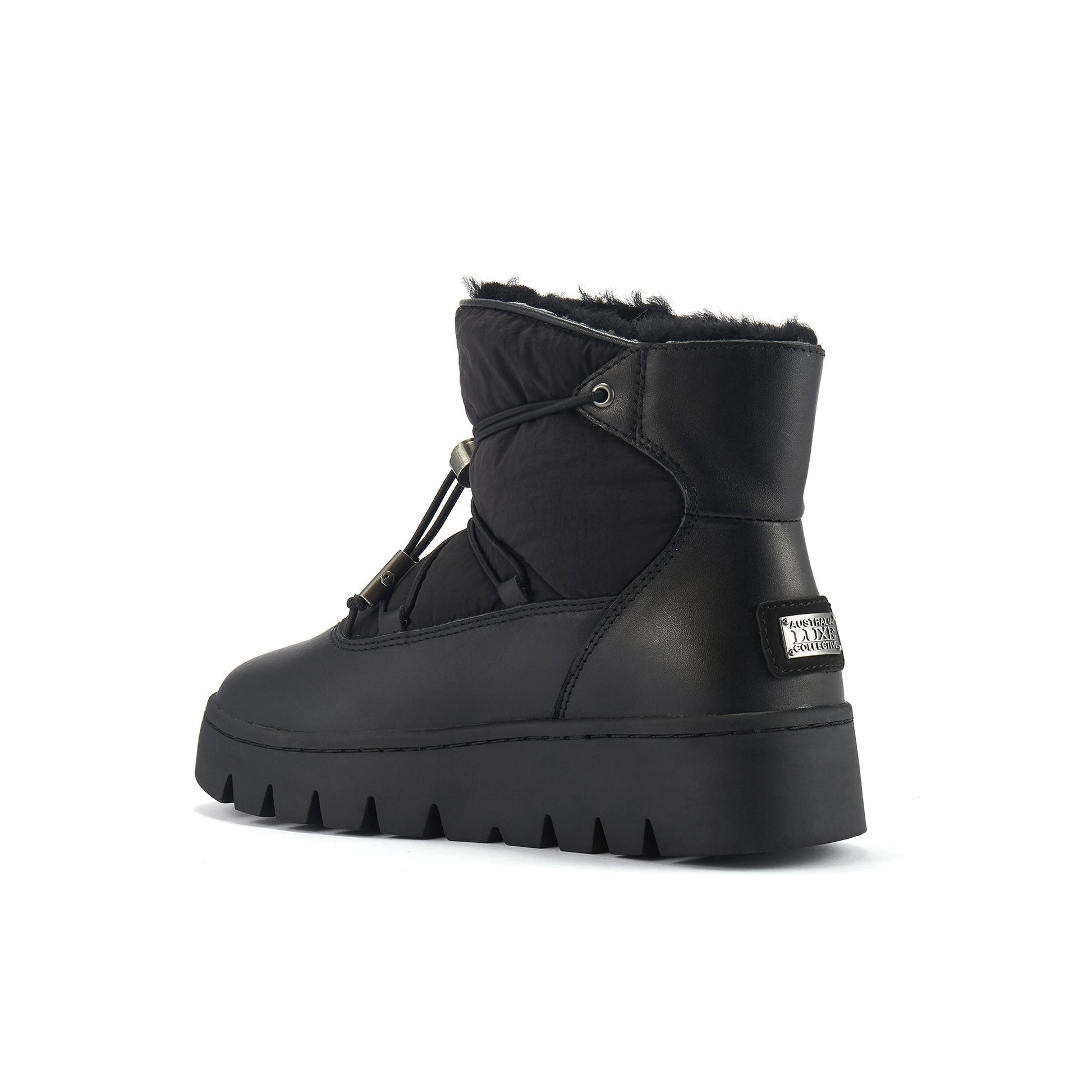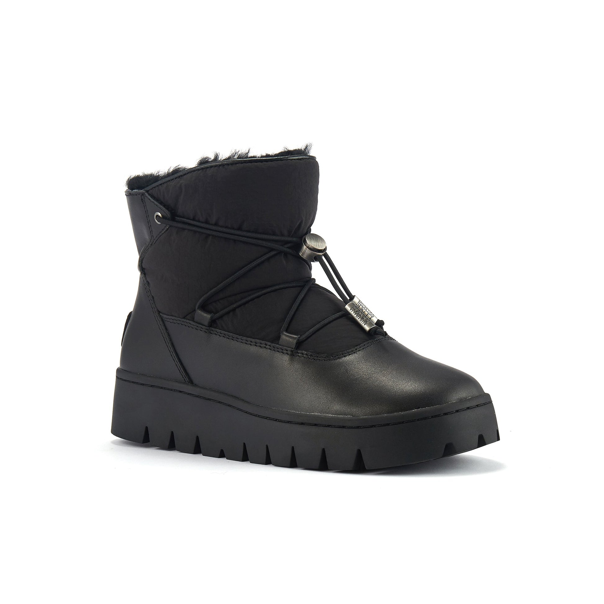 Ankle height pull on sheepskin fur lined snow boot with leather and padded quilt upper. Elasticated straps with metal tie.