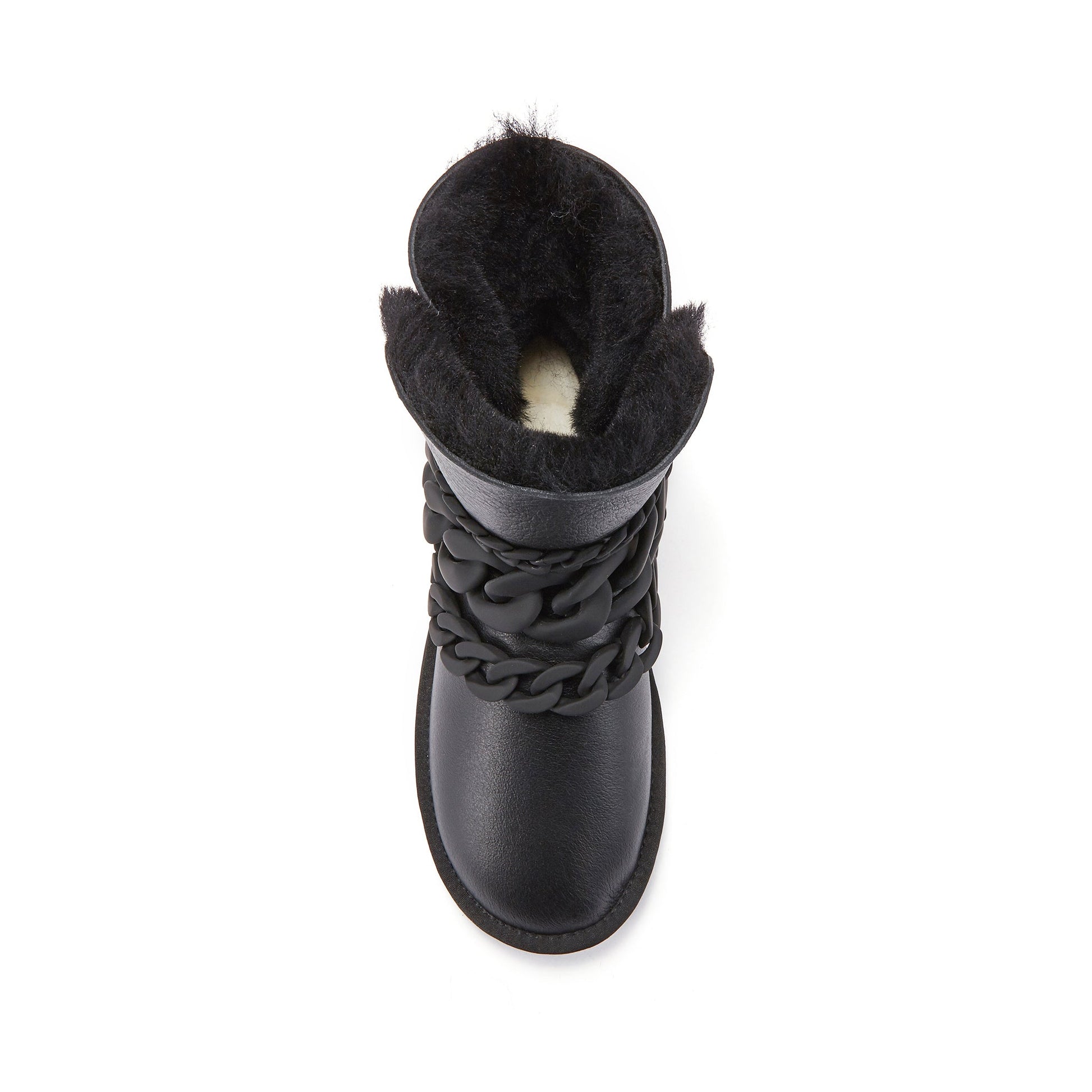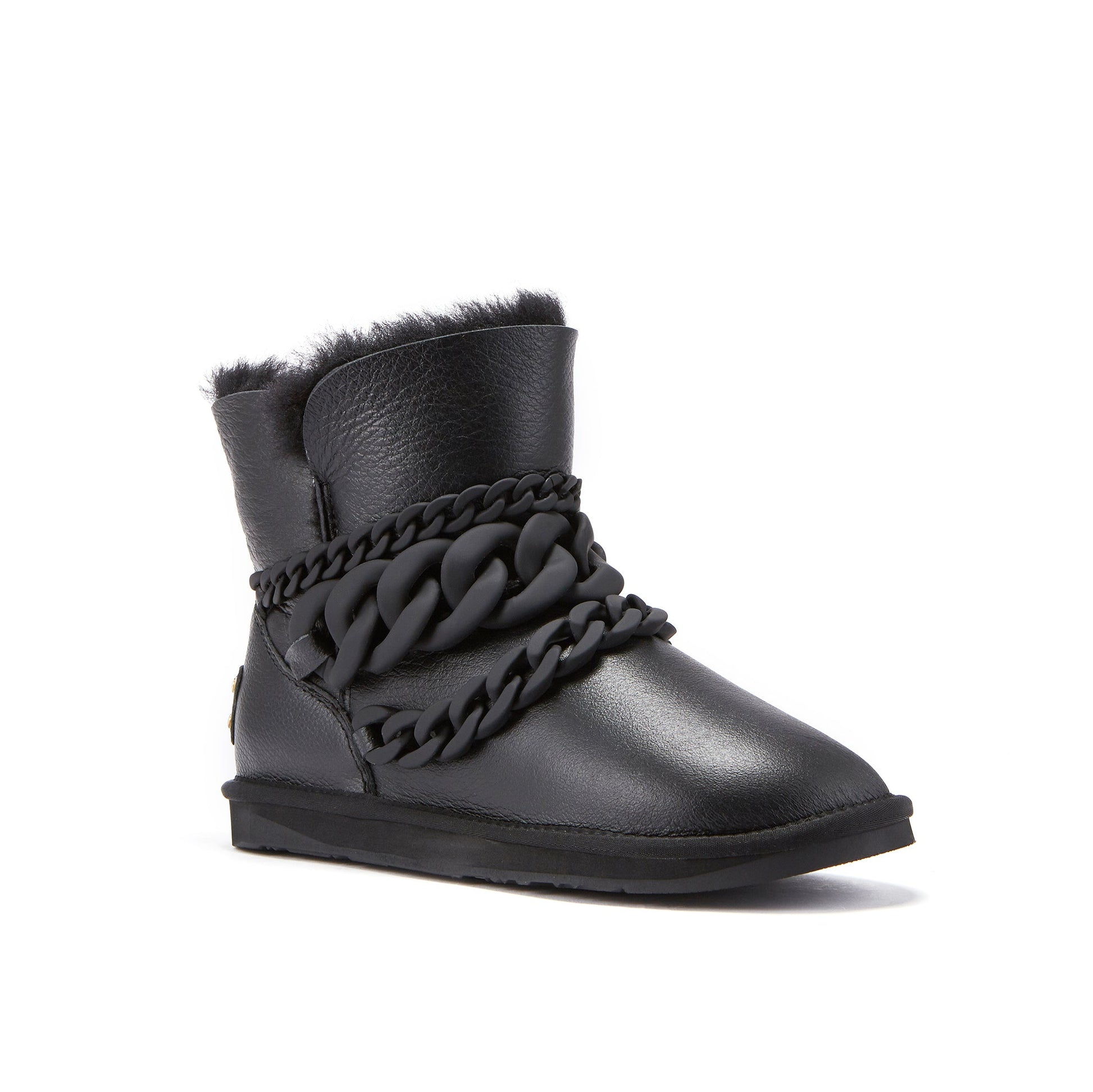 Short cut Alice is the perfect style for style and comfort. Soft leather upper with metal chain detail to the front.. Split cuff for easy pull on. Lined with super soft double face sheepskin.