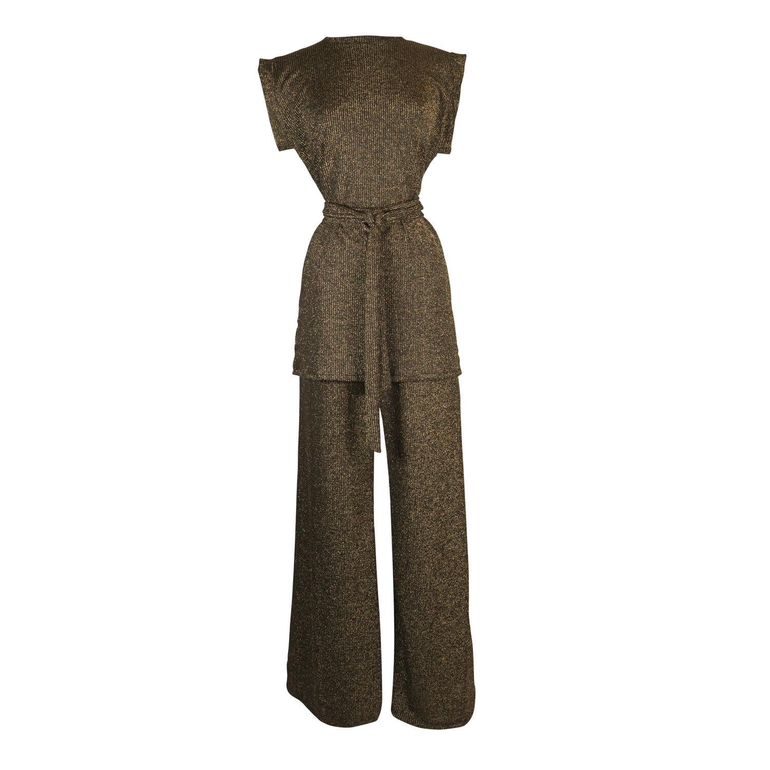 This ultra cozy tunic top and palazzo pant set was made from a black and dark metallic gold rib knit jersey. Featuring tab sleeves, side slits and an extended obi-style belt on the top, and pockets, elastic waist and a soft hidden drawstring on the bottoms. Standard inseam 32".