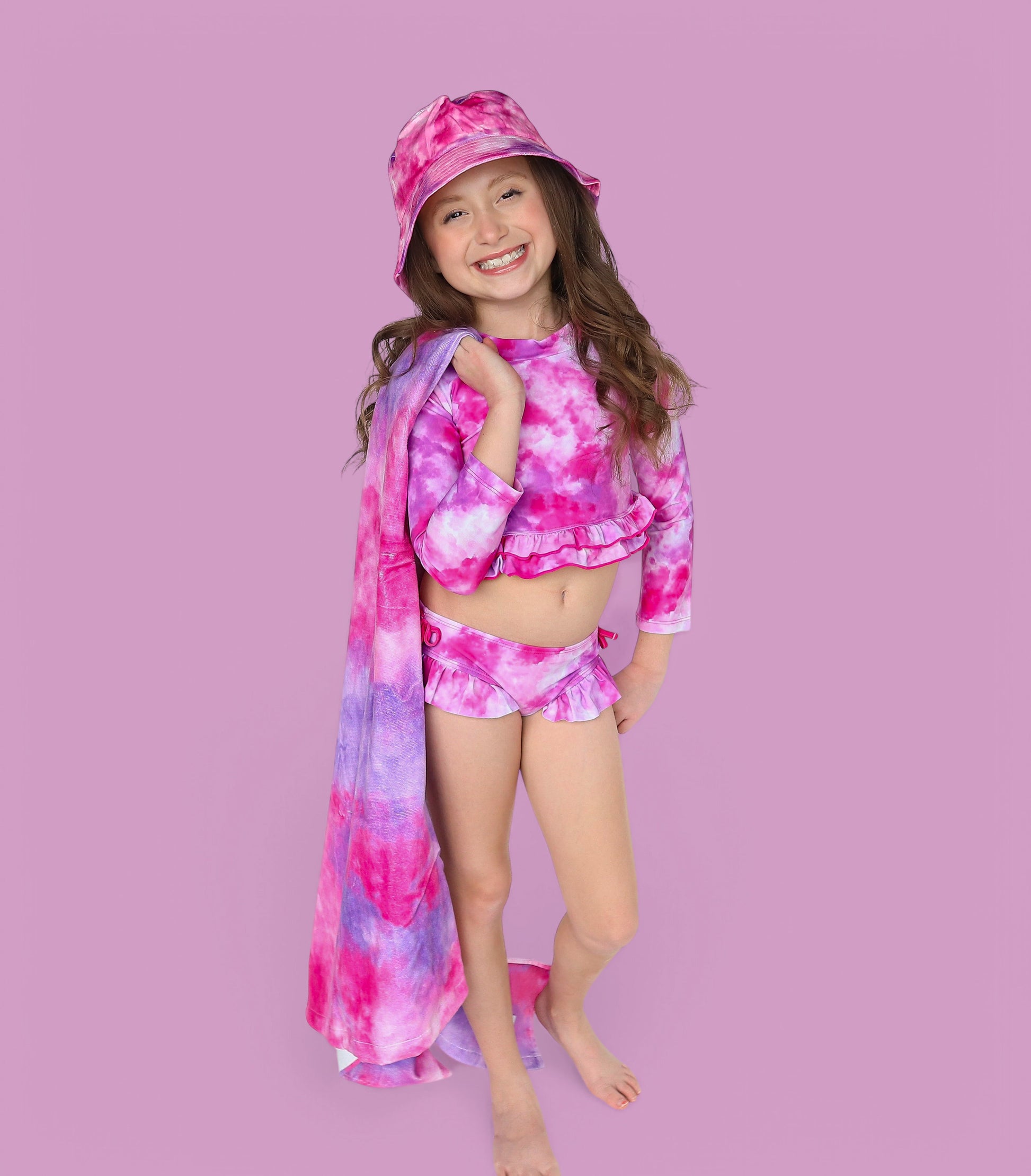 Get ready to make a splash in the Candy Clouds Dream 2-Piece Rash Guard Ruffle Swim Suit! This swimsuit is like a sweet daydream come to life, with its vibrant pinks and purples swirling in a dreamy, watercolor cloud design. The soft pastel hues are perfect for your little one to float through summer in style, whether they're building sandcastles or diving into the waves.