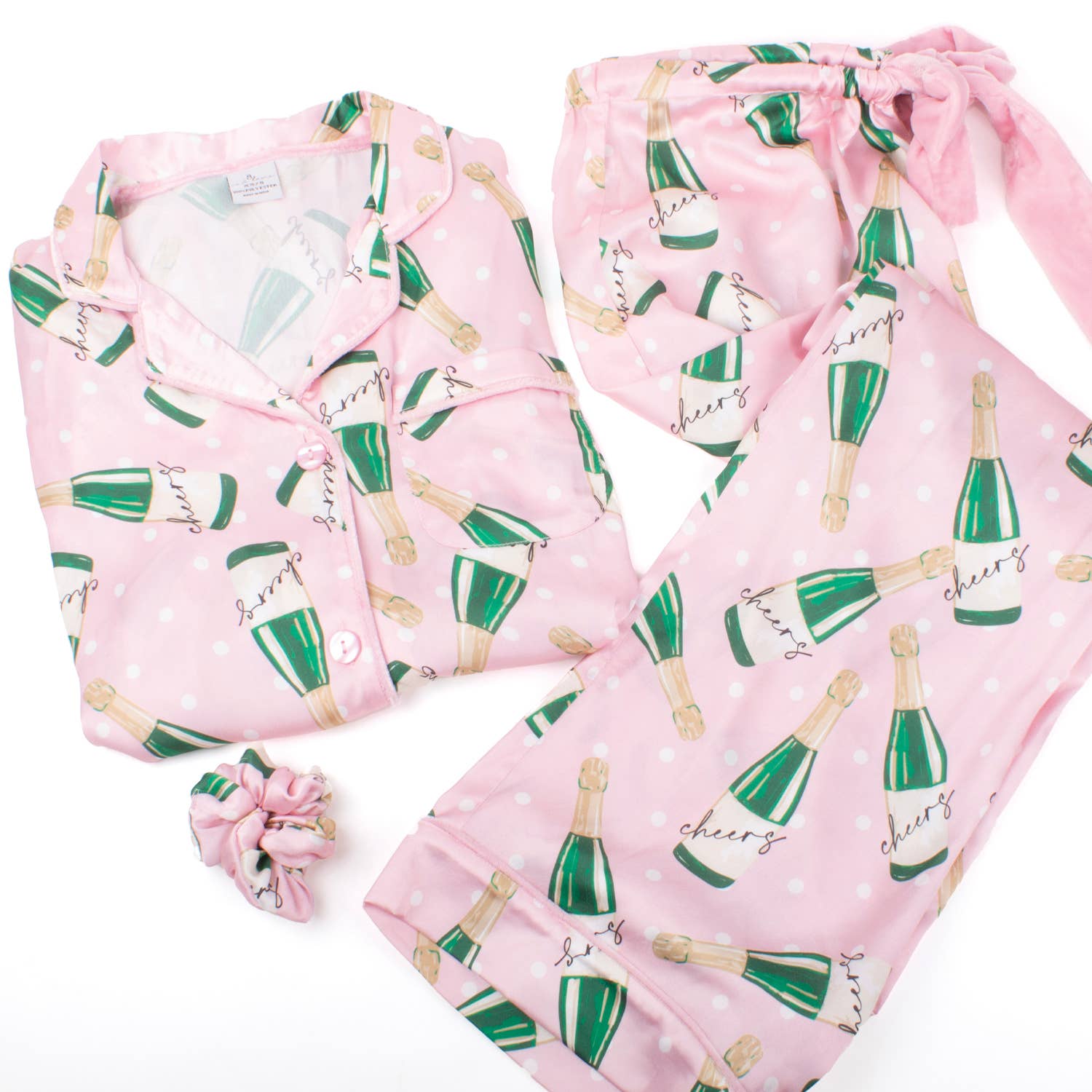 Experience pure luxury and comfort with our elegant Champagne Dot Satin PJ Set. Relax in the gorgeous breathable satin fabric as velvet detailing and bow-tie waistband accents provide timeless, tasteful elegance. Featuring a long sleeve top and pants constructed of 100% satin polyester, this set is designed to lock in warmth while feeling light and comfortable against your skin.