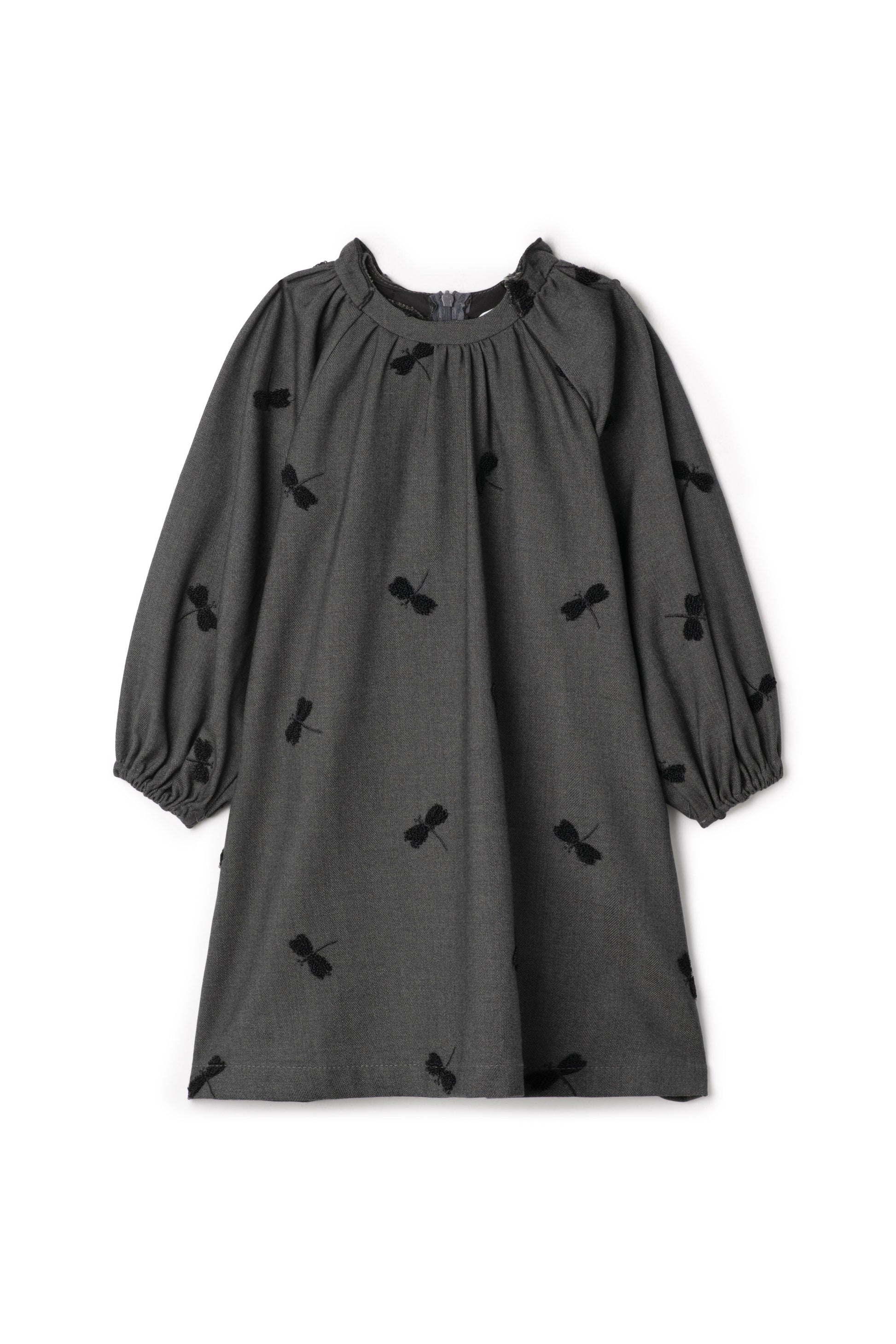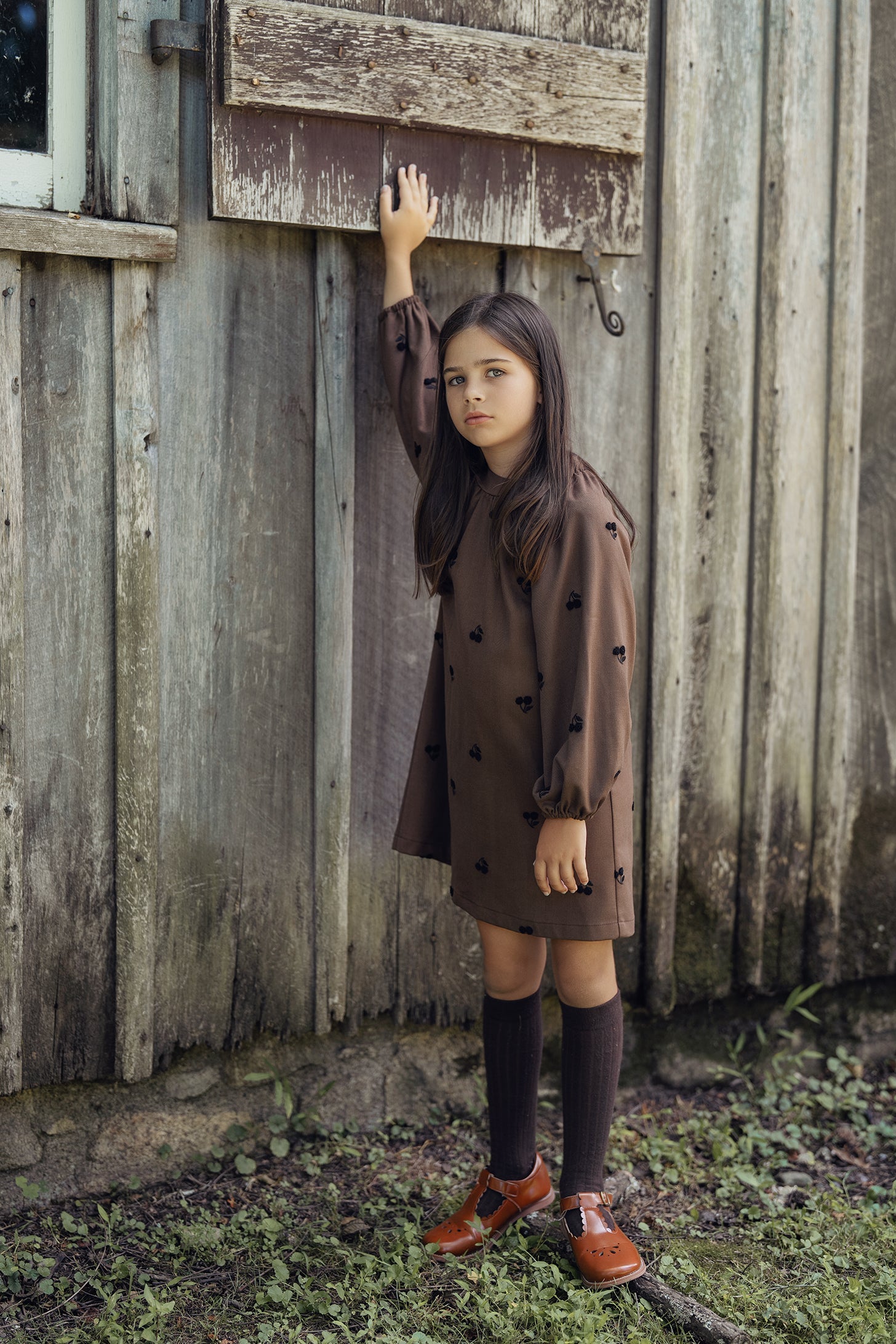 Girls cherry applique dress with smocked neckline, center back invisible zipper and elastic at cuffs .ֲ