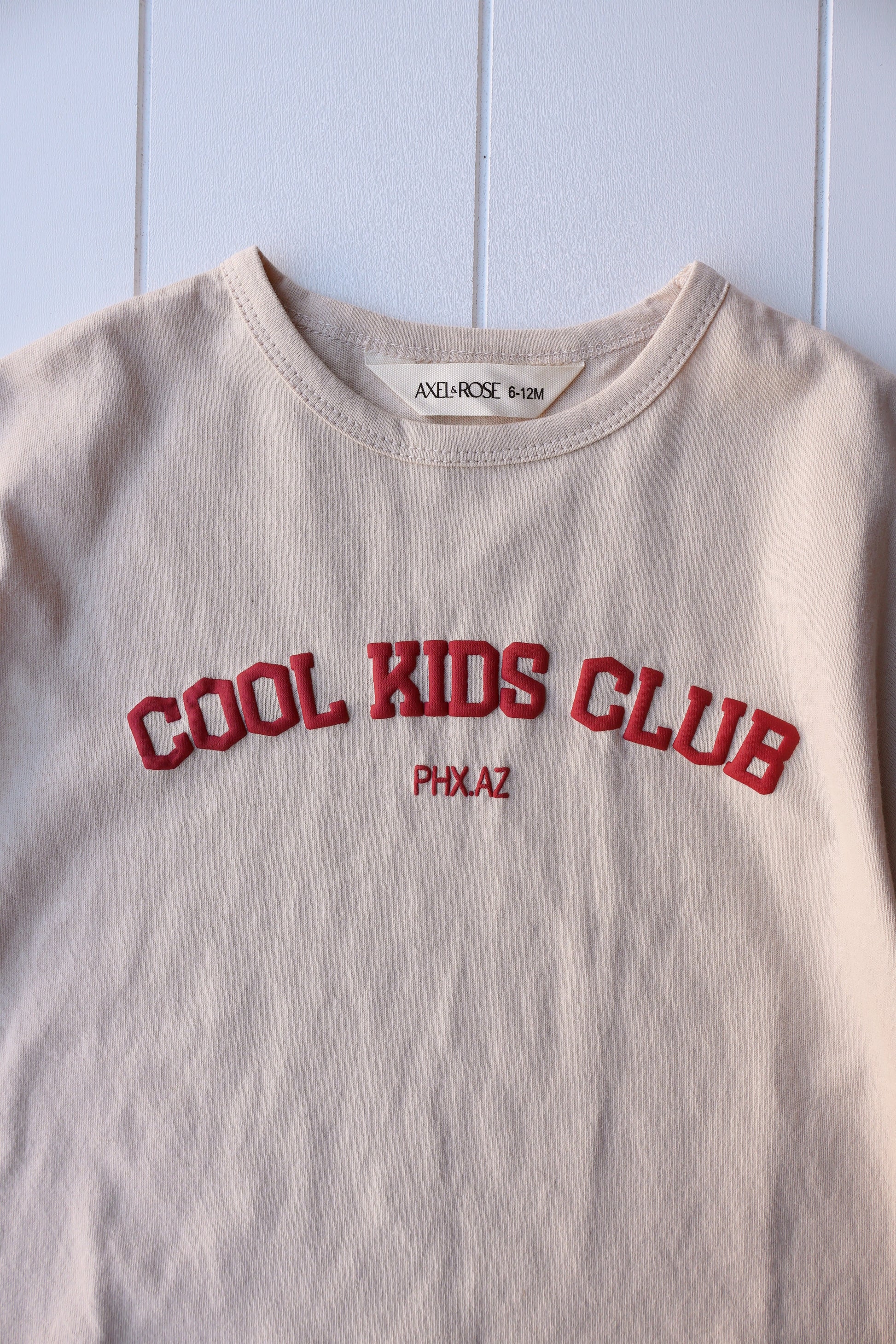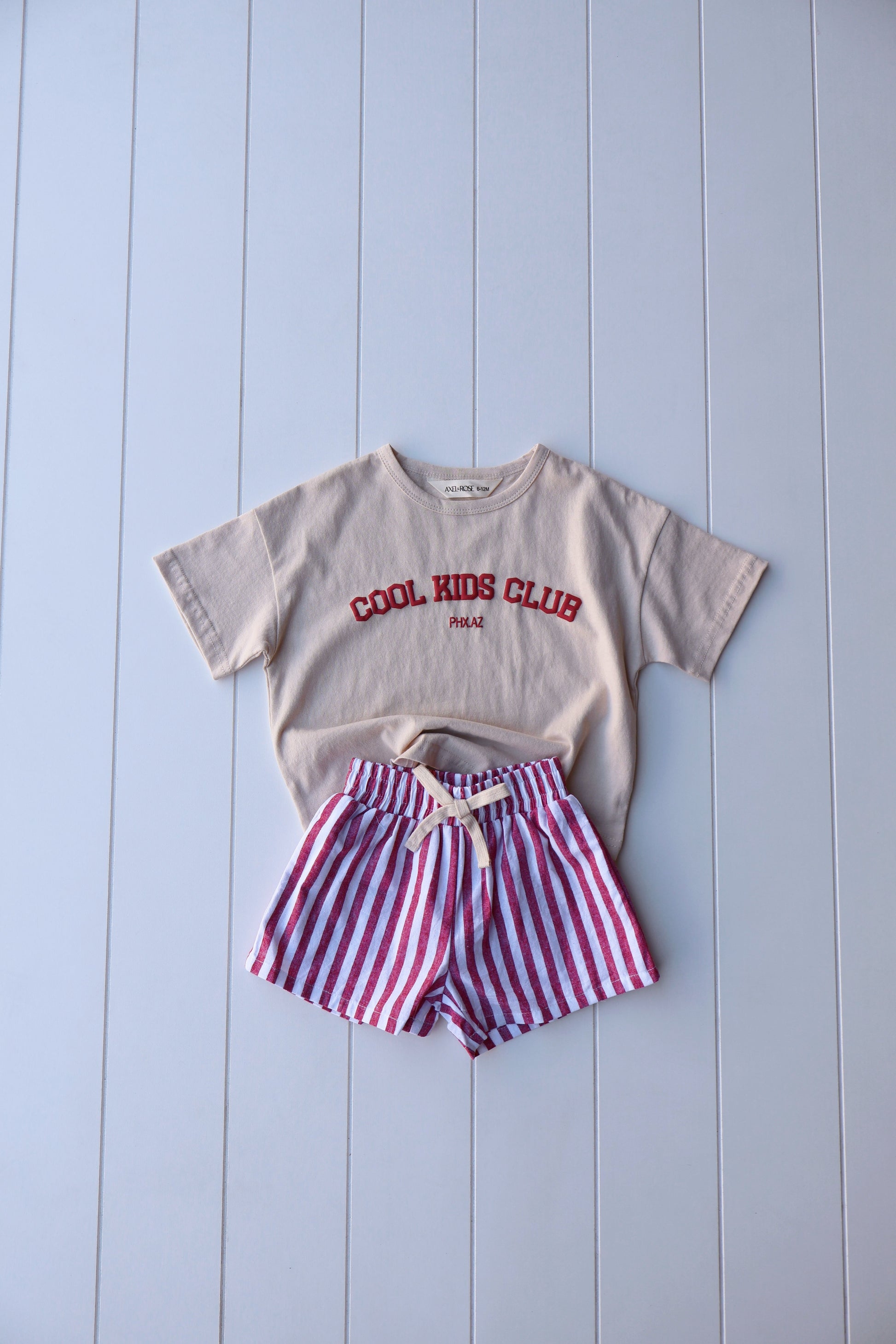 Elevate your child's style with our Cool Kids Club Tee. Made from 100% soft cotton, this neutral shirt features a red puff print on the front. The slight oversized fit adds comfort while matching perfectly with our red linen shorts. Join the coolest club in town with this stylish tee.