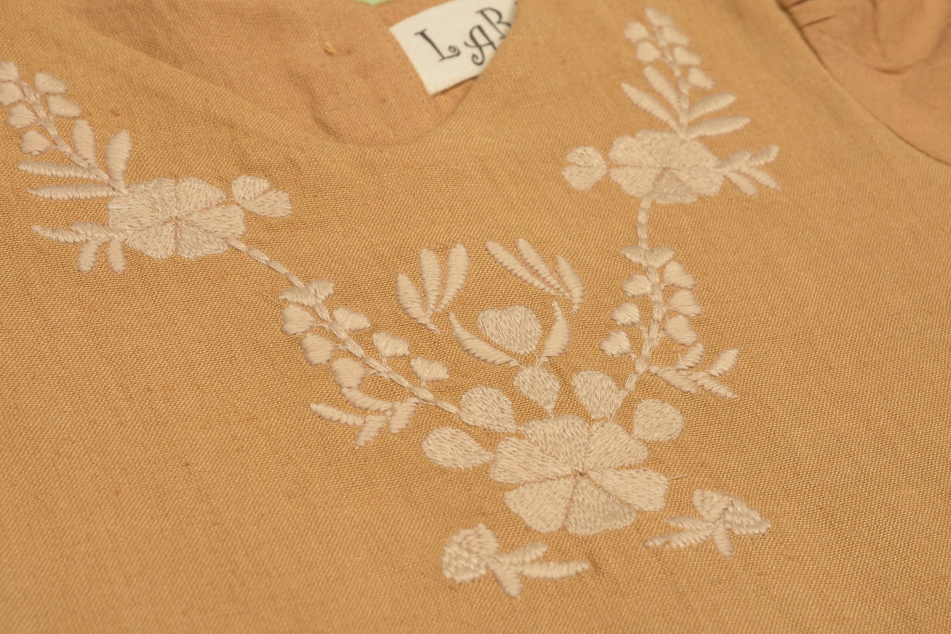 Be bold and stand out from the crowd with this Mustard colored Rayon Linen Dress featuring a hand embroidered yoke, functional pockets and puff sleeves. Pre-order now for an edgy addition to your wardrobe.