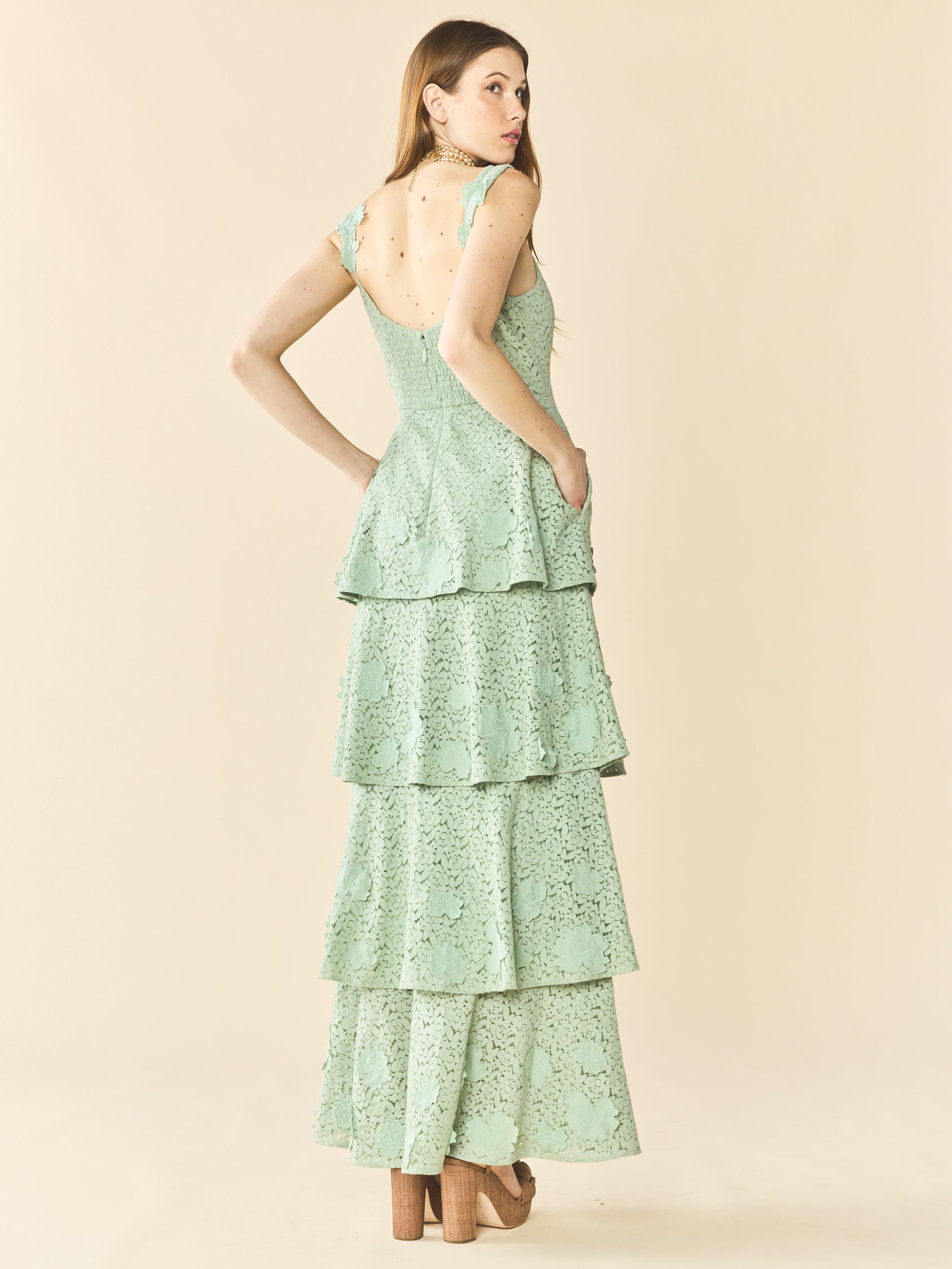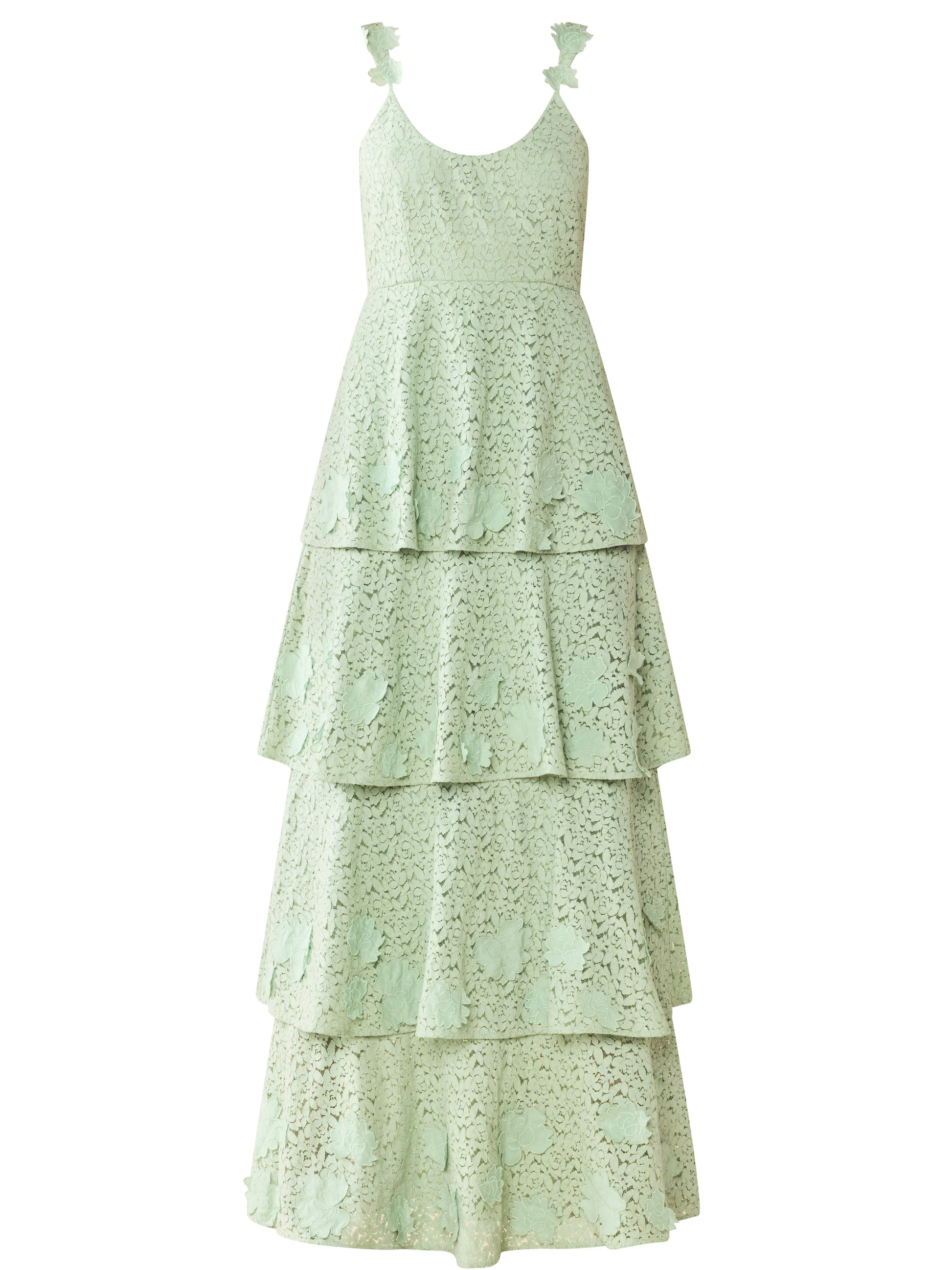 Meet Emmy. A tiered dream dress in soft mint lace, designed to twirl. Embroidered floral appliqué blooms finish every layer, giving texture to the easy, feminine silhouette. Floral-detailed straps and hidden pockets—because beauty and function should go hand in hand. The kind of dress you reach for when the RSVP says garden affair.