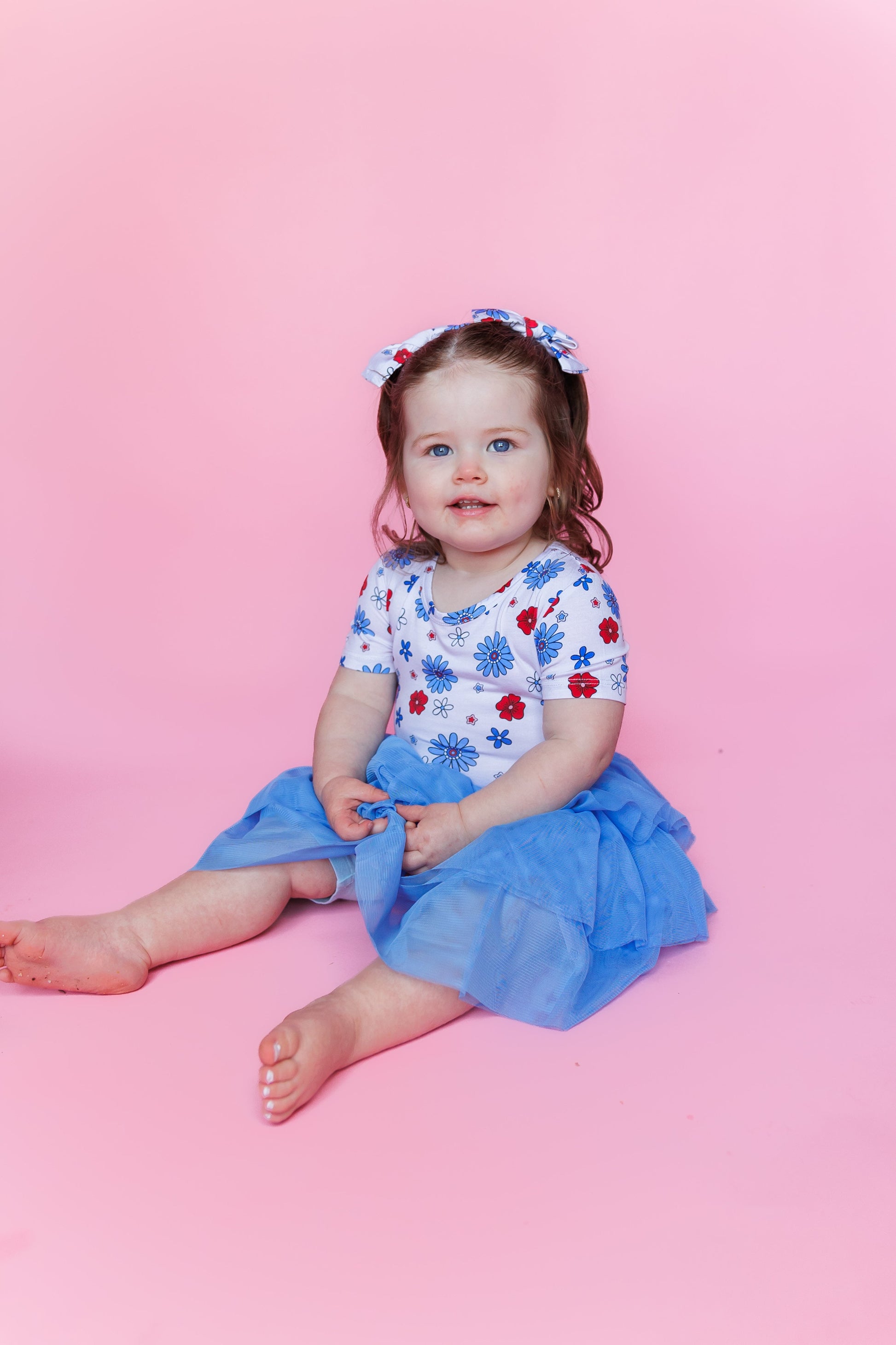 Unleash your little one's patriotic spirit with our Exclusive Freedom Blooms Tutu Dress! Made of soft bamboo material, this short-sleeve dress is not only comfortable but also features a fun and unique floral print perfect for July 4th celebrations. Let her twirl in style with our tutu dresses for girls!