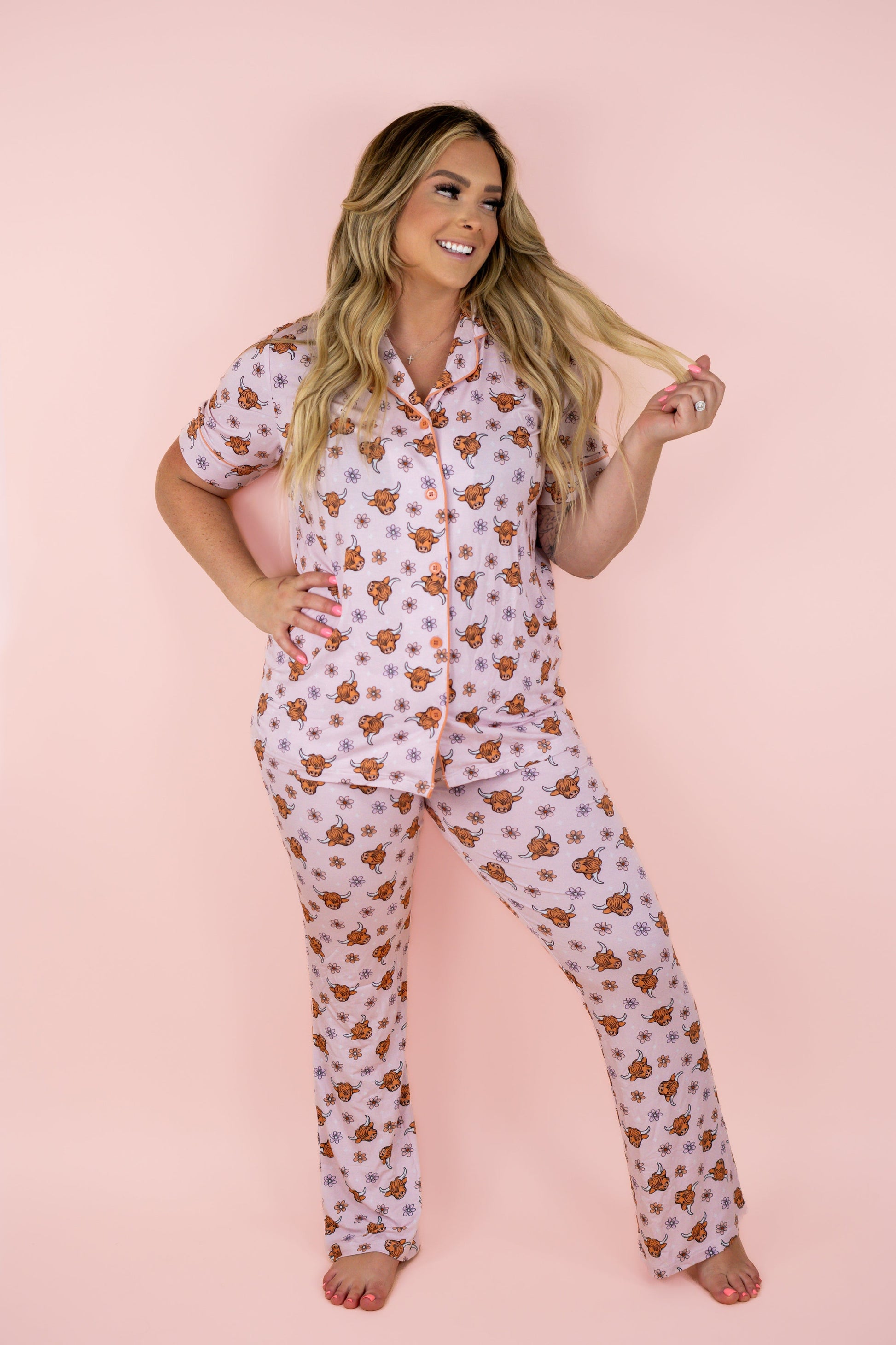 Treat yourself to our Exclusive Highland Cutie Women's Relaxed Flare Dream Set. Made with soft, bamboo material, it's perfect for lounging or sleeping. The playful cow print adds a quirky touch to the short sleeve, button down design. Feel comfortable and cute at the same time!