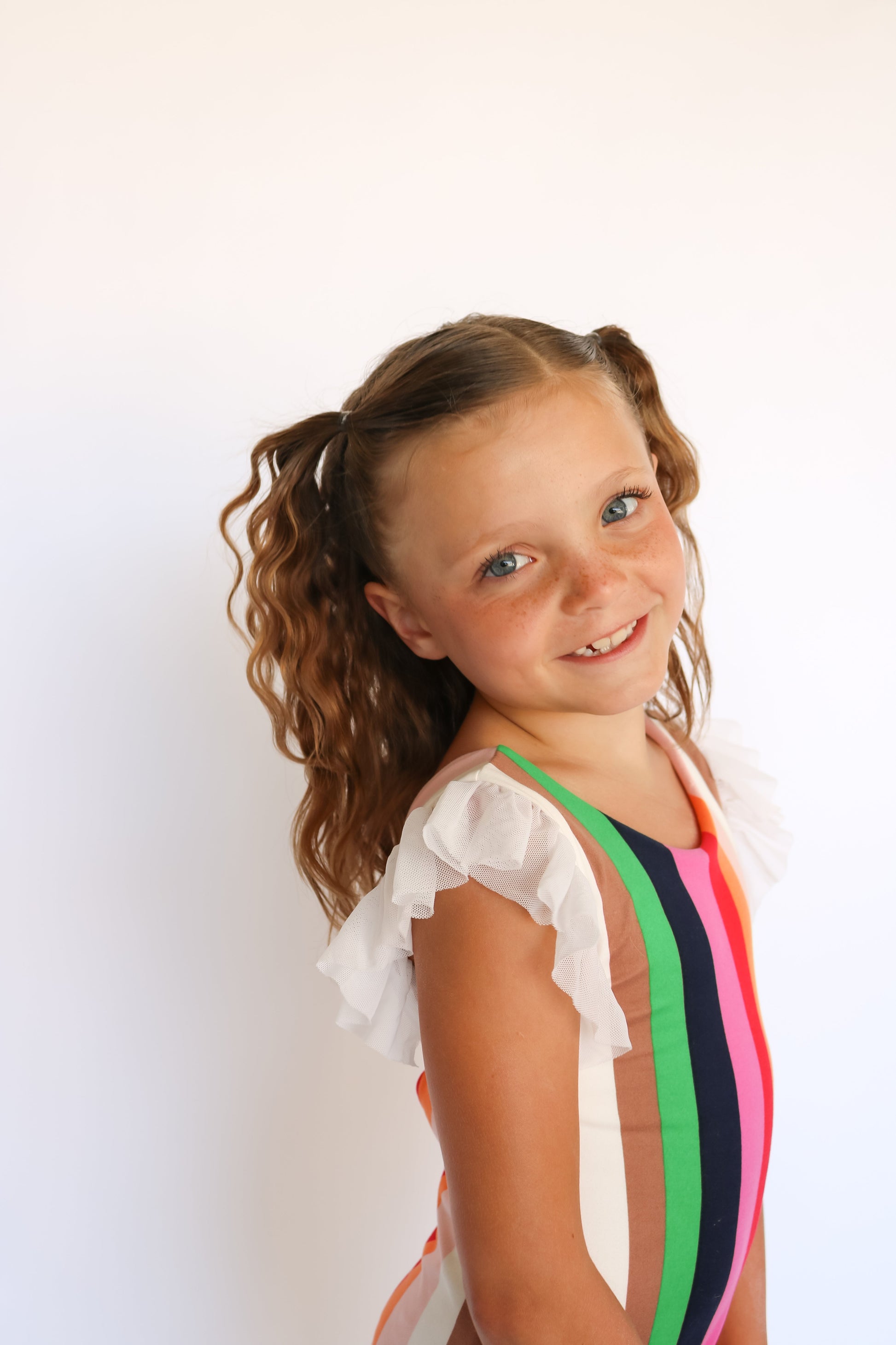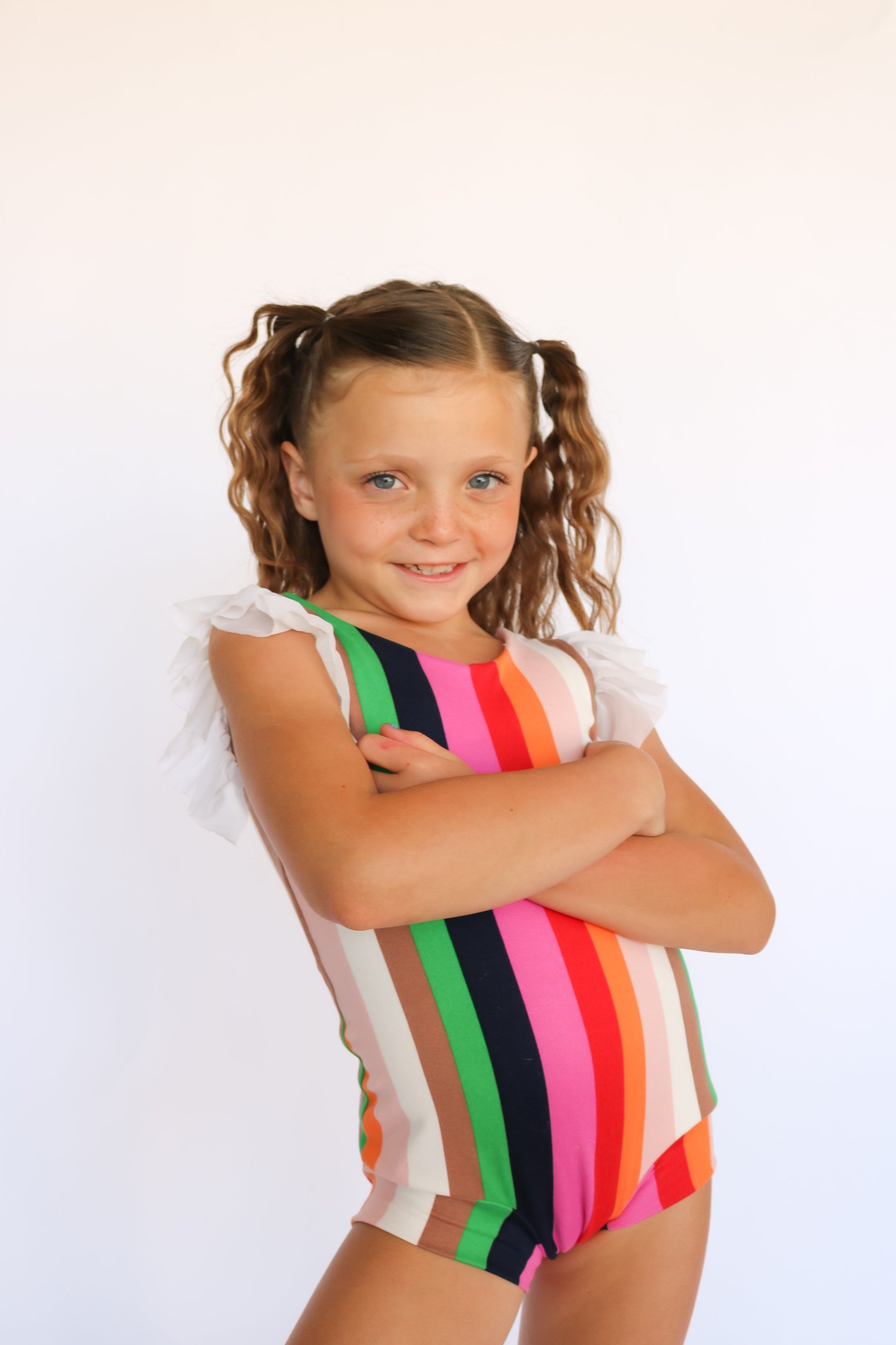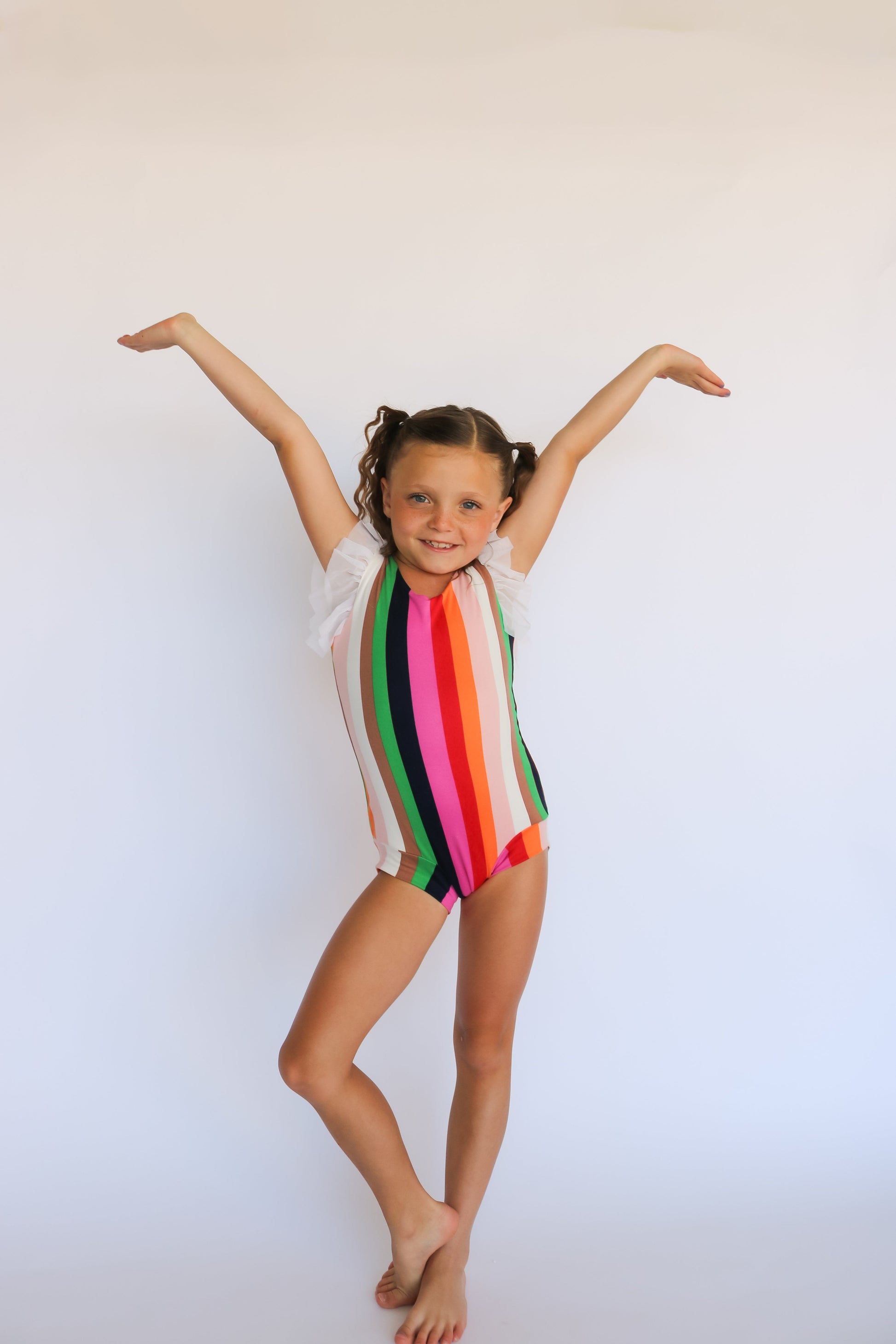 Introducing the Fiesta leotard: all the fun without the fuss! This one-piece stripe leotard features a unique 3-strap back and playful mesh flutter sleeves for added flair. Get ready to turn heads and make a statement on the dance floor!