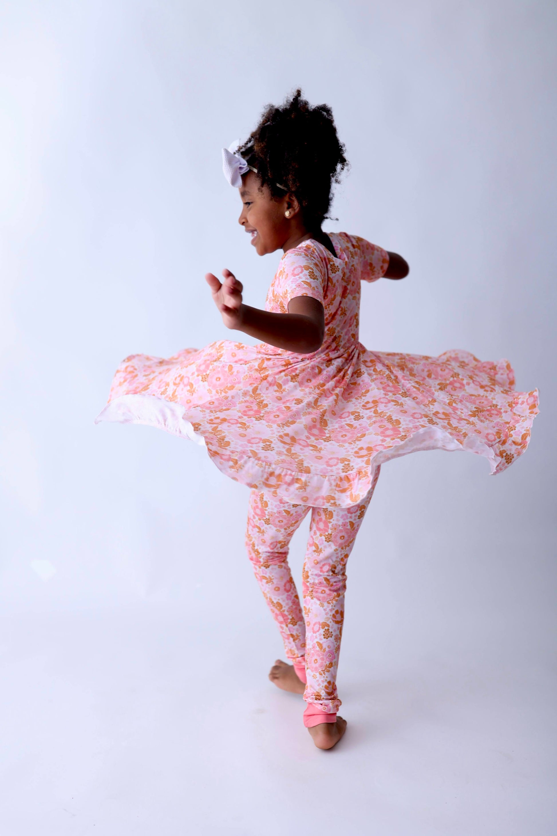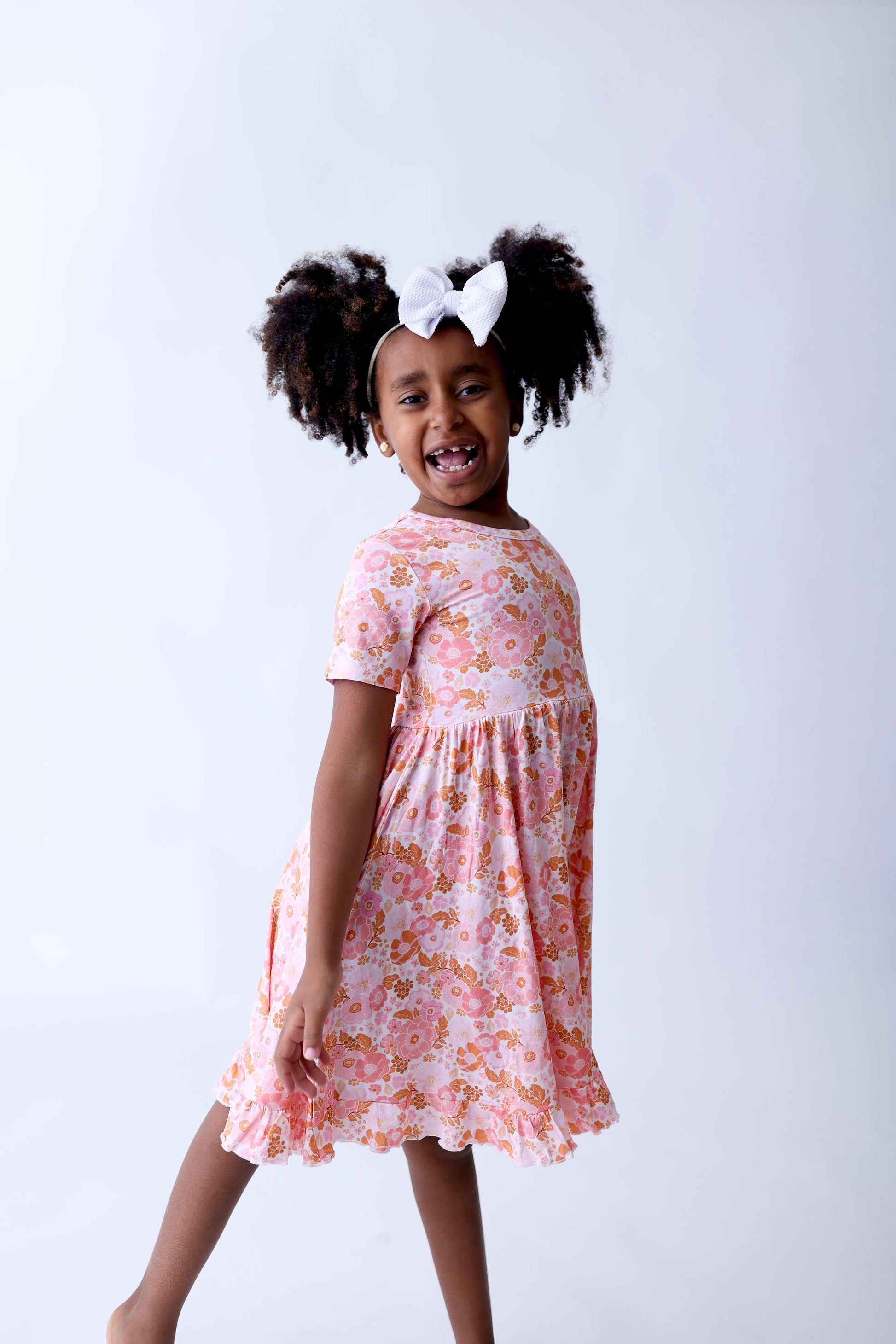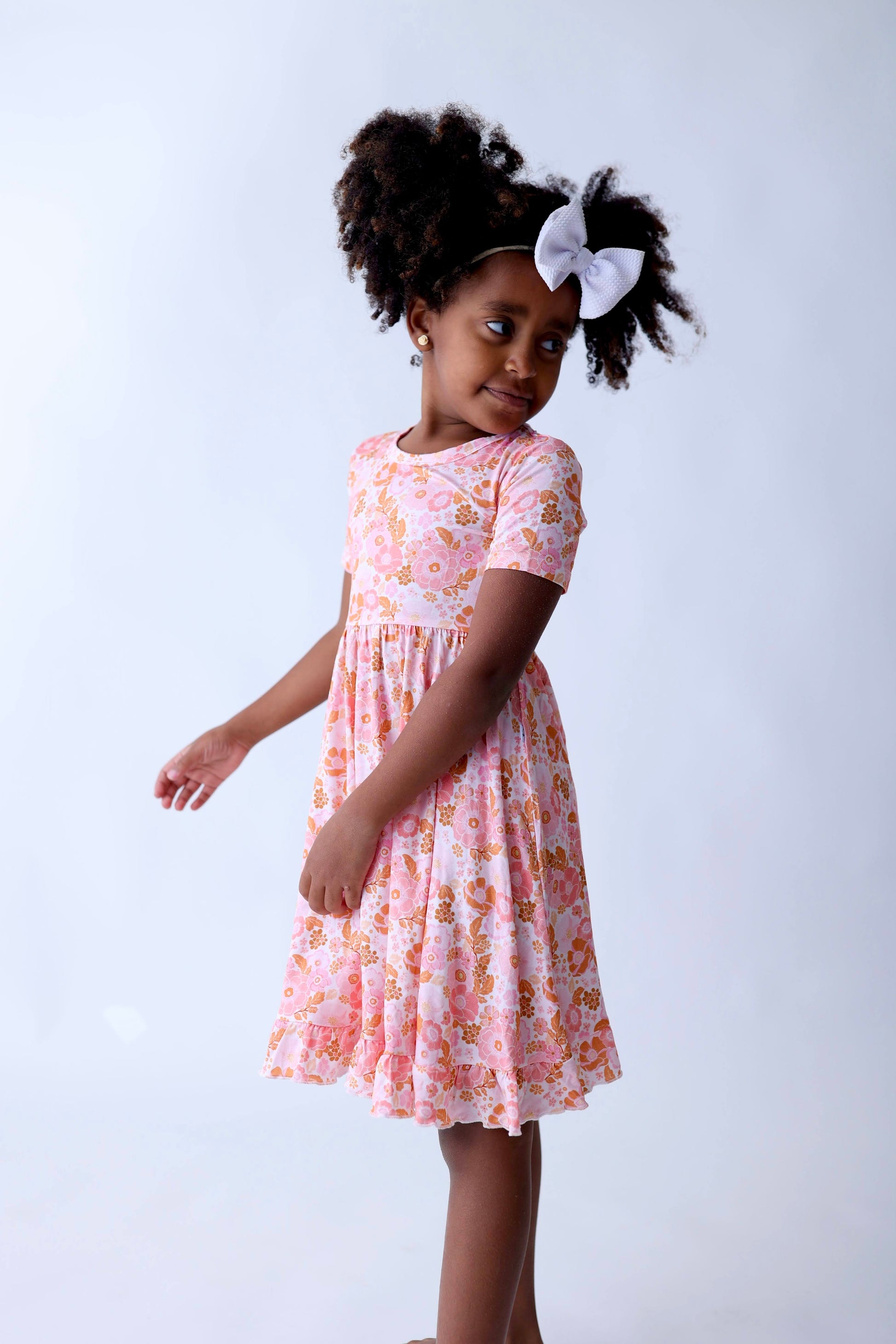 Feel like a flower child in this dreamy ruffle dress! With a soft bamboo material and a romantic floral design, you can spin and swish to your heart's content. Sweet short sleeves add the perfect finish to your twirl-worthy look!