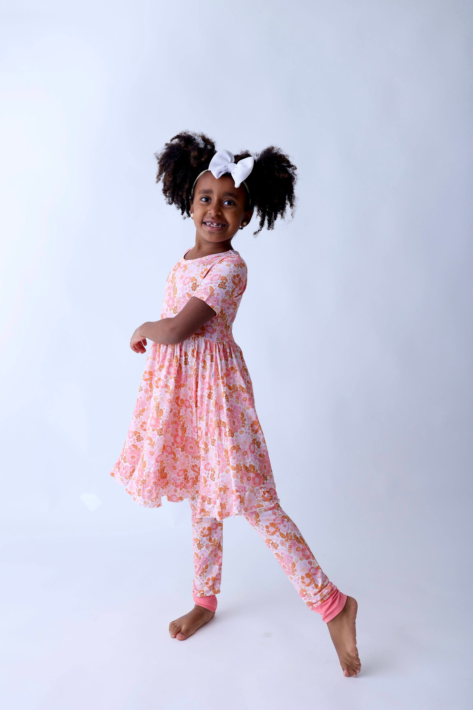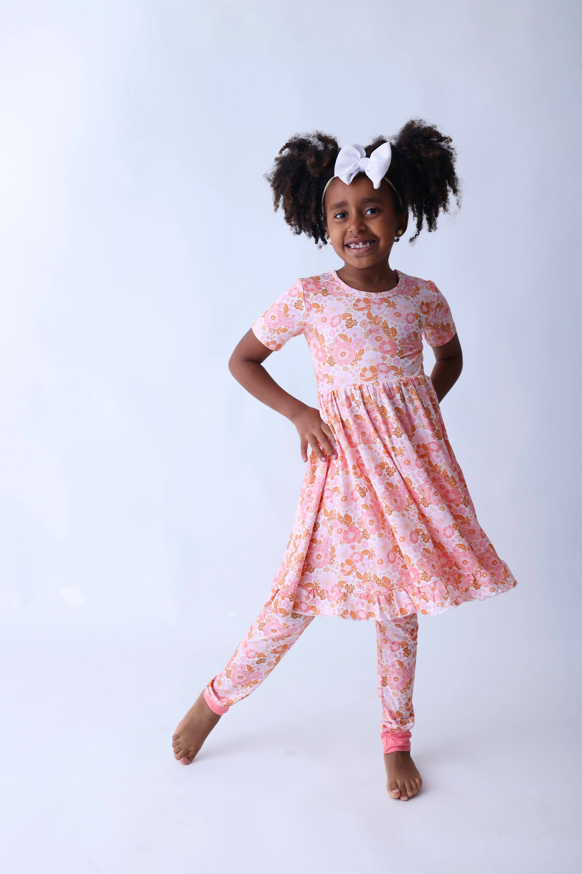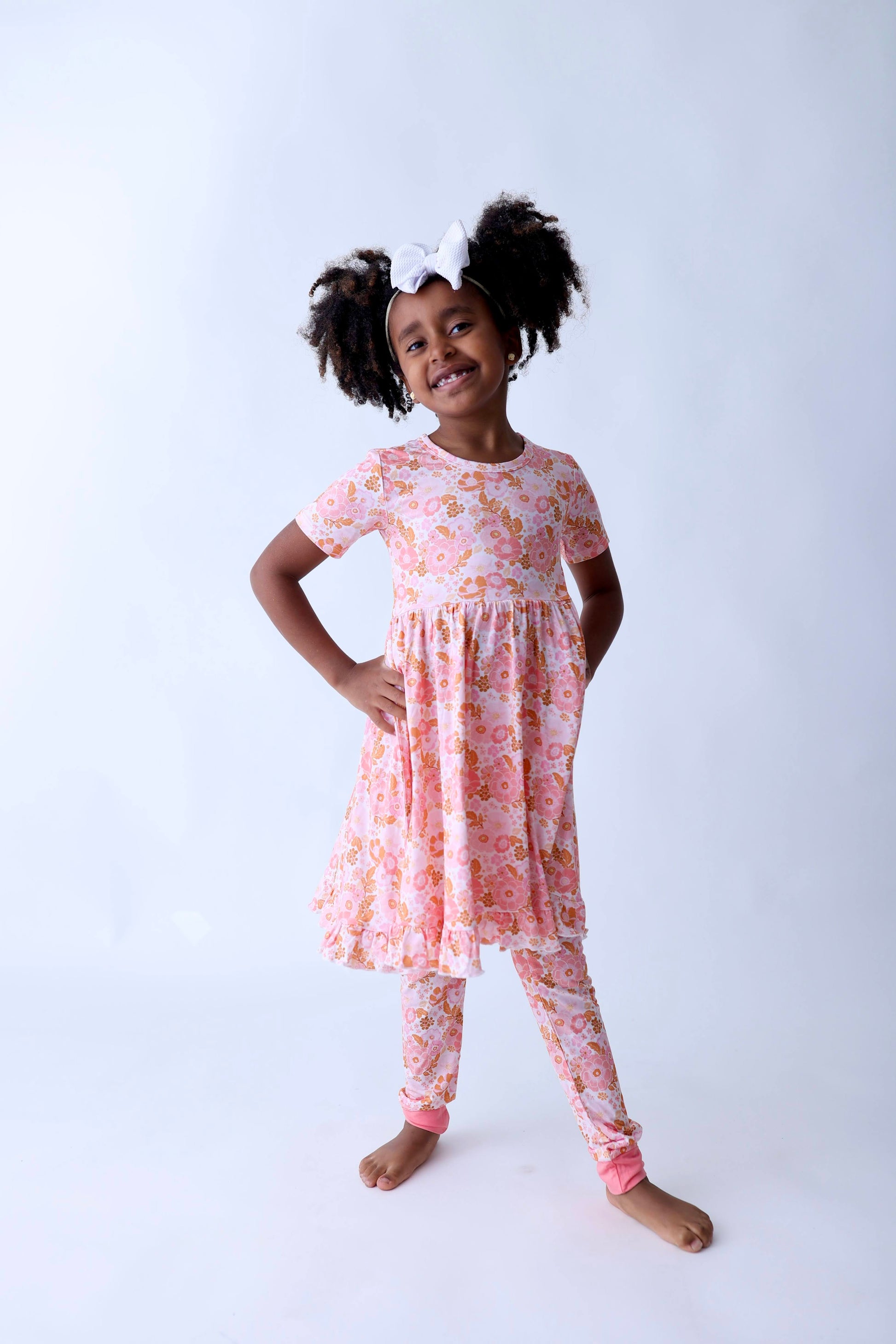 Feel like a flower child in this dreamy ruffle dress! With a soft bamboo material and a romantic floral design, you can spin and swish to your heart's content. Sweet short sleeves add the perfect finish to your twirl-worthy look!