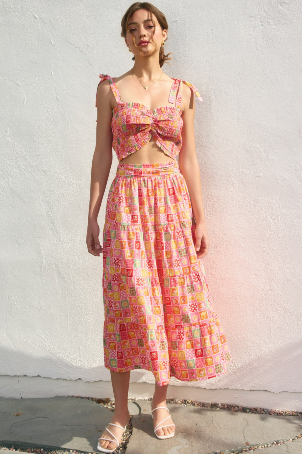 Tiered, tied, and totally twirl-worthy. This Fruit Skirt is serving sunshine with every step. Featuring a juicy fruit print, this skirt flows with a breezy tiered silhouette. The tucked waistband detailing and sash tie closure add a polished touch, while the smocked back ensures a comfy, flexible fit. Perfect for summer picnics, beach boardwalks, or dressing up for sunny days.