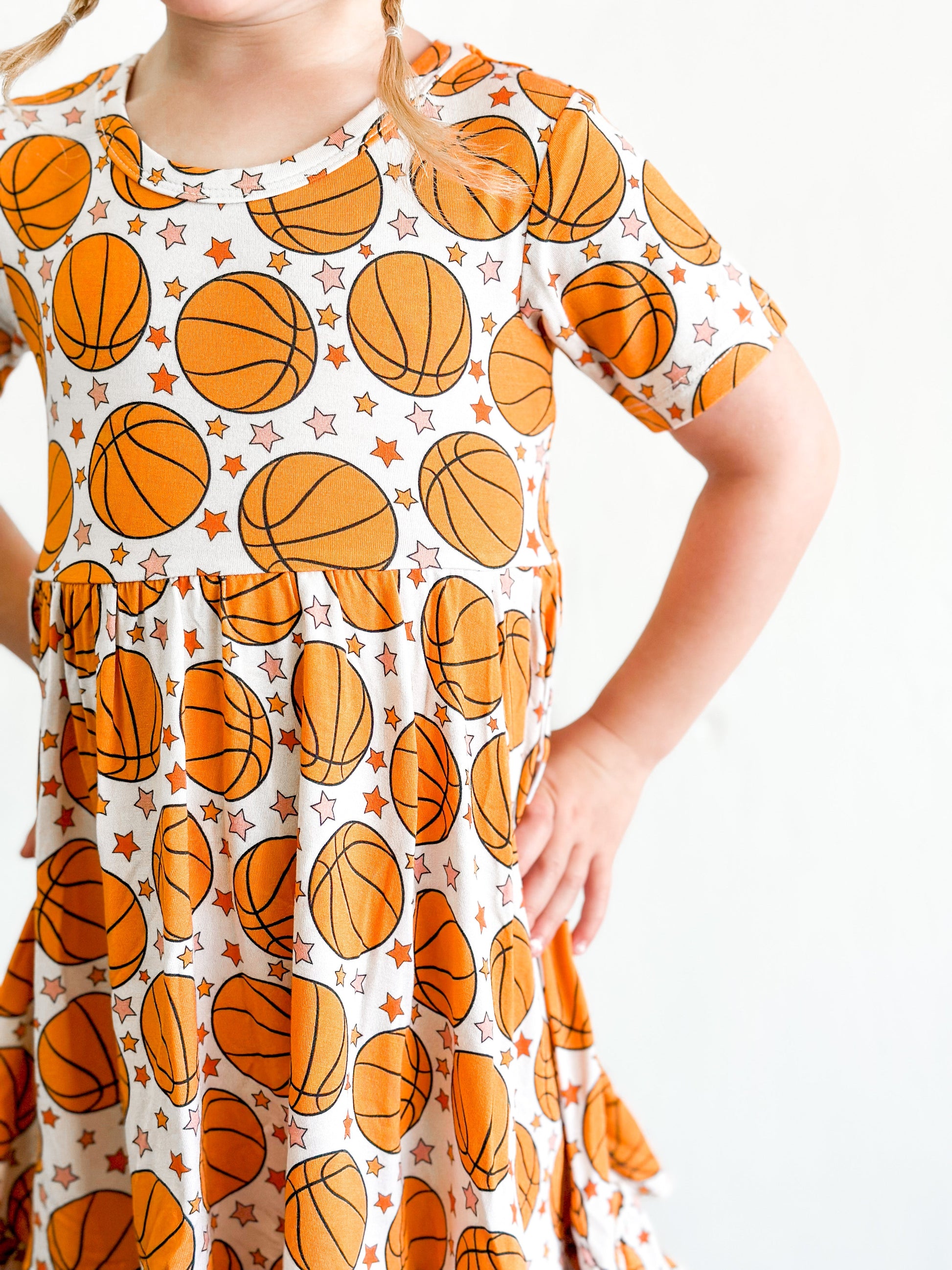 Ready to show off some court-ready style? Get your little sports fan ready for game time in our Dream Ruffle Dress! Featuring a fun basketball print and twirl-able short sleeves, she'll be ready to shoot (and score!) in comfort with the bamboo material. Let your little MVP shine on the court and off!