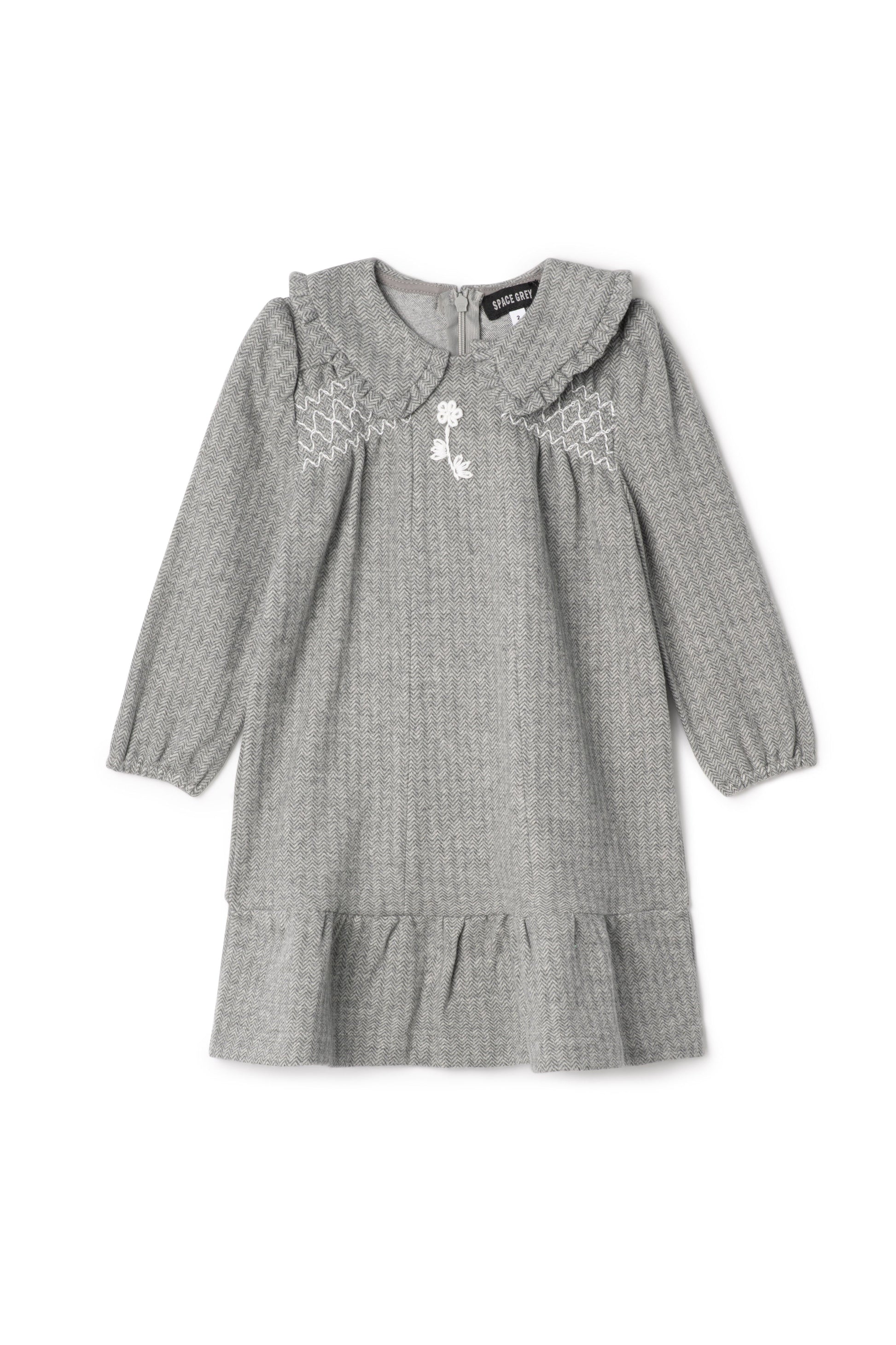 Girls long sleeve herringbone stretch dress with center front floral stitch wide frilled collar, center back invisible zipper and elastic at cuffs. ֲ