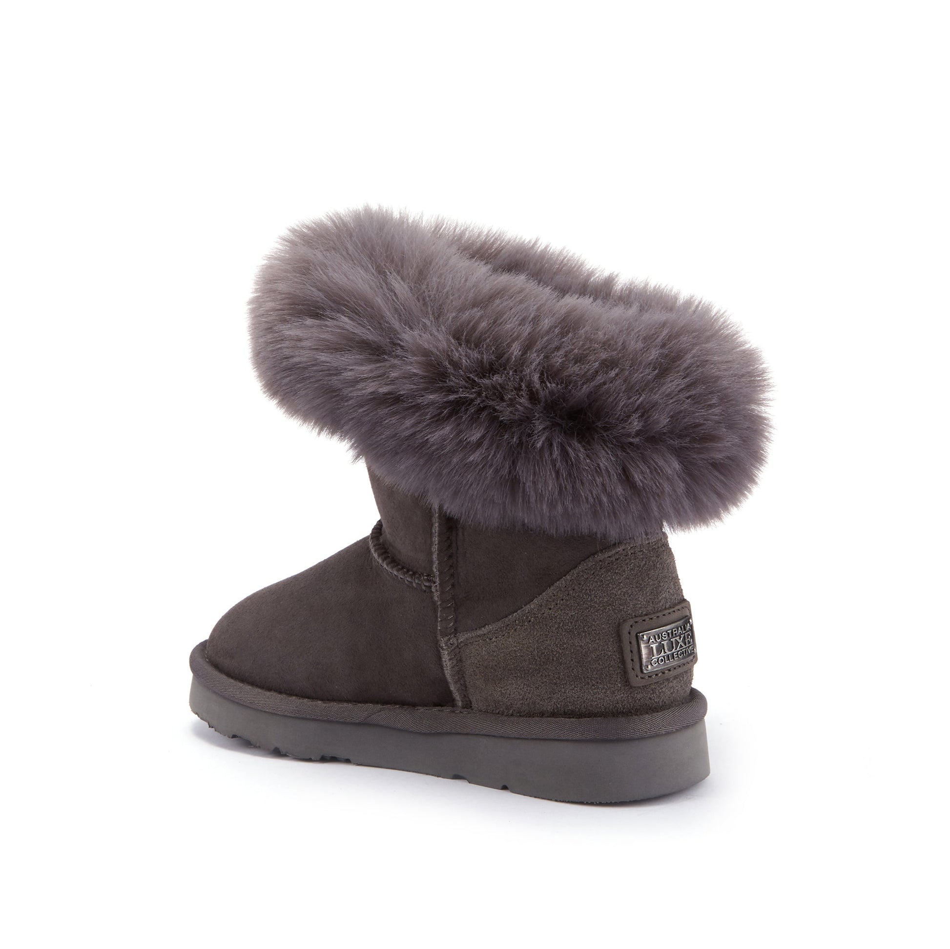 Luxe's iconic Cosy Xtra Short silhouette in a mini me version with a luxe faux fur cuff. Suede upper with super soft sheepskin fur lining.