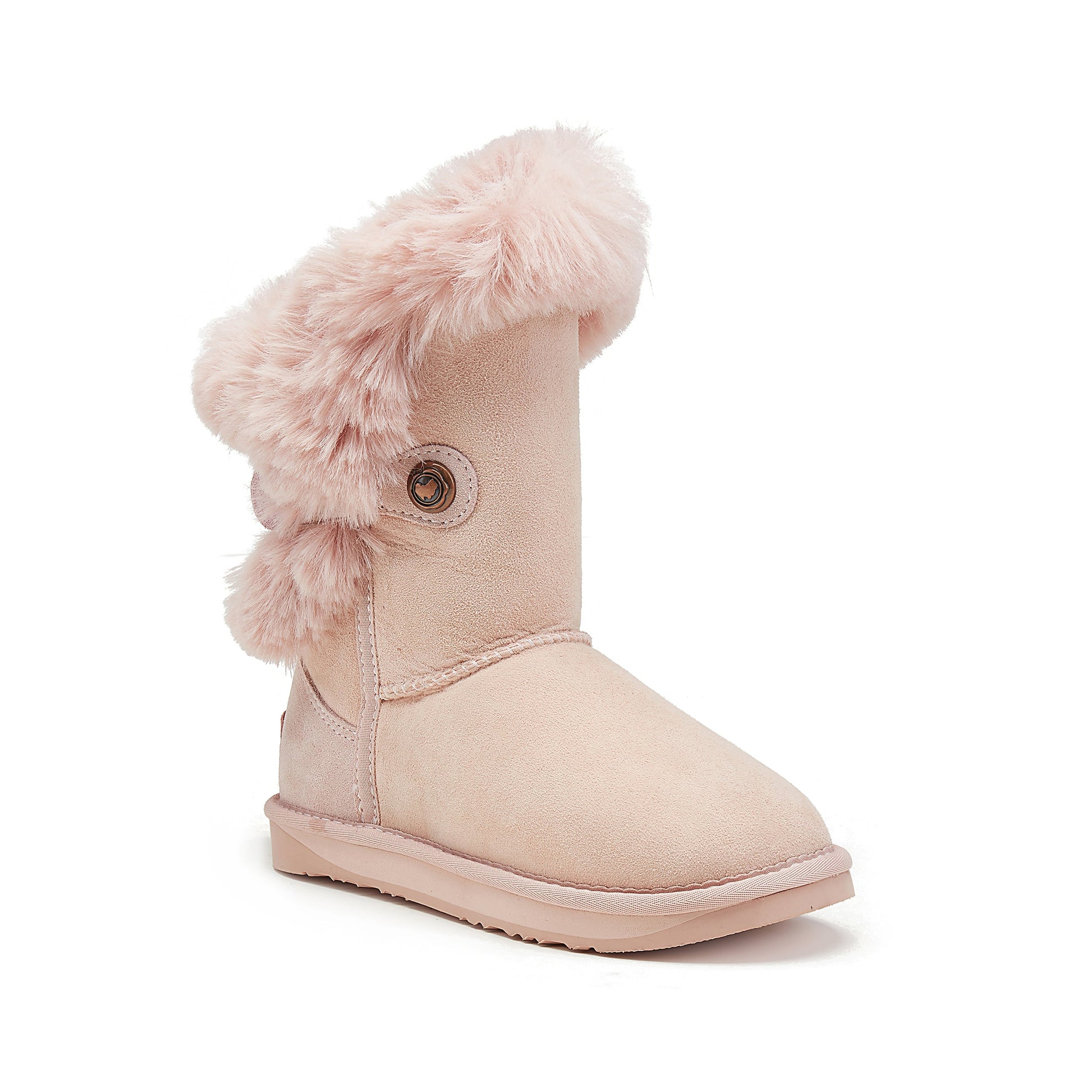 Luxe classic silhouette in a mini me version, Kids Nordic Short is the perfect mid calf length winter style. Suede outer, double face grade A sheepskin and super soft and cosy Luxe faux fur wrap around detail. Metal button and cord lace side fastening.