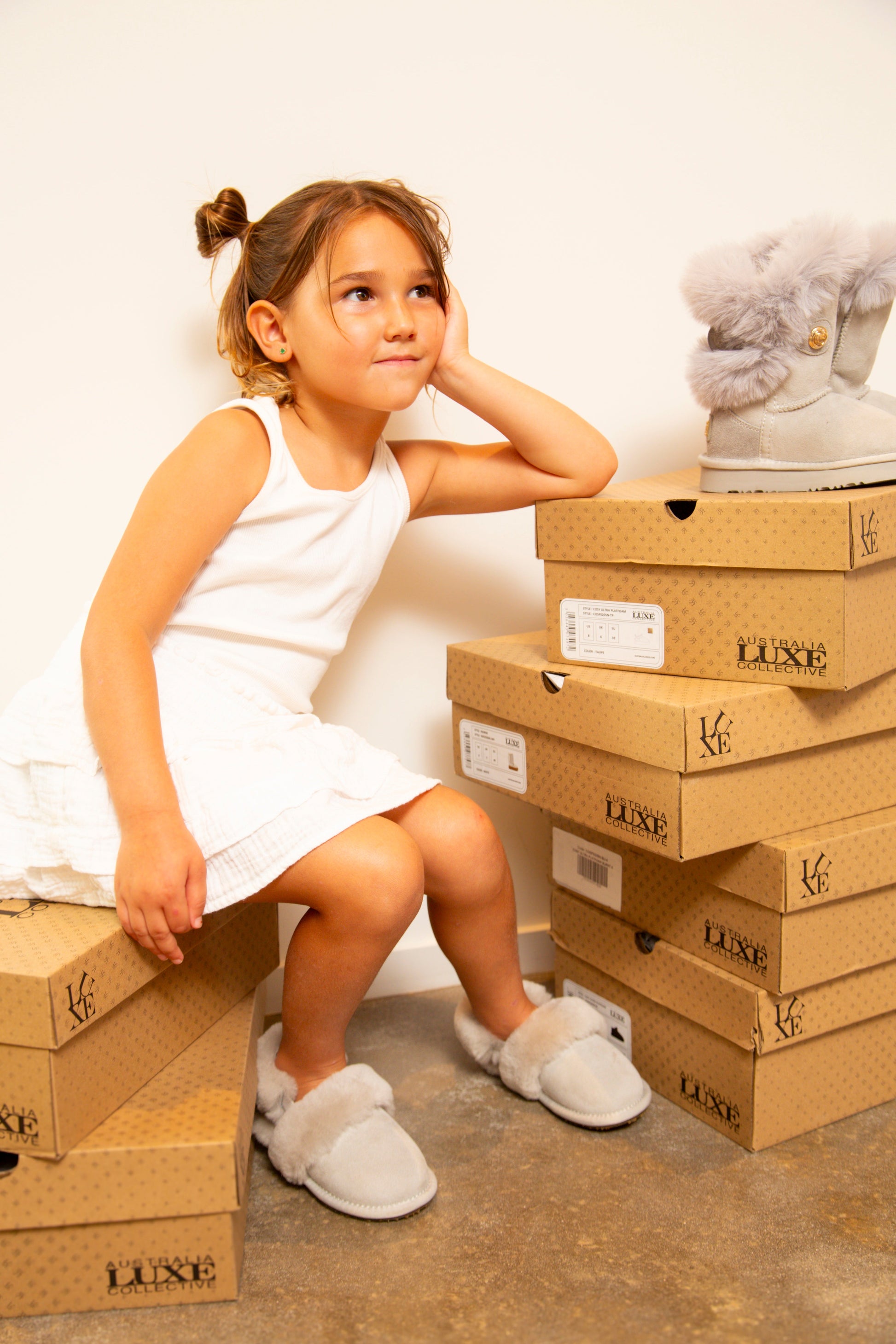 Super cute slip on kids mule sling back slipper with suede upper, faux fur cuff and super soft natural sheepskin fur lining. Detachable, adjustable, shearling strap in Luxe soft, cosy, faux fur.