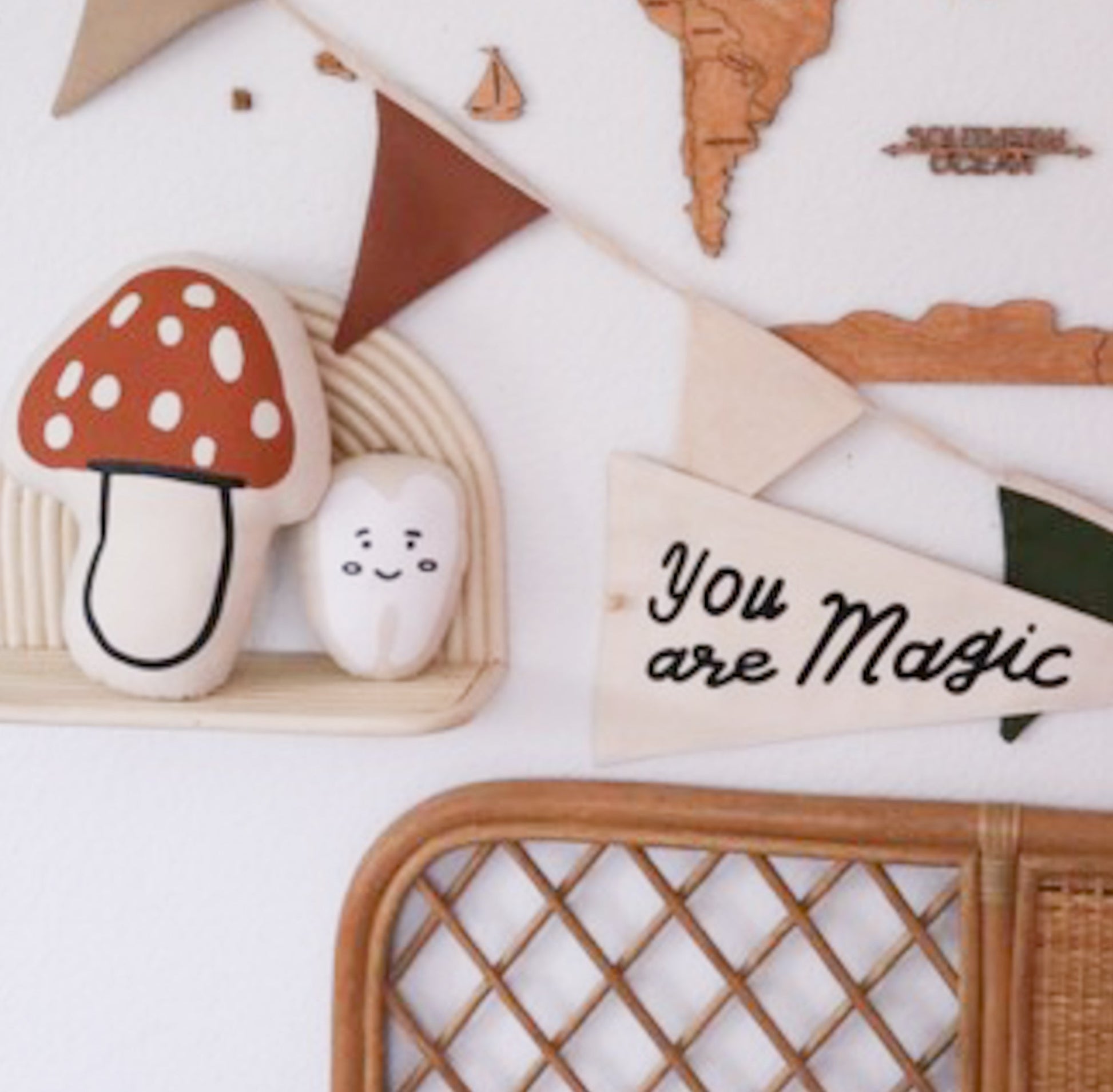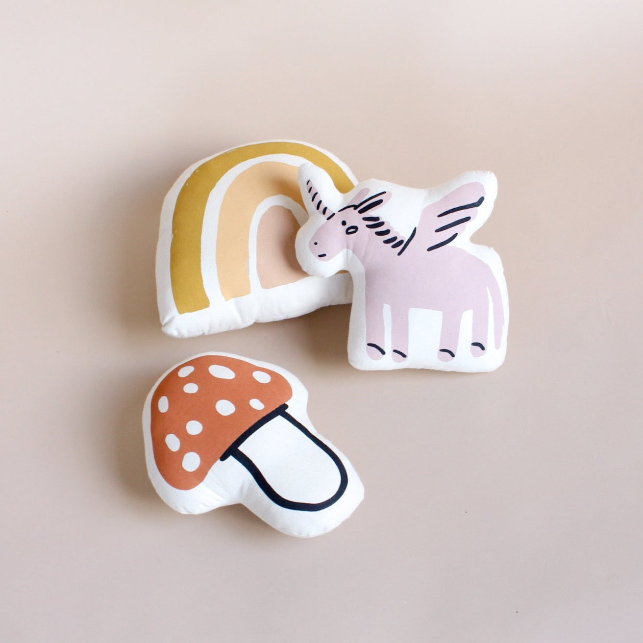 Mushroom Pillow sewn and screen printed by hand on natural canvas by local artisans.