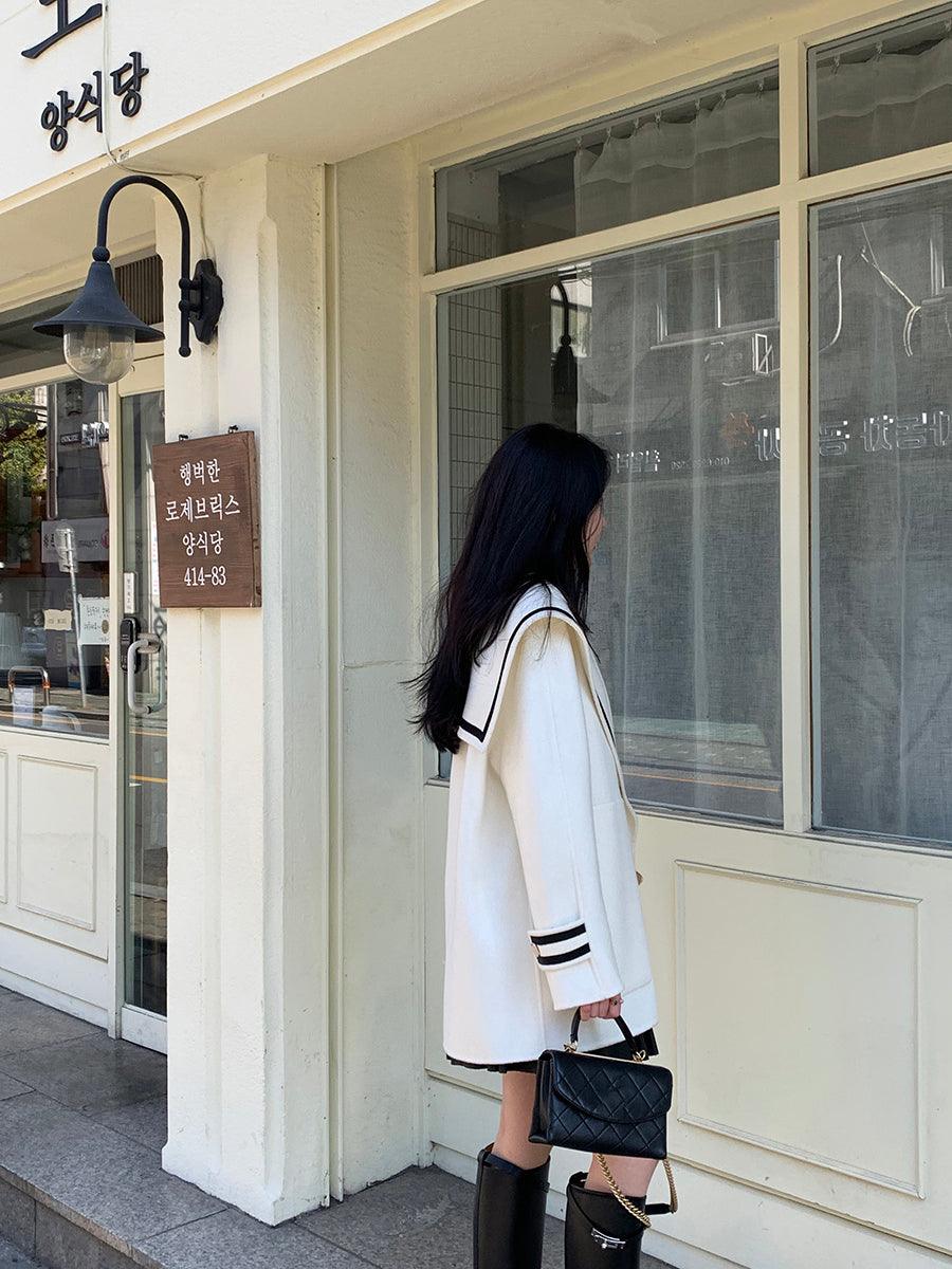 Navy Collar Double Breasted Oversized Woolen Jacket