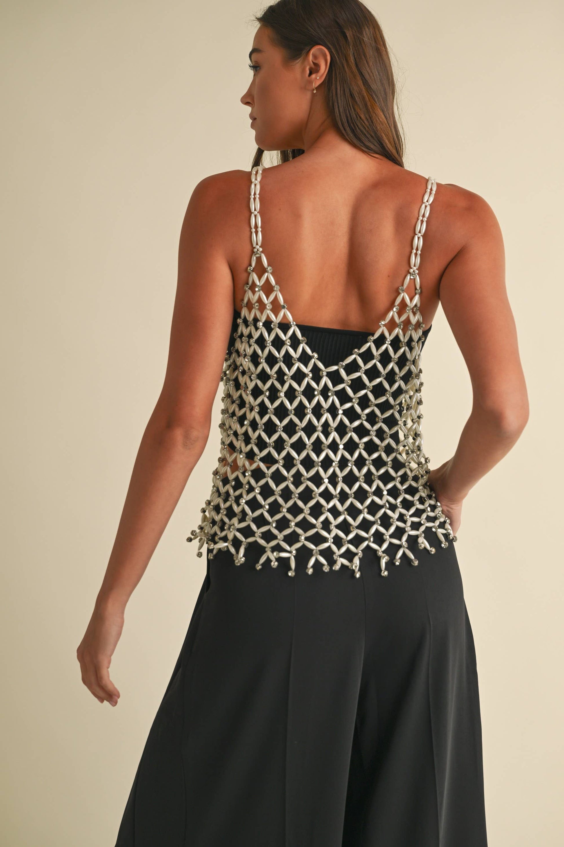This beautiful and delicate piece showcases a net-like design with a scoop neckline, embellished with faux pearl beads and stud for a touch of elegance, the fixed straps ensure a secure fit. Perfect for layering