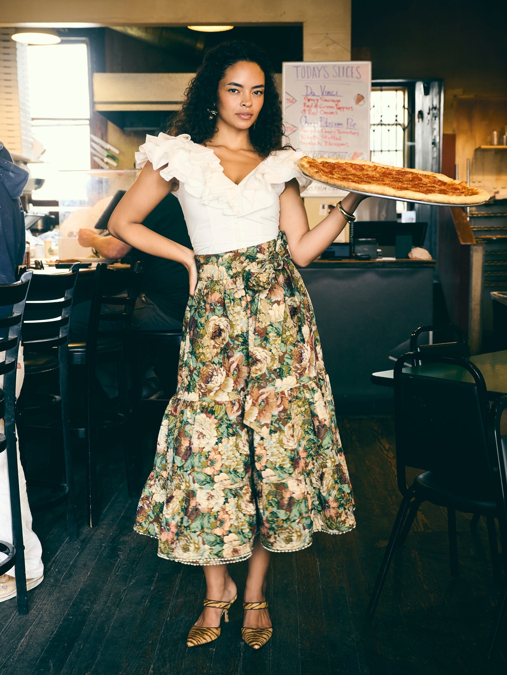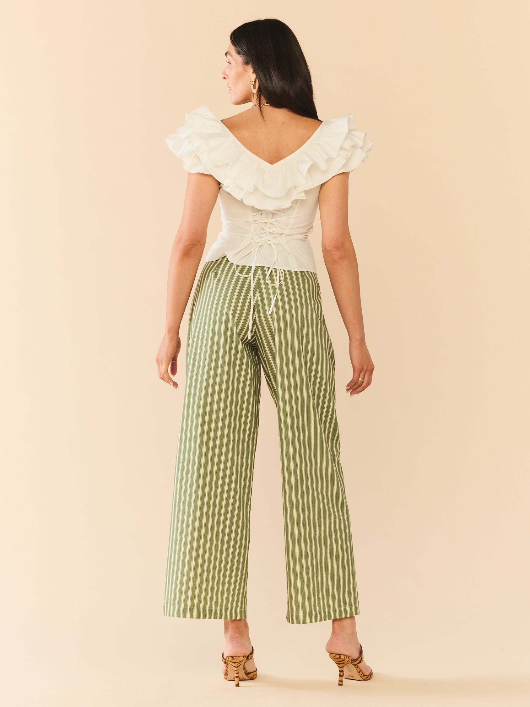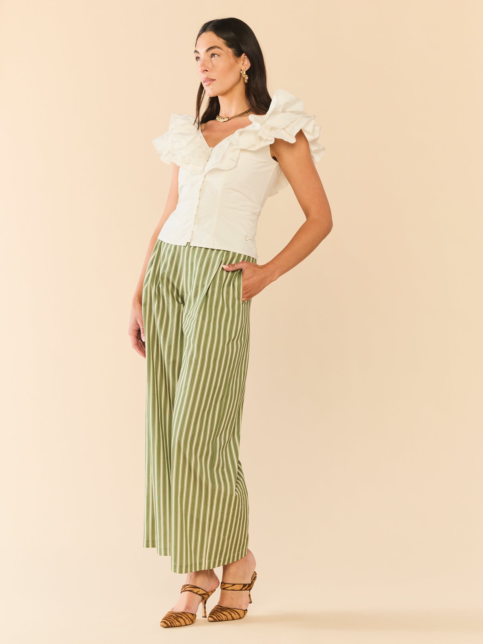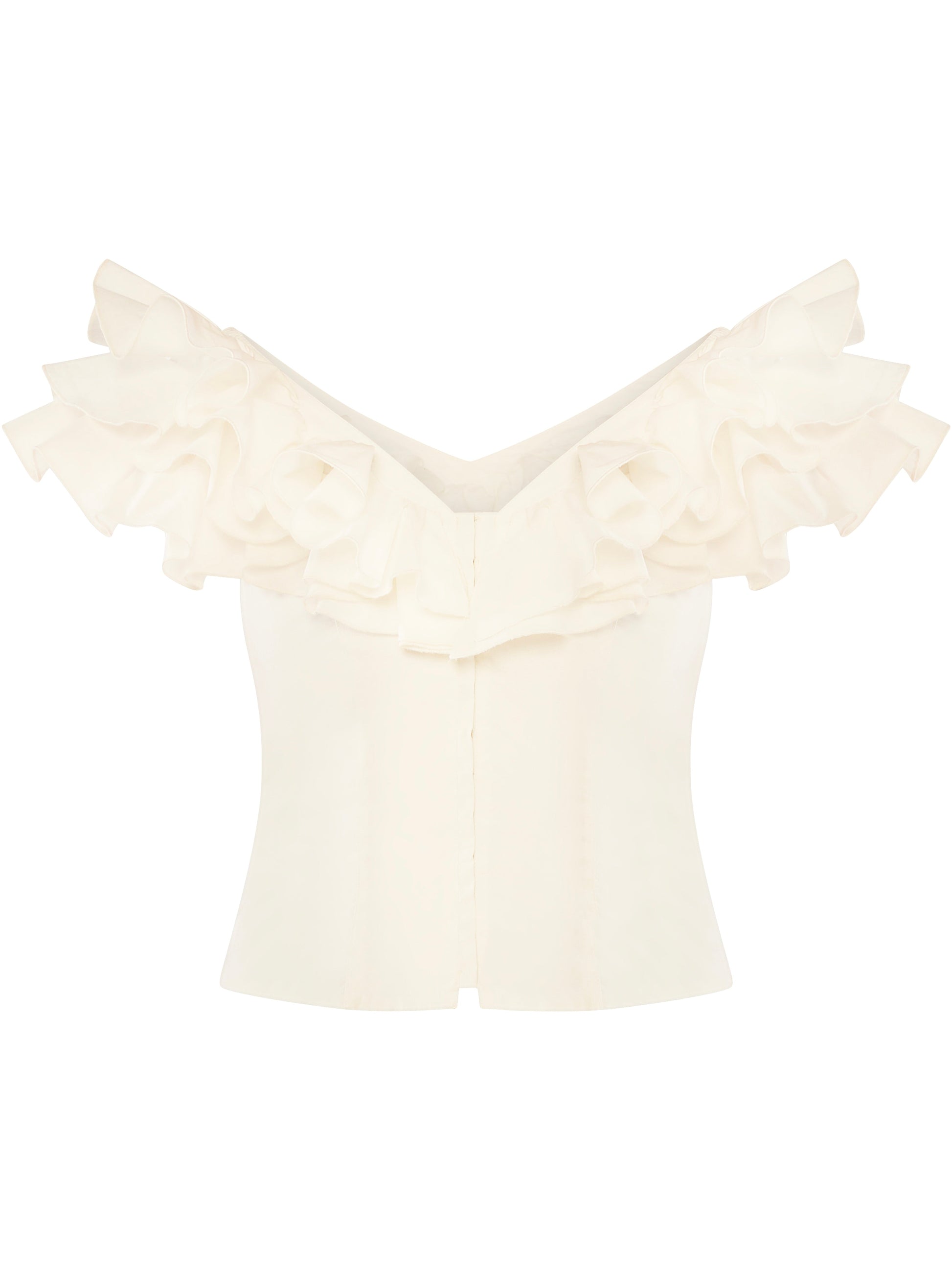 A little romance, a little drama, just the way we like it. This sculpted cotton top features cascading ruffles that frame the shoulders and neckline, a fitted bodice that flatters every curve, and a subtle front closure for an easy, polished finish.