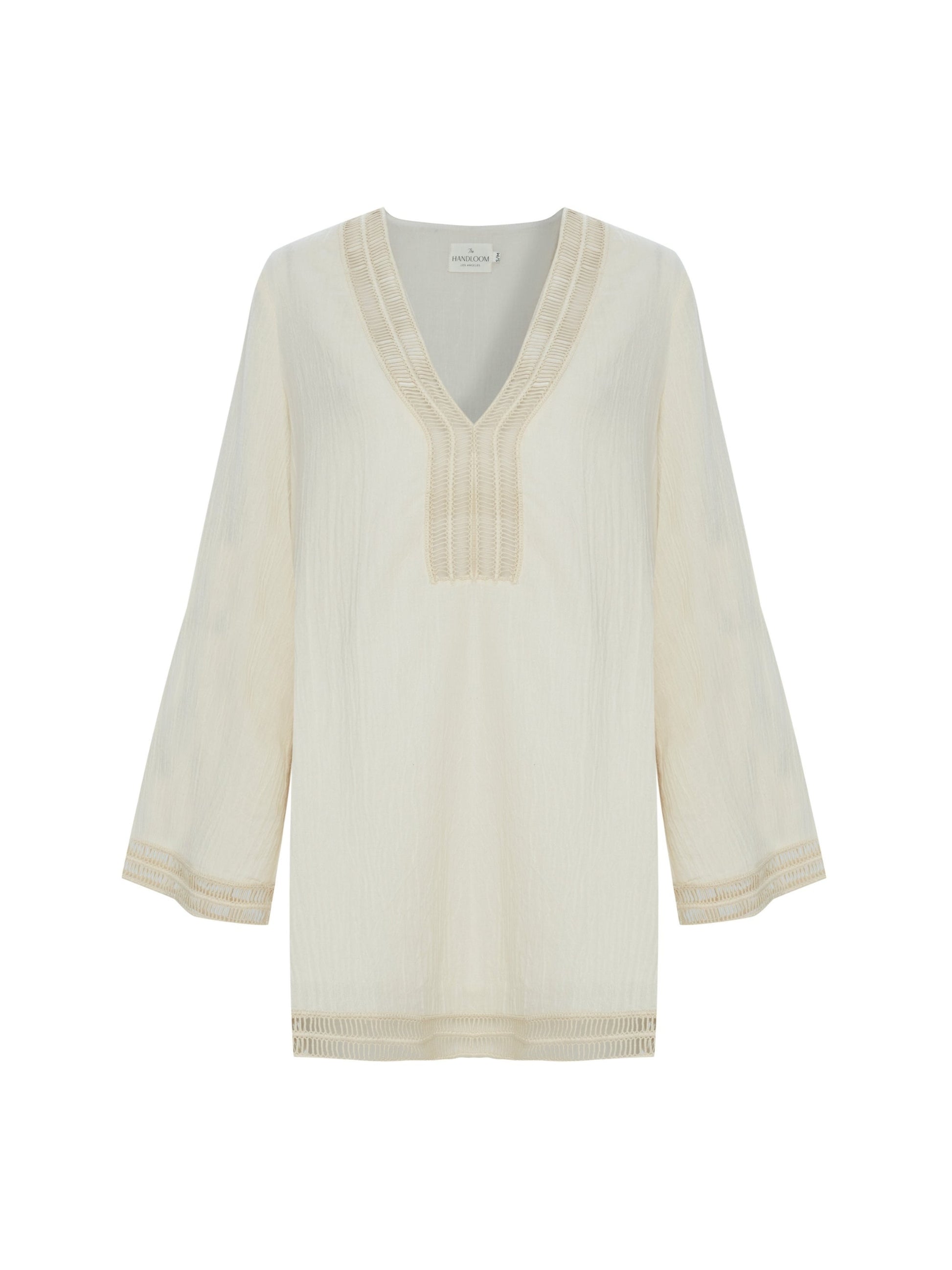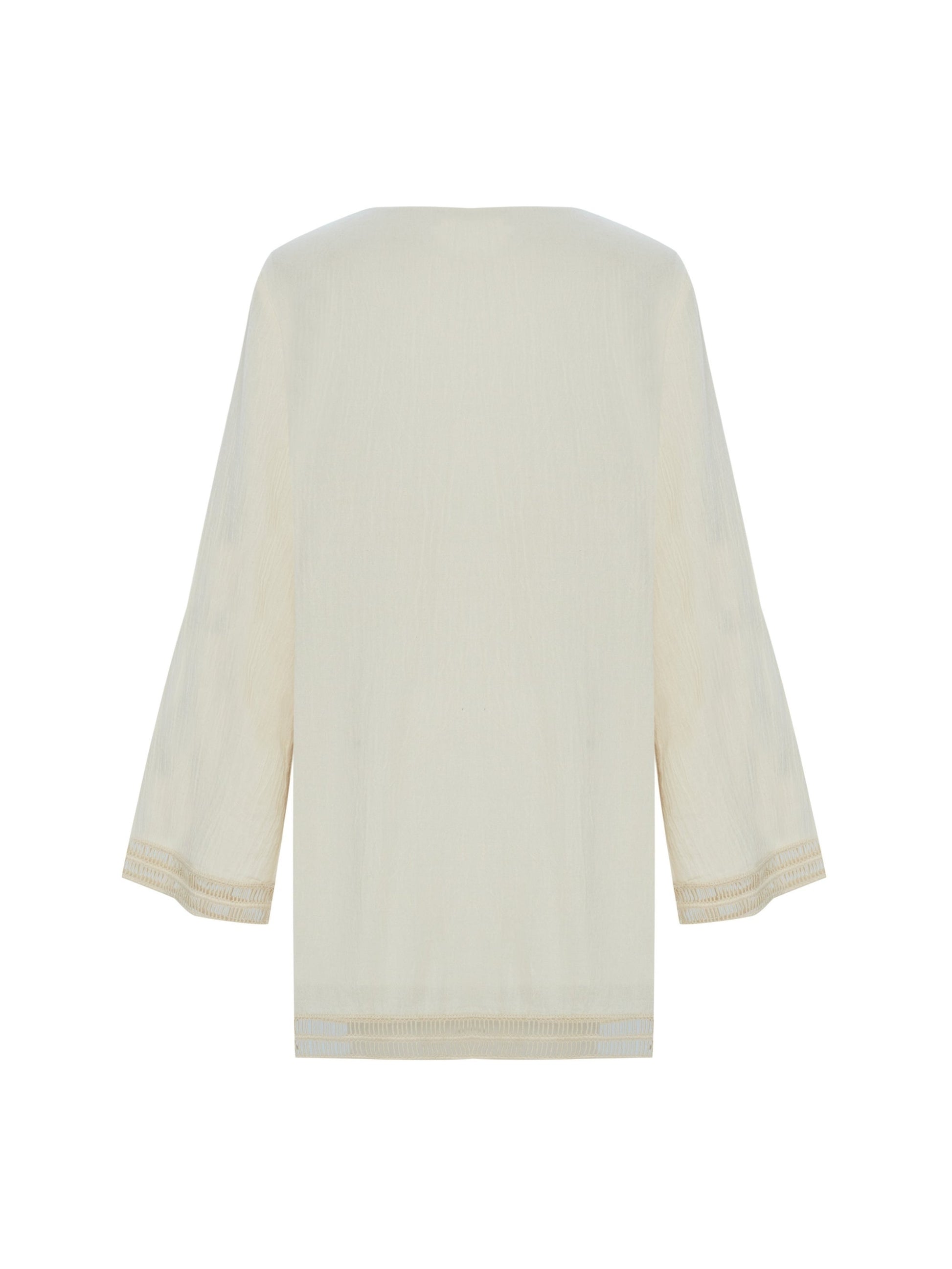 Elevate your style with this versatile garment. The plunging neckline and open, breezy silhouette offer relaxed elegance, while lace at the neckline, cuffs, and the bottom of the skirt adds a romantic touch. Lined throughout, it effortlessly transitions from a beach cover-up to a stylish evening choice.