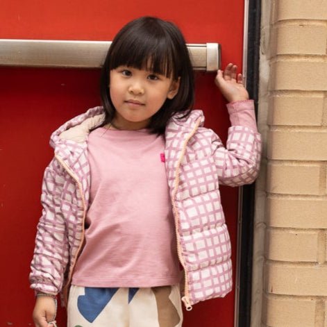 Made for chilly mornings and big adventures, our Pink Grid Puffer is warm, lightweight, and made entirely from 100% recycled polyester. With a cozy hood, full zip, and pockets for tiny treasures, it’s the perfect layer for back to school and beyond.