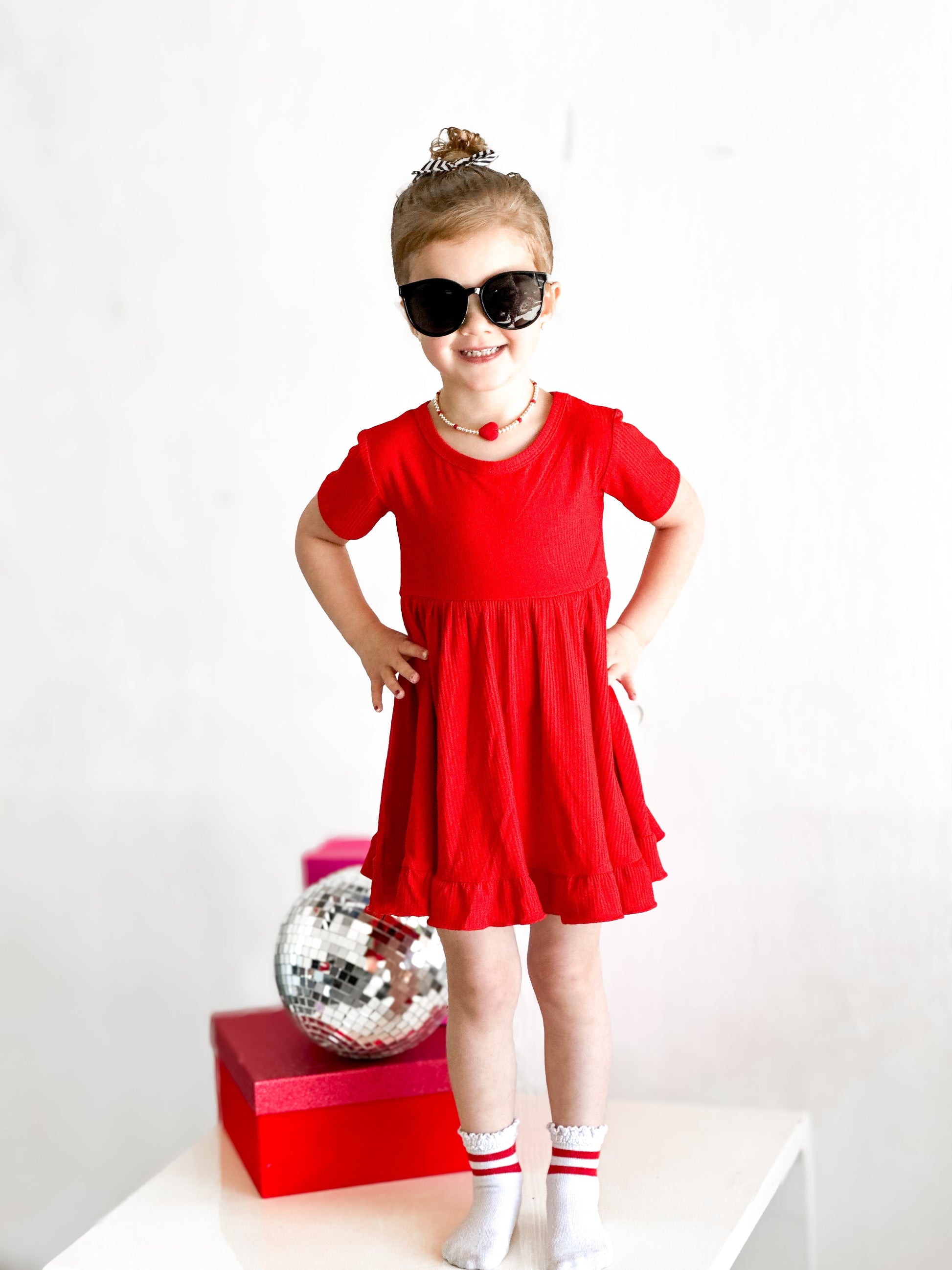 Add some flounce to her wardrobe with our Red Rib Dream Ruffle Dress. This comfortable and fun dress for girls features short sleeves and a playful ruffle design, perfect for any occasion. Made with red rib material, it's sure to become a favorite in her closet.