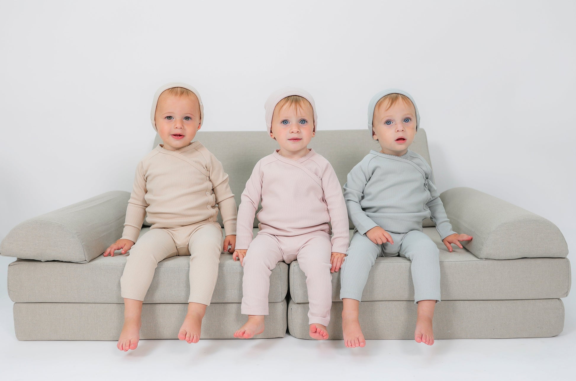 Baby ribbed wrap top with side snap opening. Matching leggings with covered elastic folded waistband , open feet from size 12 months and matching hat. ֲ